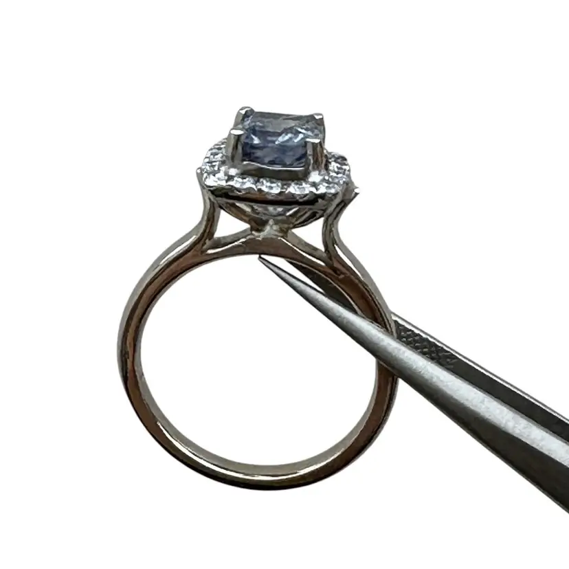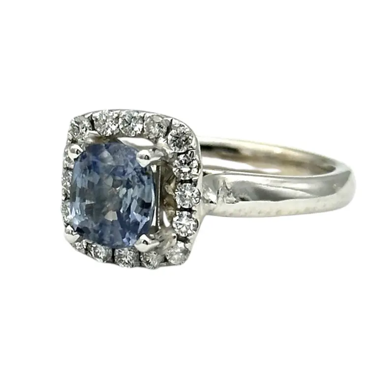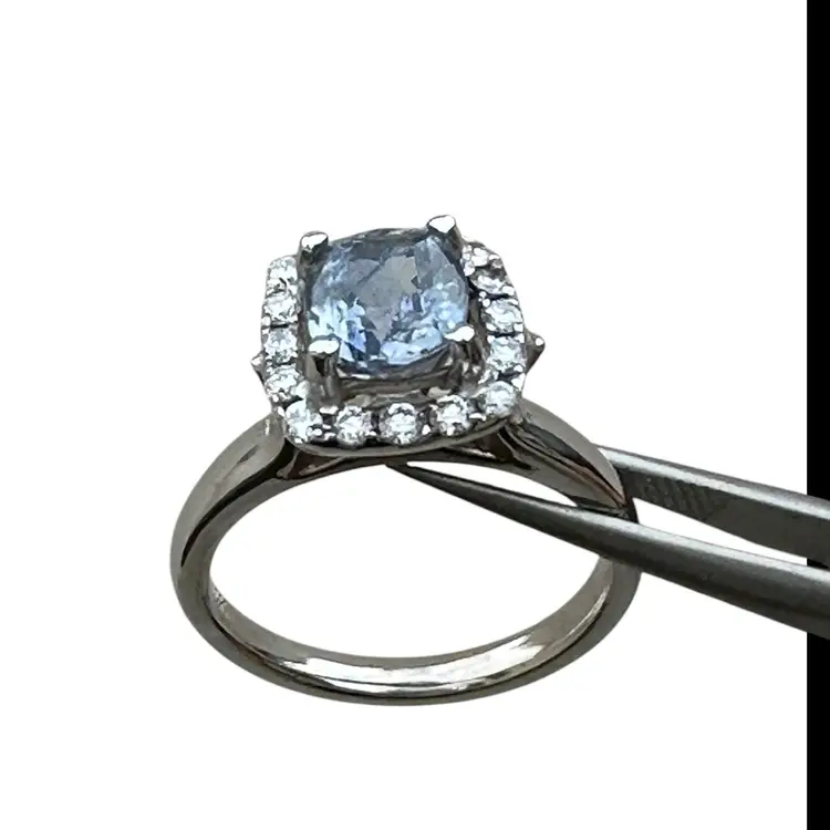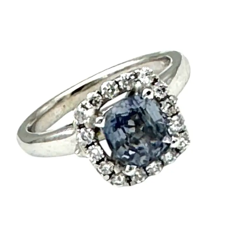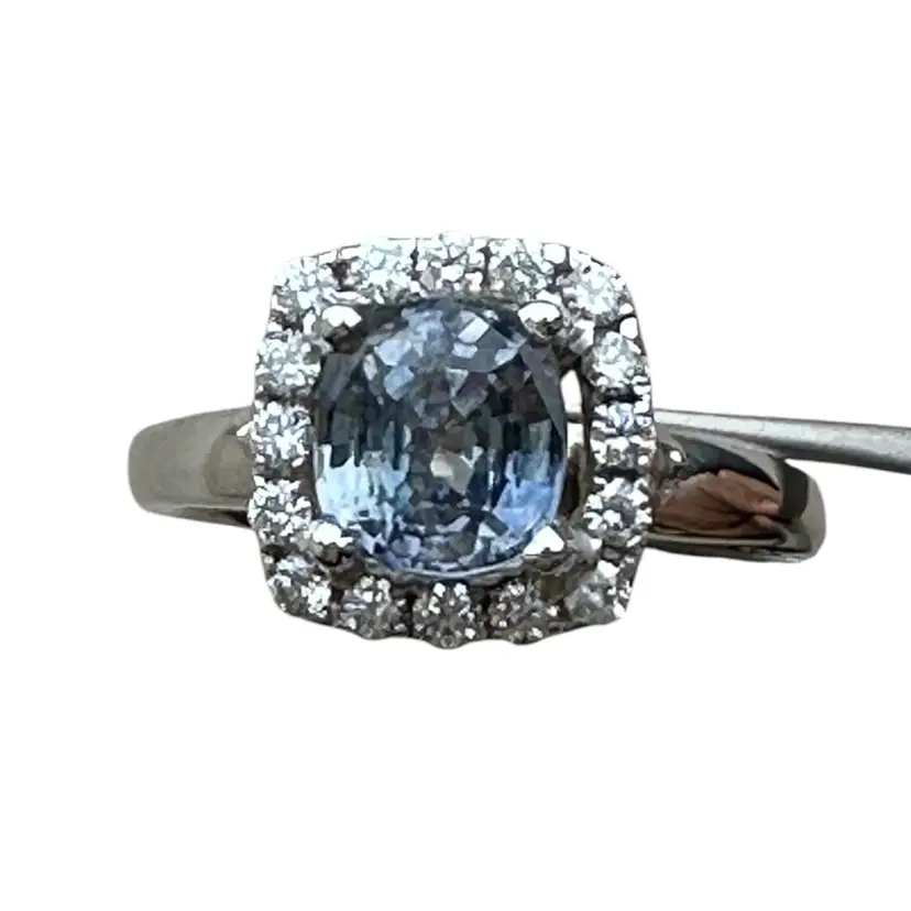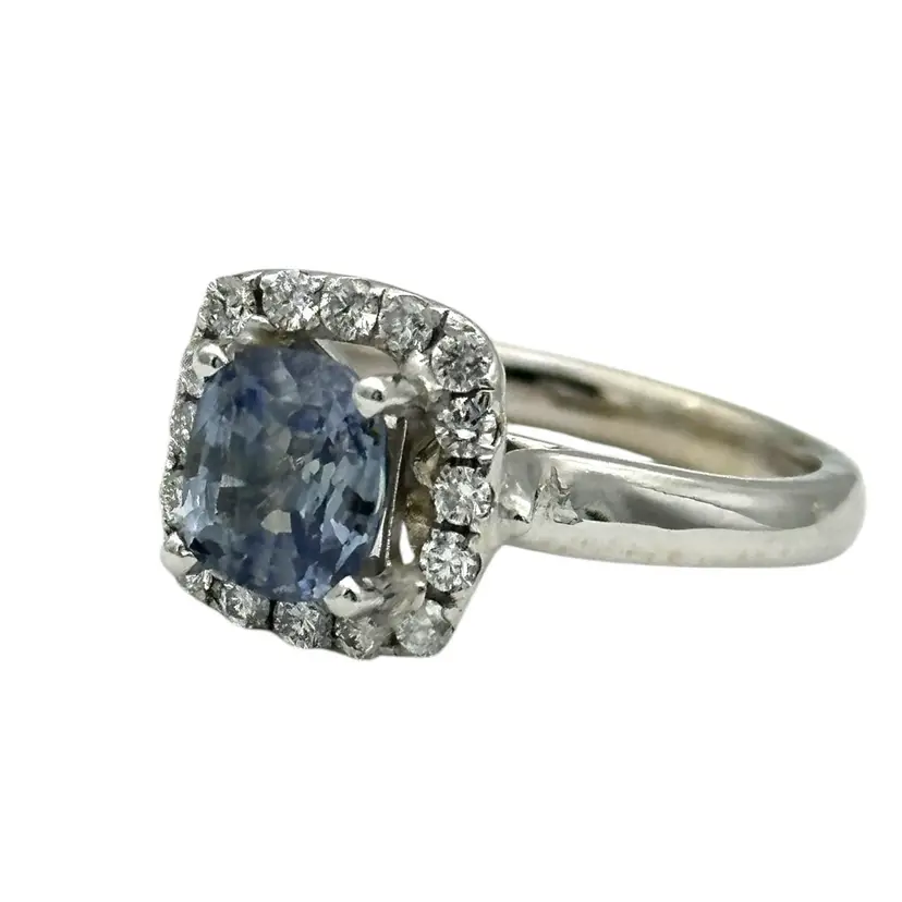 14 karat ring consist of a cushion cut blue sapphire, measuring 2.48 carats. The sapphire stone measures 6.7 mm. And is surrounded by 16 round brilliant diamonds. The total carat diamond weight is .40 with a quality of SI-1and color G The weight of the ring is 5.84grams The ring finger size is 6.75, the halo measures 10.7 mm. The shank measures 2.3 mm wide.
