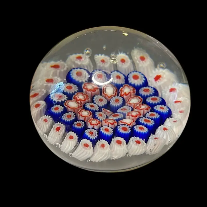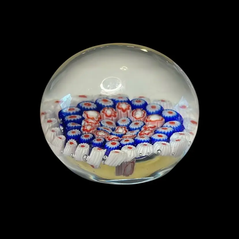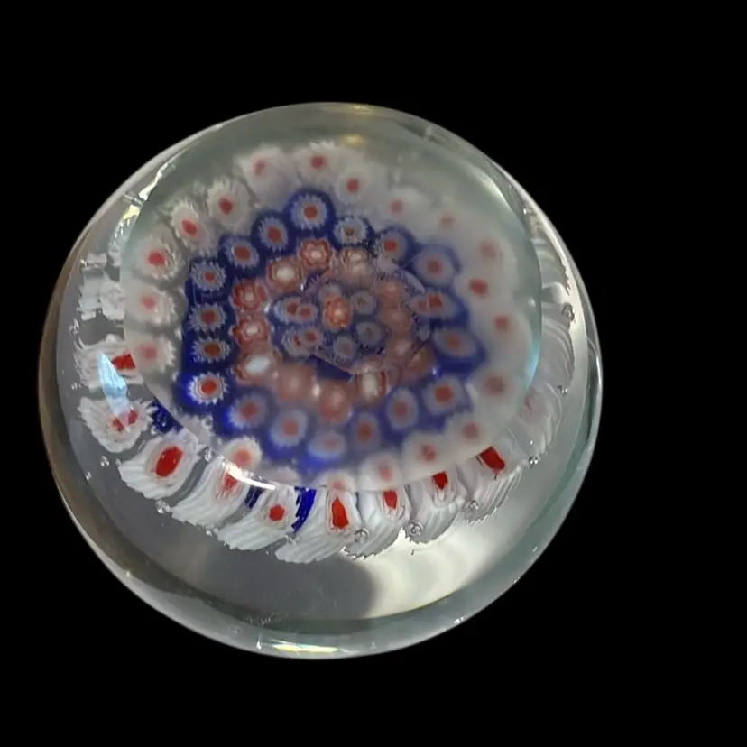 14. Vintage Hand Blown Millefiori Glass Paperweight Red Blue White 2-1/2” Tall