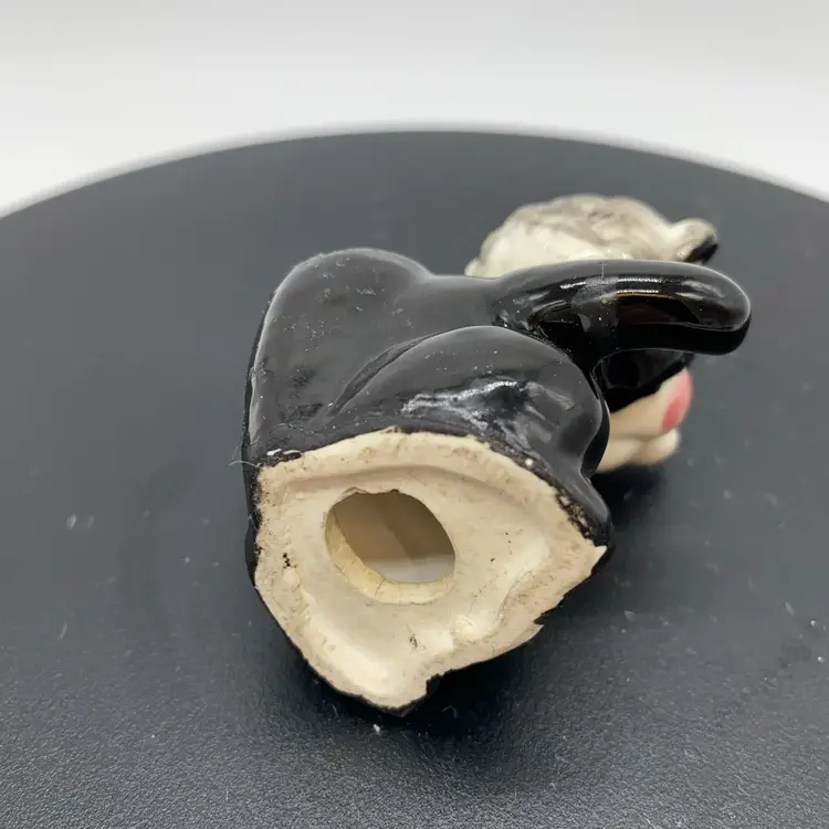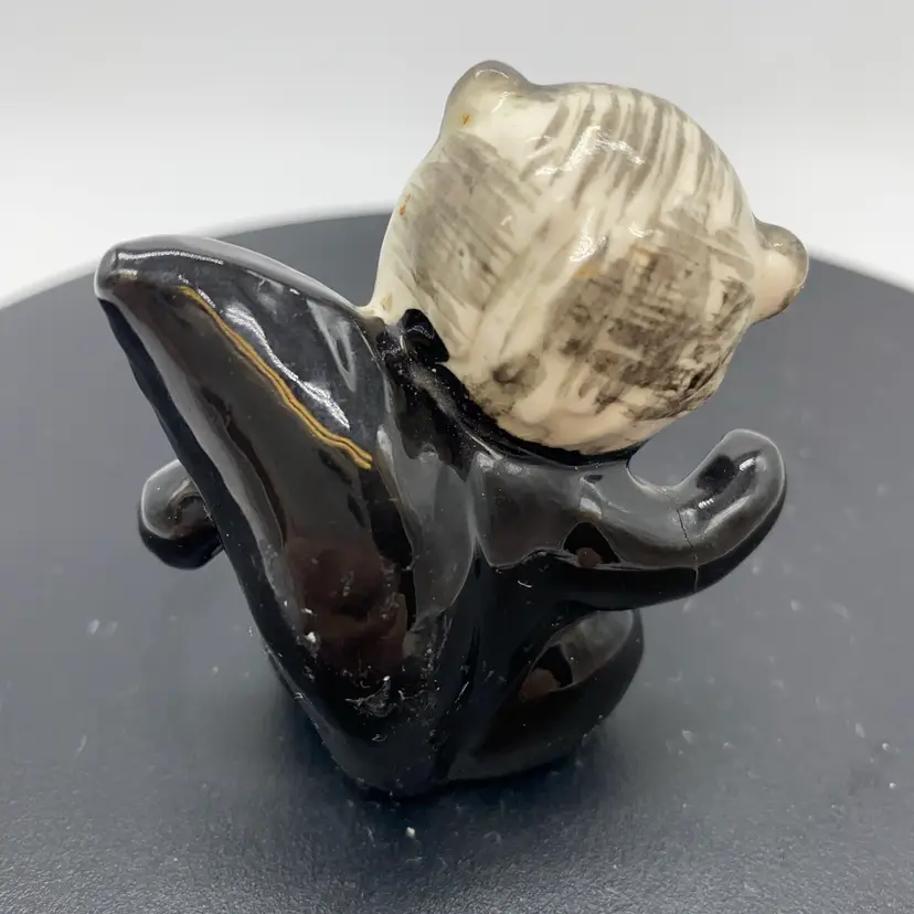 Ceramic figurines, particularly those depicting animals with anthropomorphic qualities, gained significant popularity in the mid-20th century. These items were often produced as decorative pieces for homes or as novelty souvenirs. Many were manufactured in Japan during the post-war era, known for their mass production of affordable and charming ceramic collectibles. The style of this skunk, with its stylized features and glossy finish, is characteristic of this period.