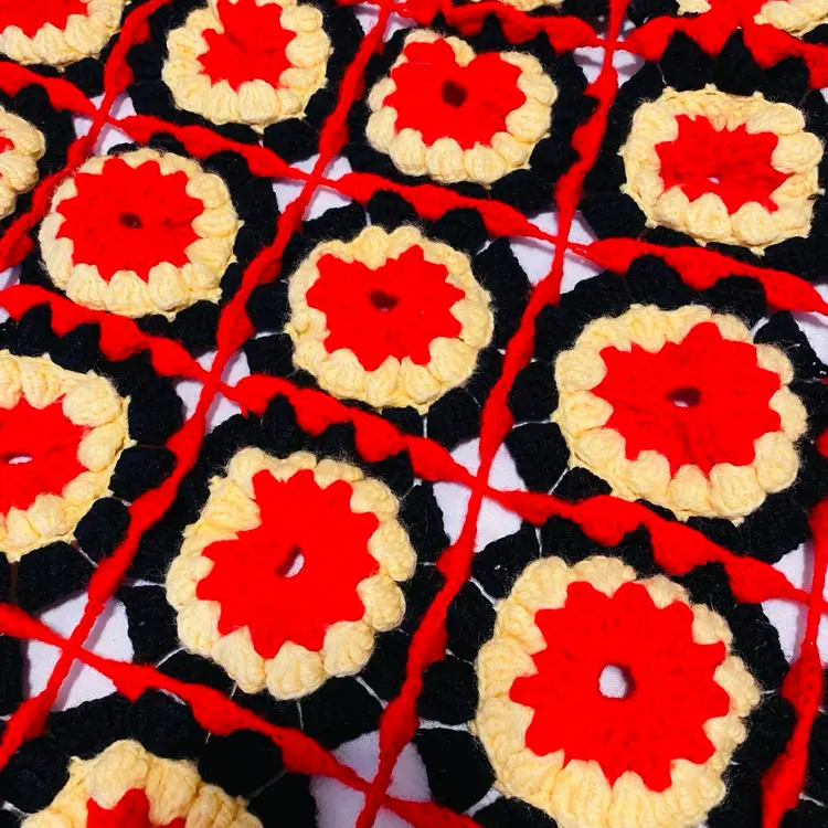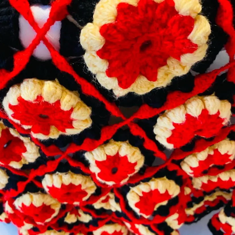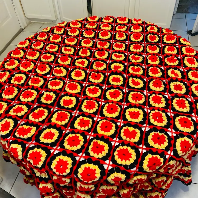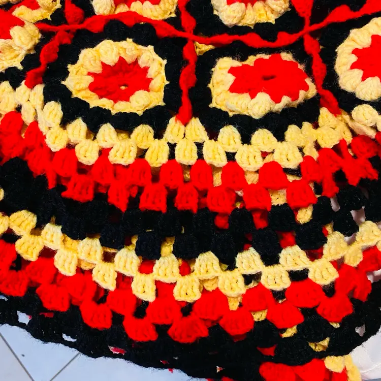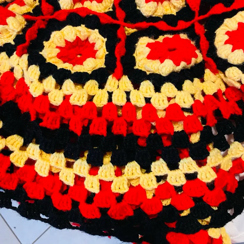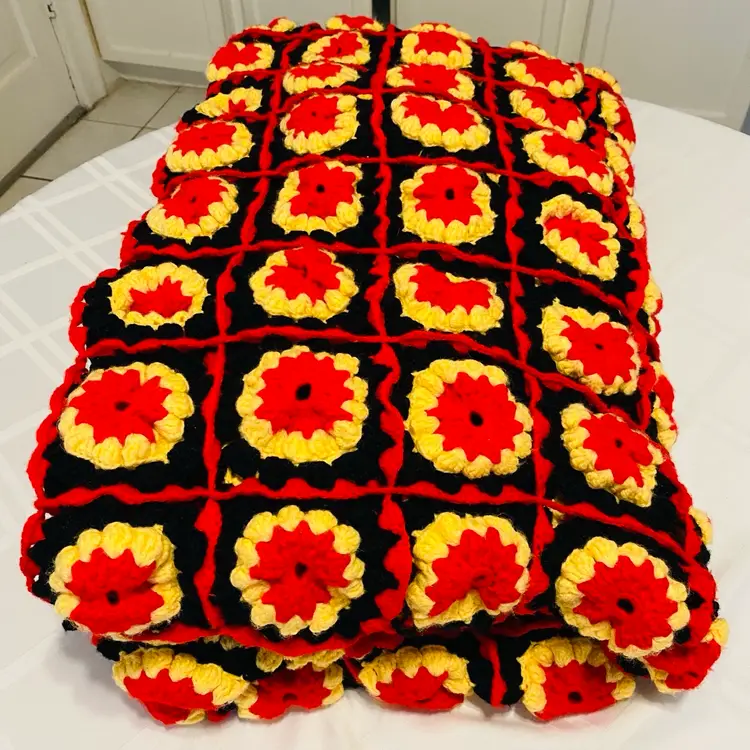 Black Yellow Red large soft wool crochet work of art! Measures 94 x 70 inches for the central part and a border of 8 inches added all the way around outside as a frill. (So add 16 inches to both dimensions as there is a border each side).