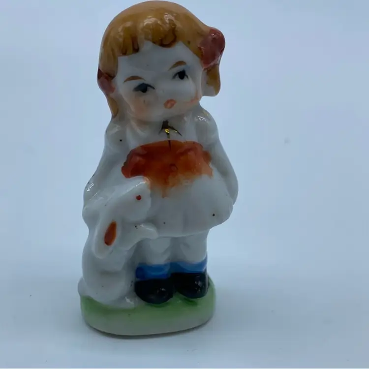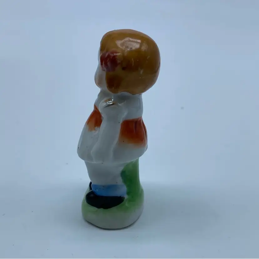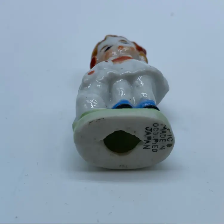 These porcelain figurines, often depicting children, animals, or traditional scenes, were mass-produced for export and are characterized by their delicate craftsmanship and often whimsical aesthetic. Many feature hand-painted details and a glossy glaze, making them appealing decorative items. The "Occupied Japan" mark, usually stamped on the bottom, signifies their origin and period, adding to their collectible value. 2” tall no chips or cracks.