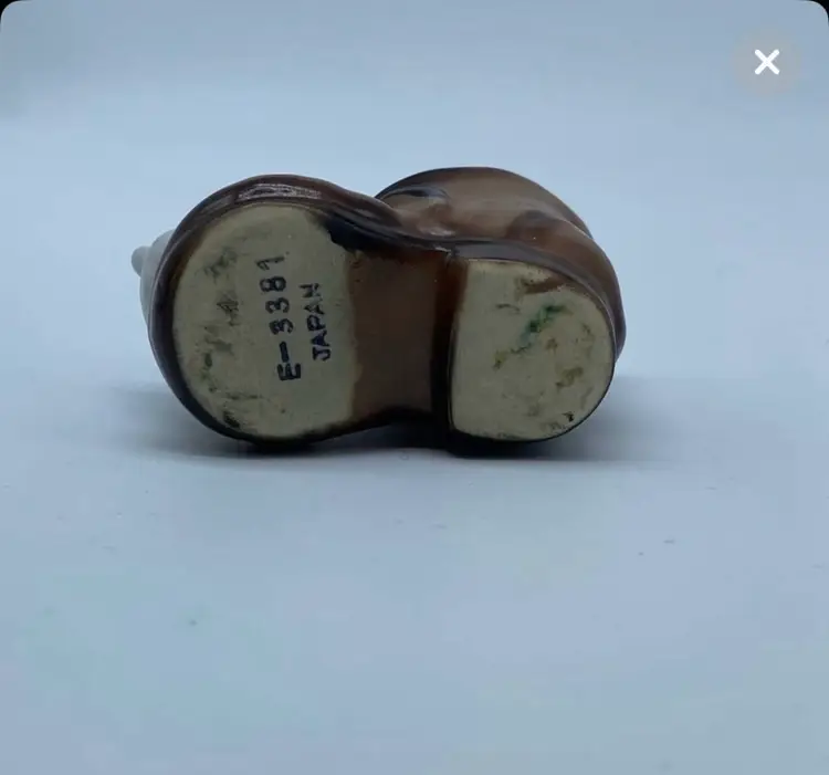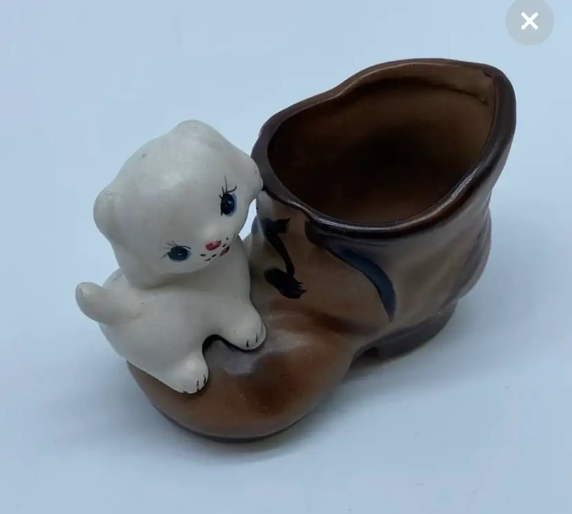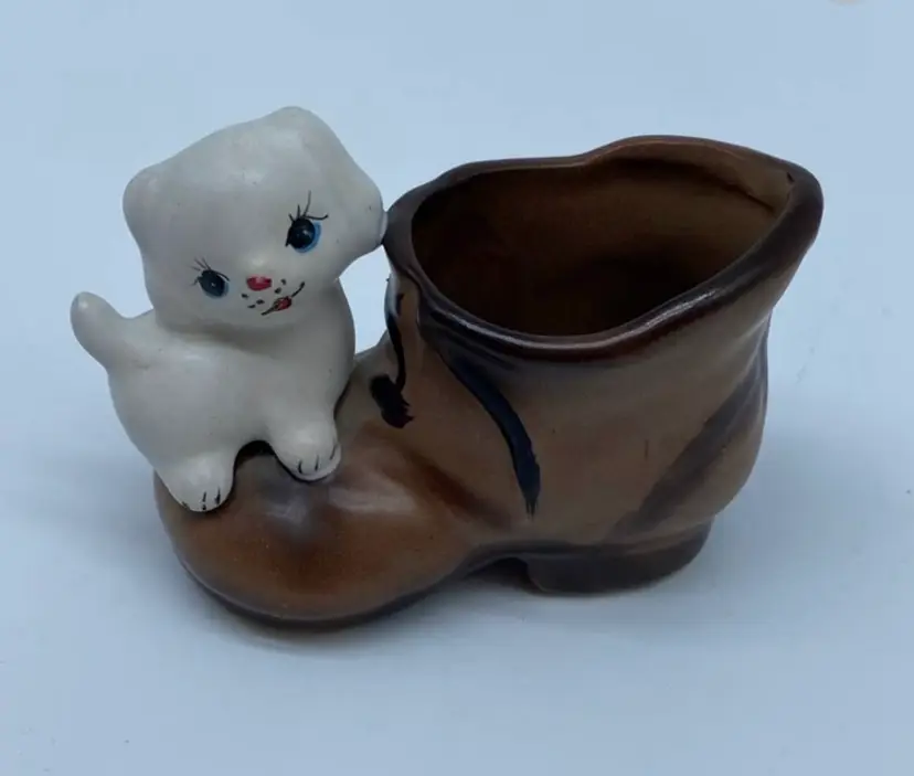 Enesco, a well-known giftware company, has a long history of distributing and sometimes manufacturing decorative items, including ceramic figurines. Pieces like this puppy on a boot were common in the mid-20th century, appealing to a wide audience with their cute and nostalgic aesthetic. Such figurines are often sought after by collectors who appreciate the craftsmanship and the sentimental value associated with them.