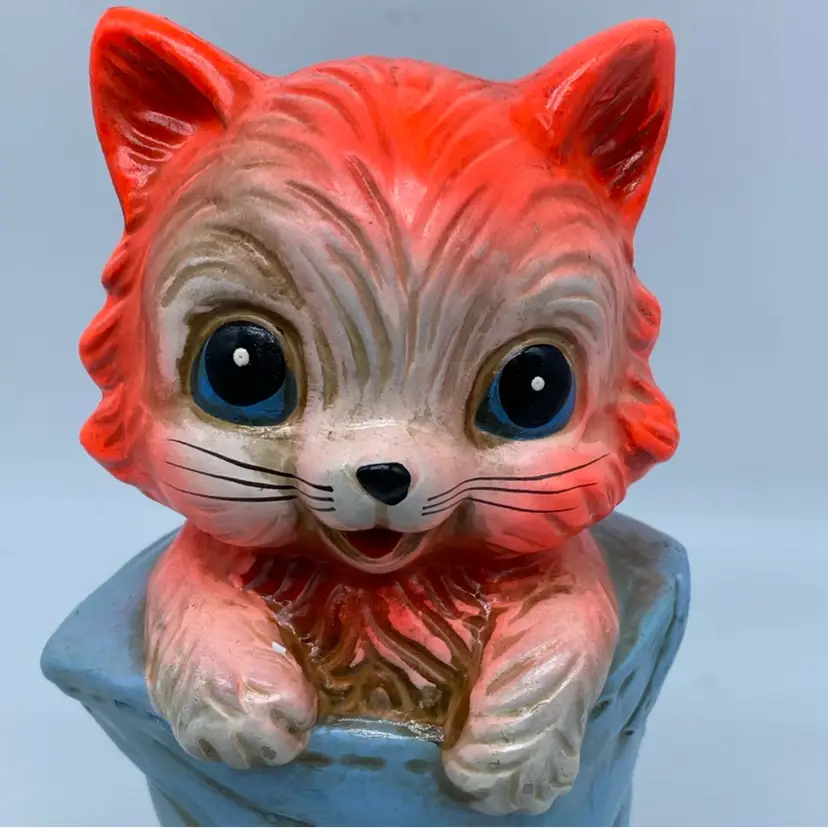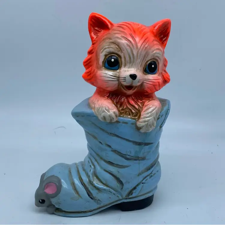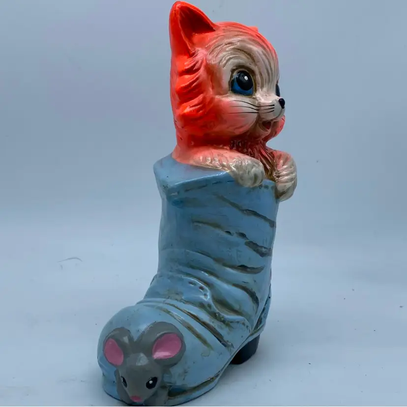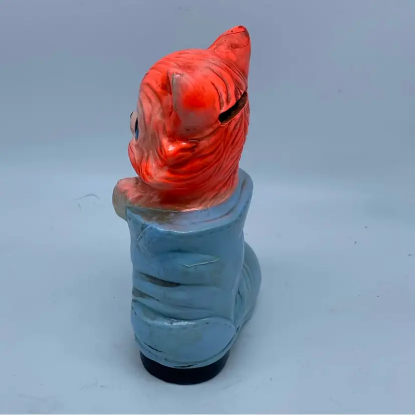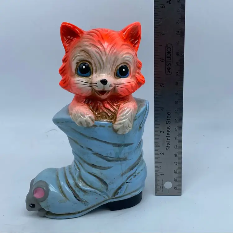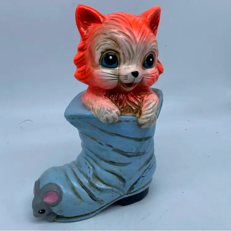 7” Tall, Puss in Boot, No chips or cracks. Ceramic piggy banks, particularly those featuring whimsical animal designs, gained significant popularity in the mid-20th century. Japan became a major exporter of such decorative and functional ceramics during this period, known for their detailed craftsmanship and often playful aesthetics.