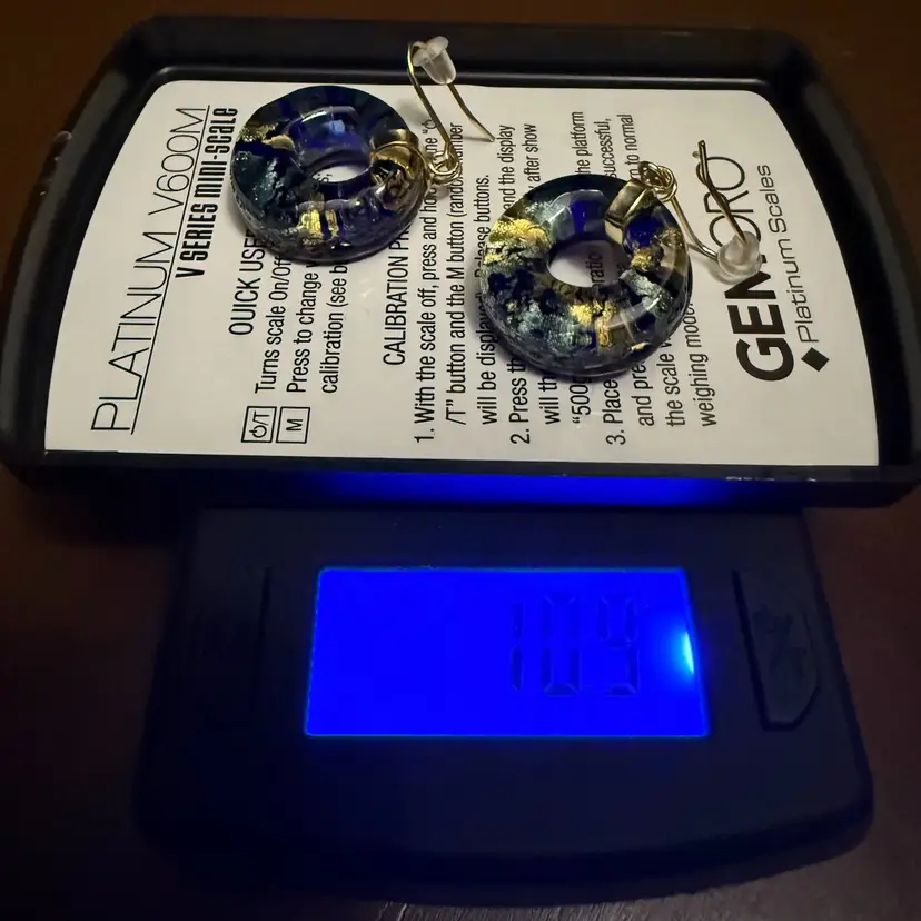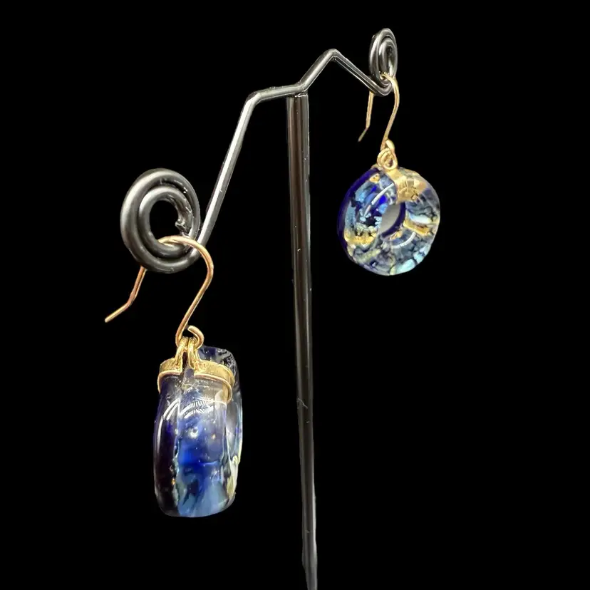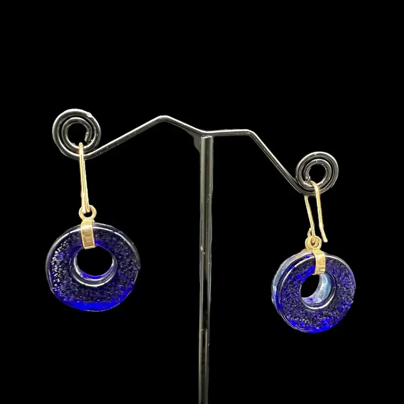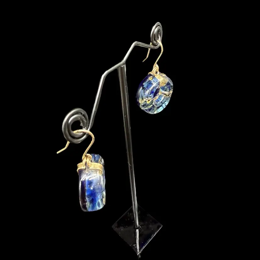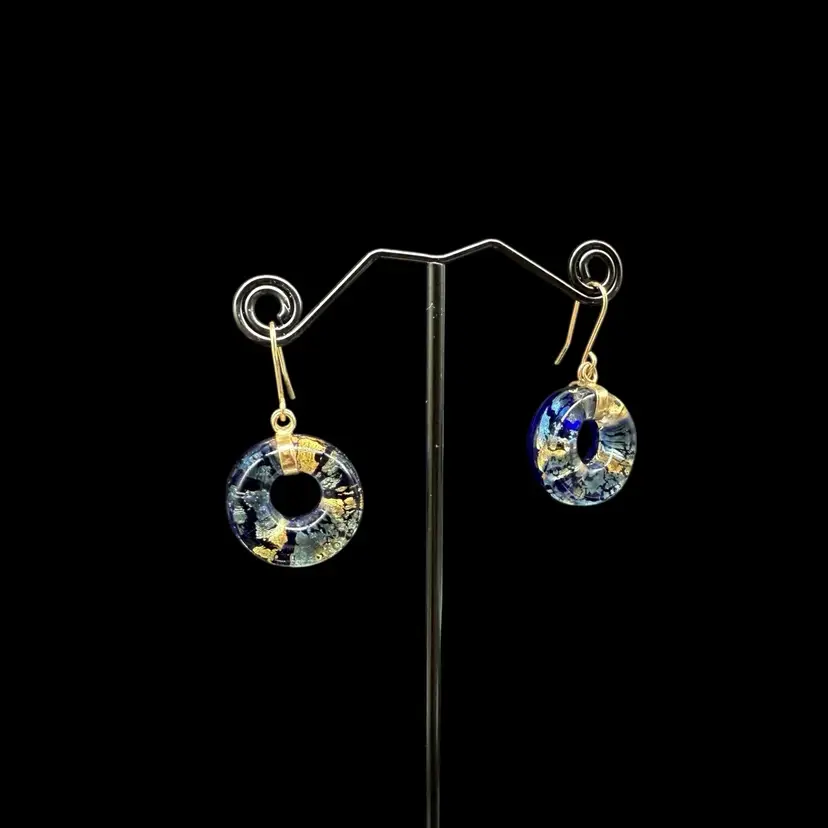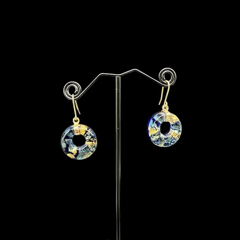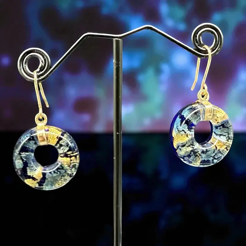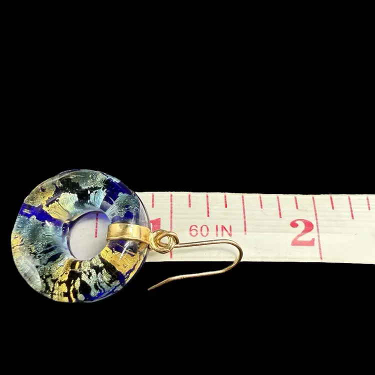 These 14k 585 Yellow Gold Dichroic Art Glass Murano Italy Pierced Dangle Earrings in Blue are a stunning example of fine jewelry from Italy. The earrings feature a multicolor blue & gold dichroic glass main stone in a round donut shape, set in yellow gold with a hook closure for easy wear. Perfect for everyday or all occasions, these earrings add a touch of beauty and artistry to any outfit, reflecting a metallic and fashionable design that is sure to make a statement.