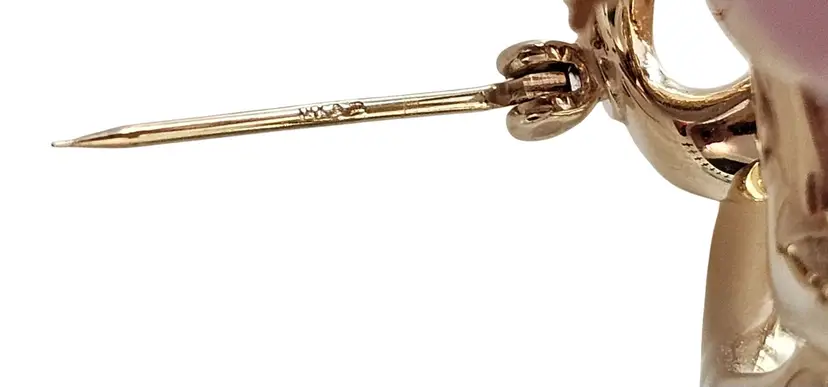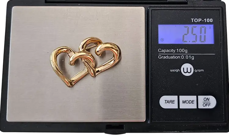 • 14K Yellow Gold Two Hearts Pin Brooch • Crafted from solid 14K Yellow Gold • Entwined hearts figural • Openwork puffy hearts brooch • Polished finish • It measures approximately 1.45 inches in width and 0.88 inches in length • This stunning pin weighs 2.5 grams • The straight pin is marked 14K, affirming its gold content • It has a secure locking pin at the back that functions properly • Good condition • C254