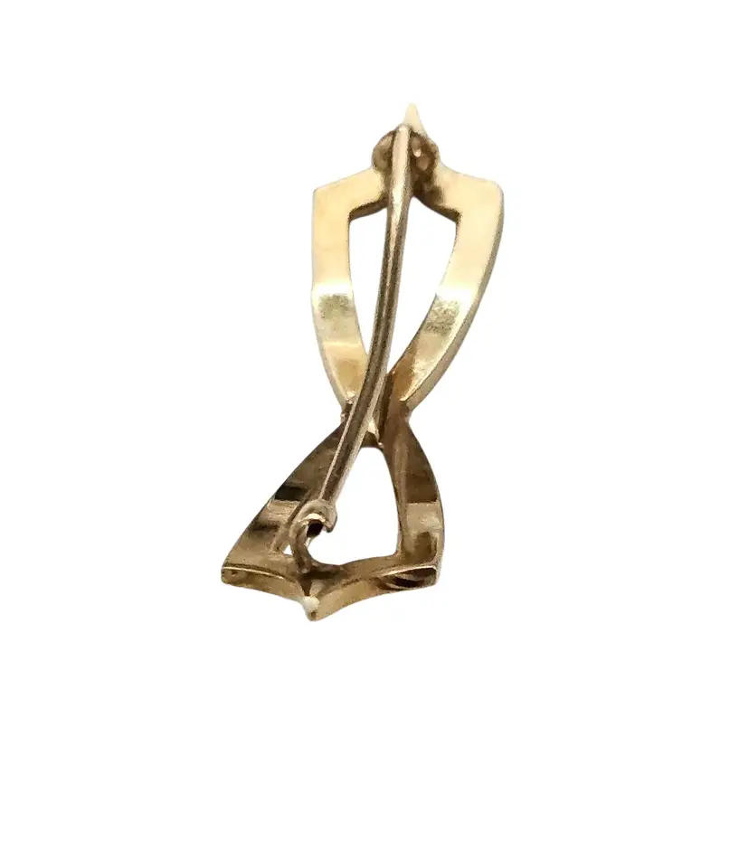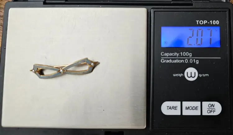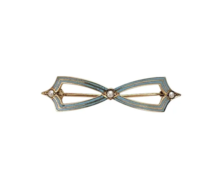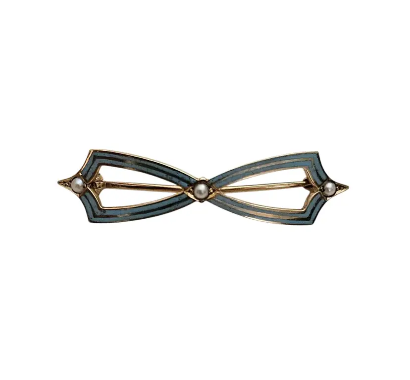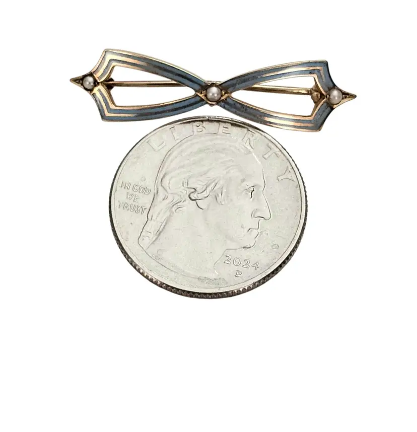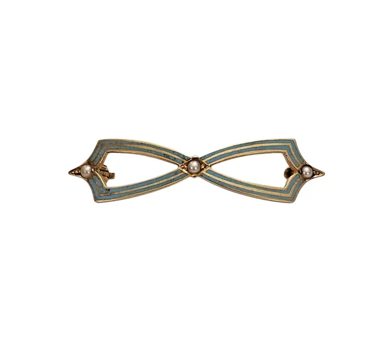14K Yellow Gold Victorian Bow Brooch Blue Enamel, Pearls Pin C-Clasp C287