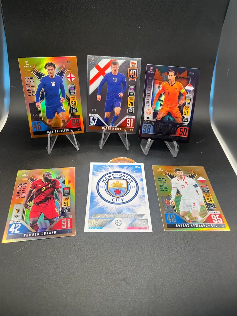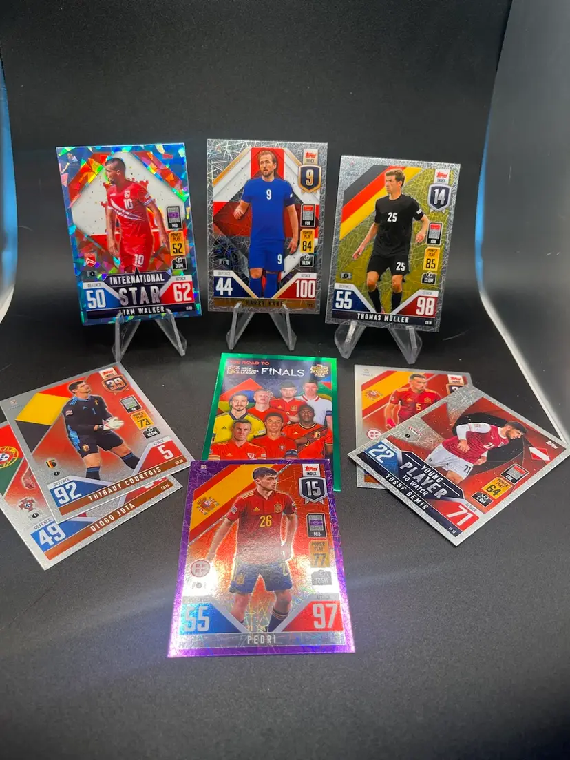 This is a 15-card lot from Topps Soccer Match Attax. Gold limited edition, silver ice, purple, sapphire, etc. Pedri purple has dinged corners.