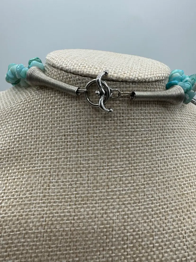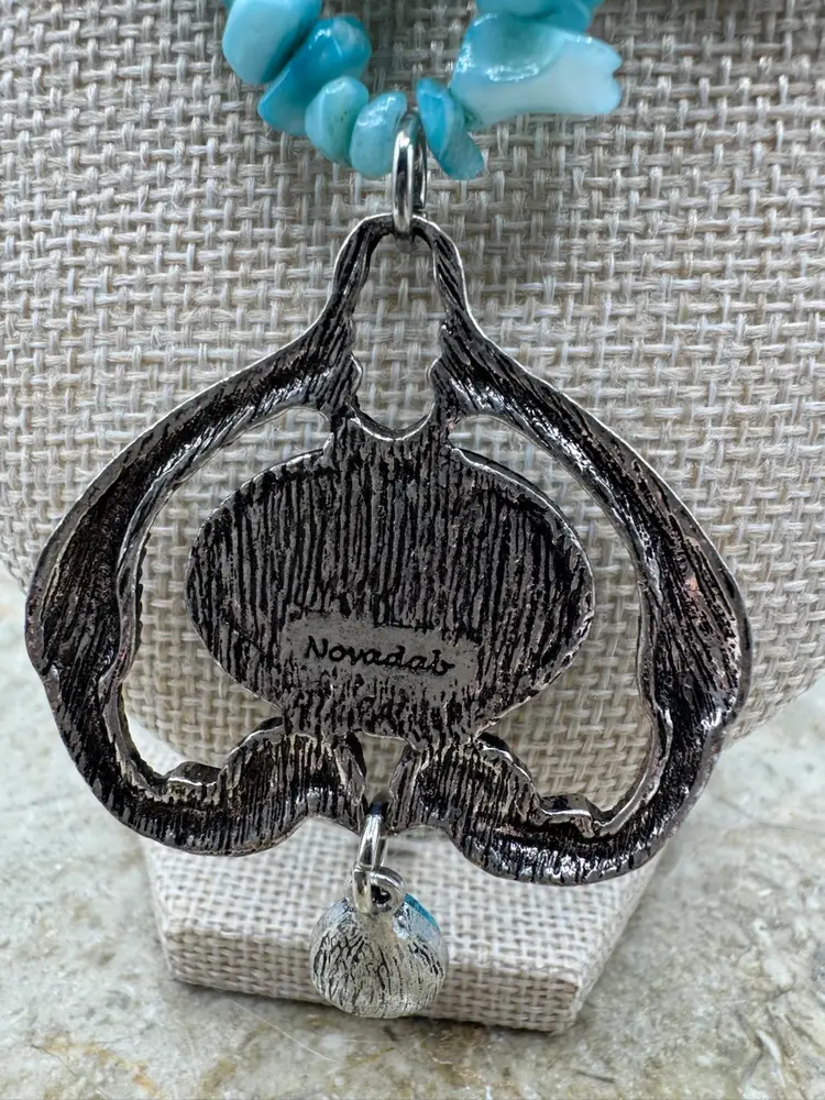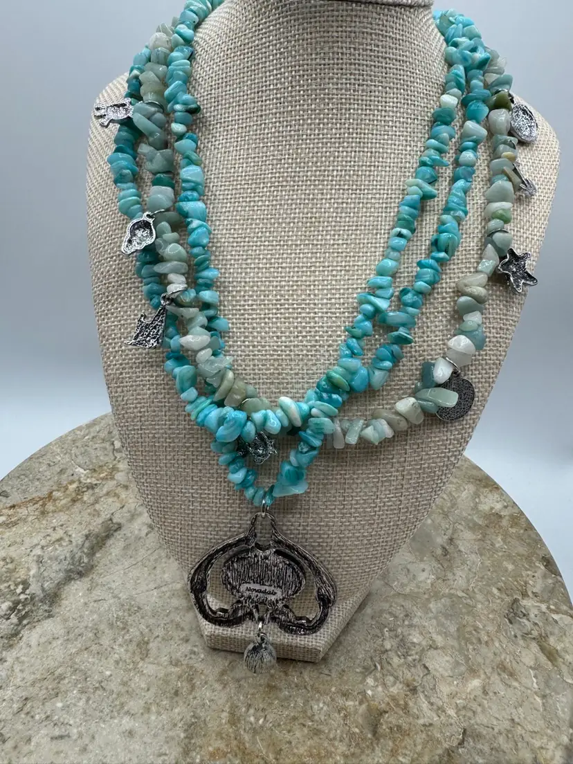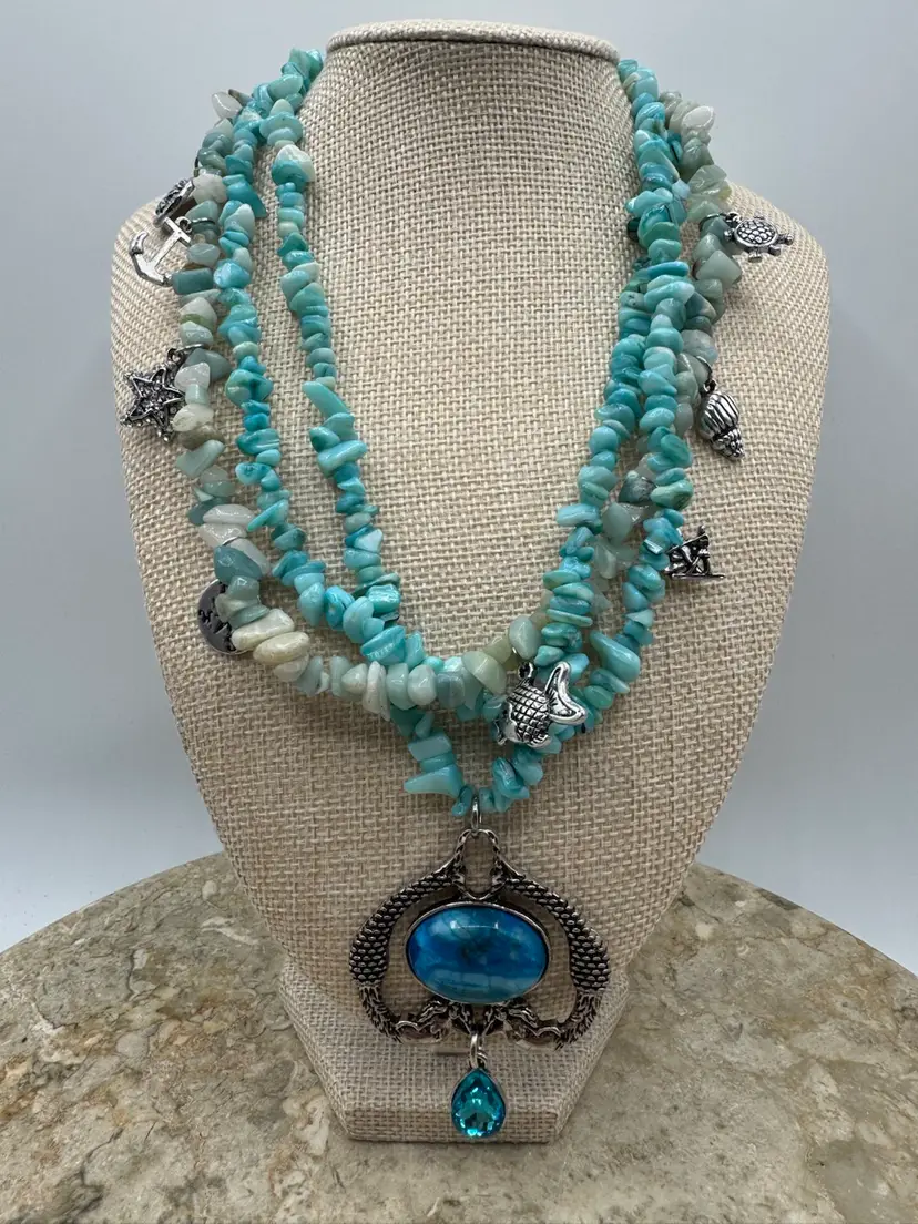 This amazing necklace with two kissing mermaids and awesome charms. Pendant has natural agate stone & three strands of blue stones. It also has a drop glass gemstone. Excellent like new condition. Measures 18”. With toggle clasp.