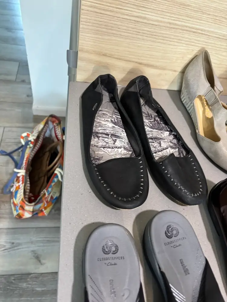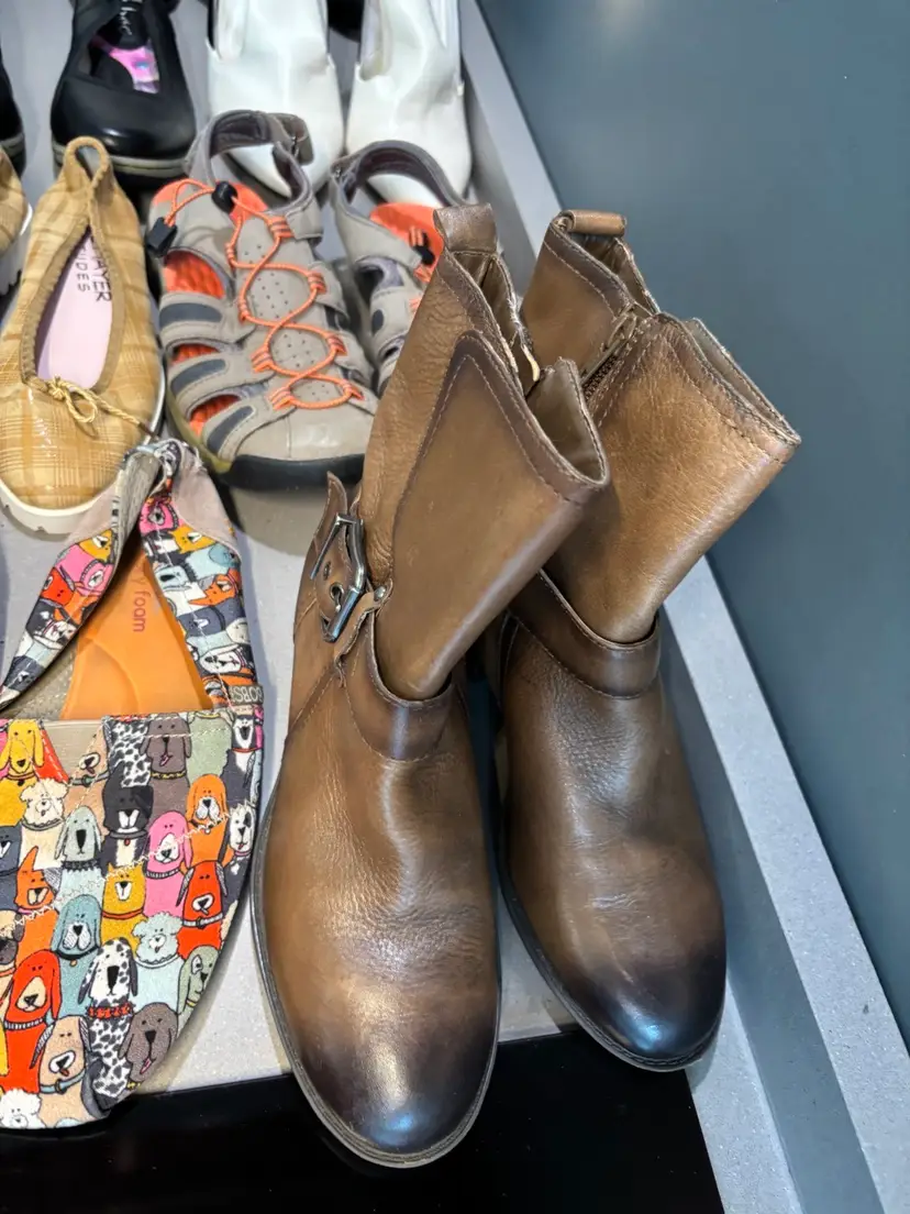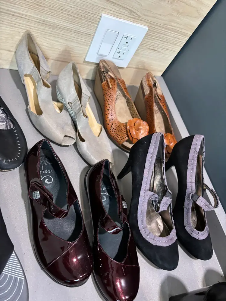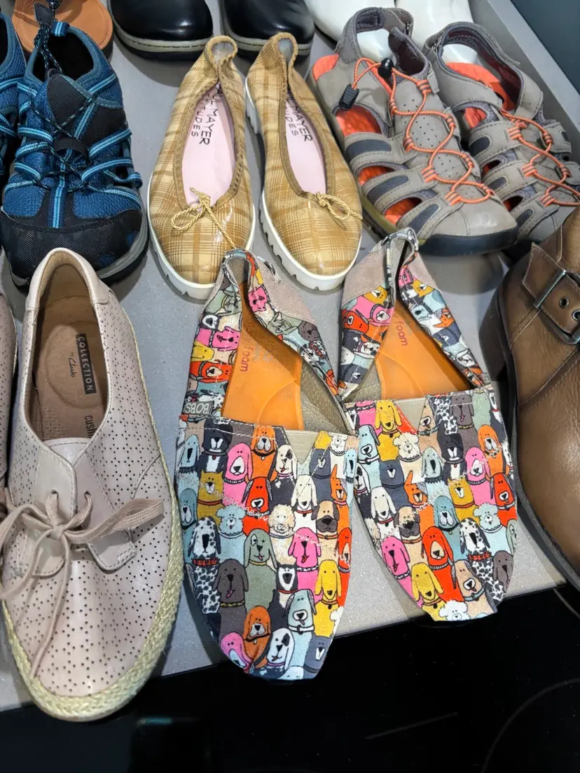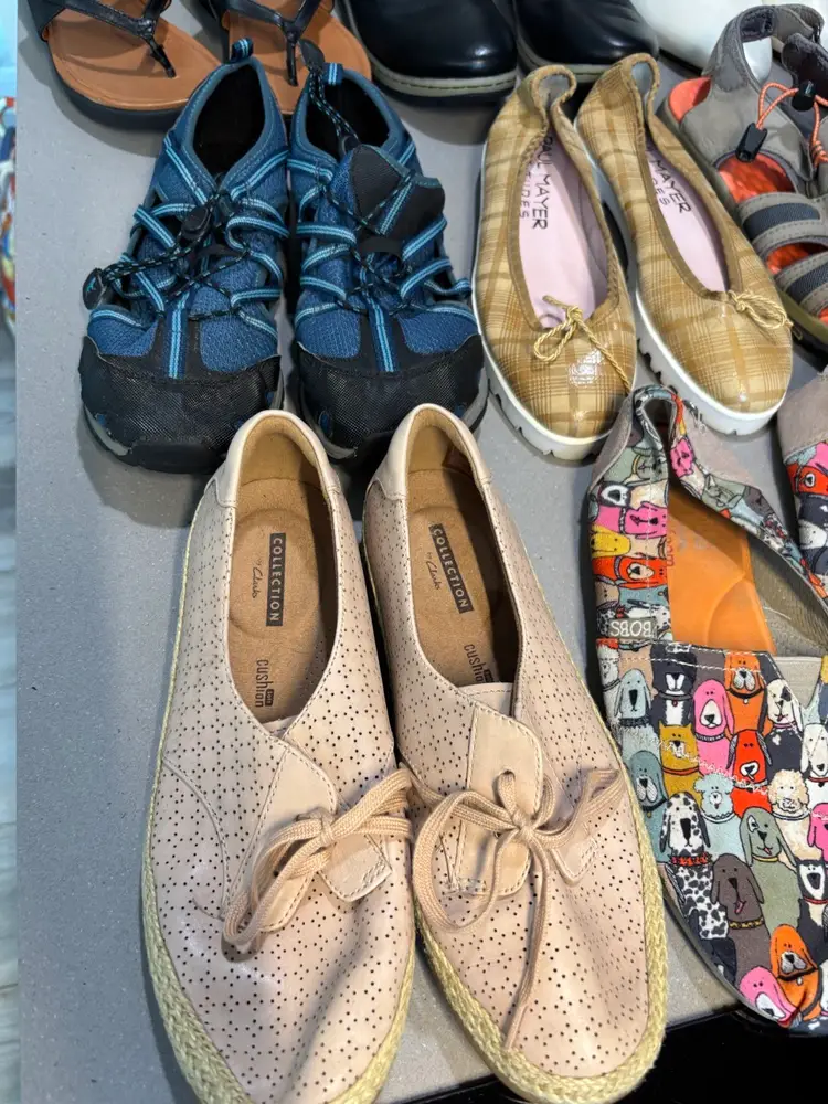3 pairs of Clarks,1 chacos, 1 Bobs, 1 Paul Mayer, 1 Arturo Chiang,1 fit flop, 1 BOC, 1 BCBG Max Azaria, 1 Danko, 1 Biden, 1 cushe (I think that’s what it says), 1 Brunate, 1 Pikolinos. ships from the East Coast of North Carolina