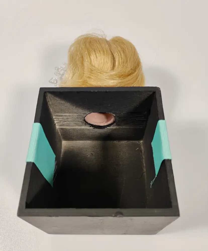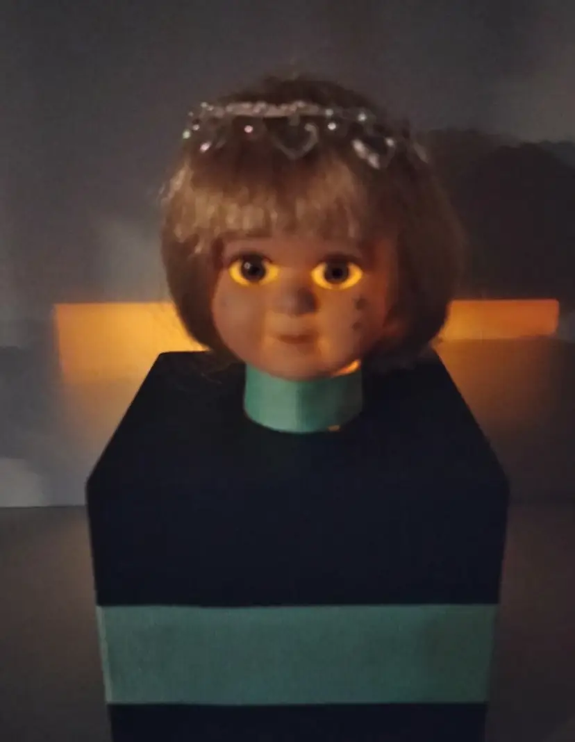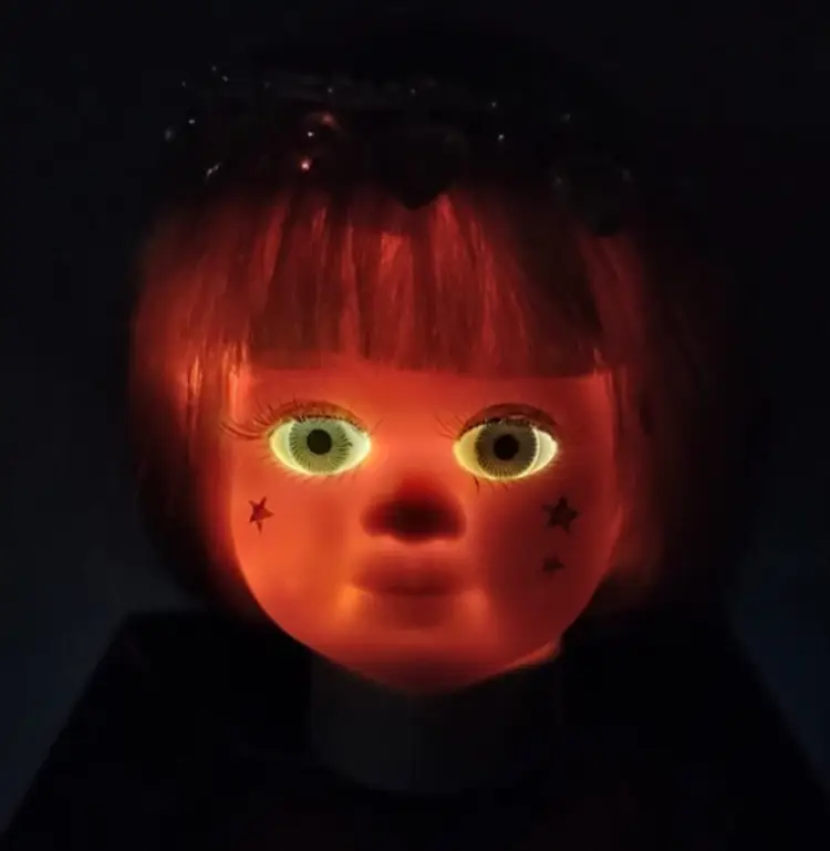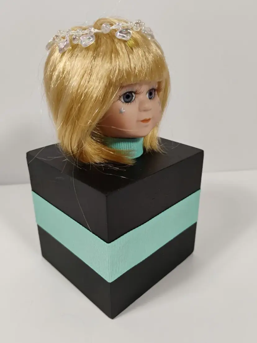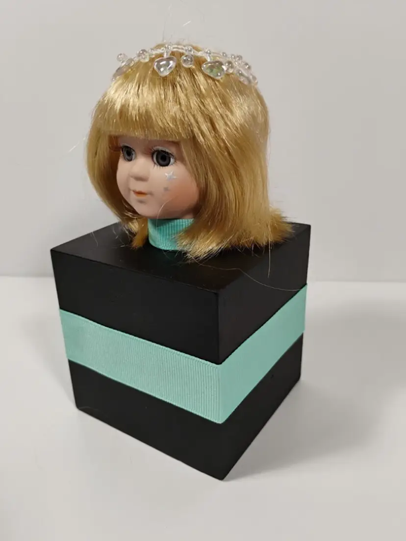 #15 Starchild. She is a blue eyed baby doll head attached to a hand painted black wooden box and adorned with teal / Tiffany blue ribbon. She is a one-of-a-kind creation upcycled from a rescued, vintage porcelain doll and is intended to be used as a night light / mood light - NO LIGHTS INCLUDED (for liability reasons). The box is open in the back for you to add your own electric tea light candle or fairy lights. There's a small opening in the neck to insert fairy lights. She has silver metallic stars painted on her face (original to the doll) and a removable headpiece of iridescent hearts (original to the doll).