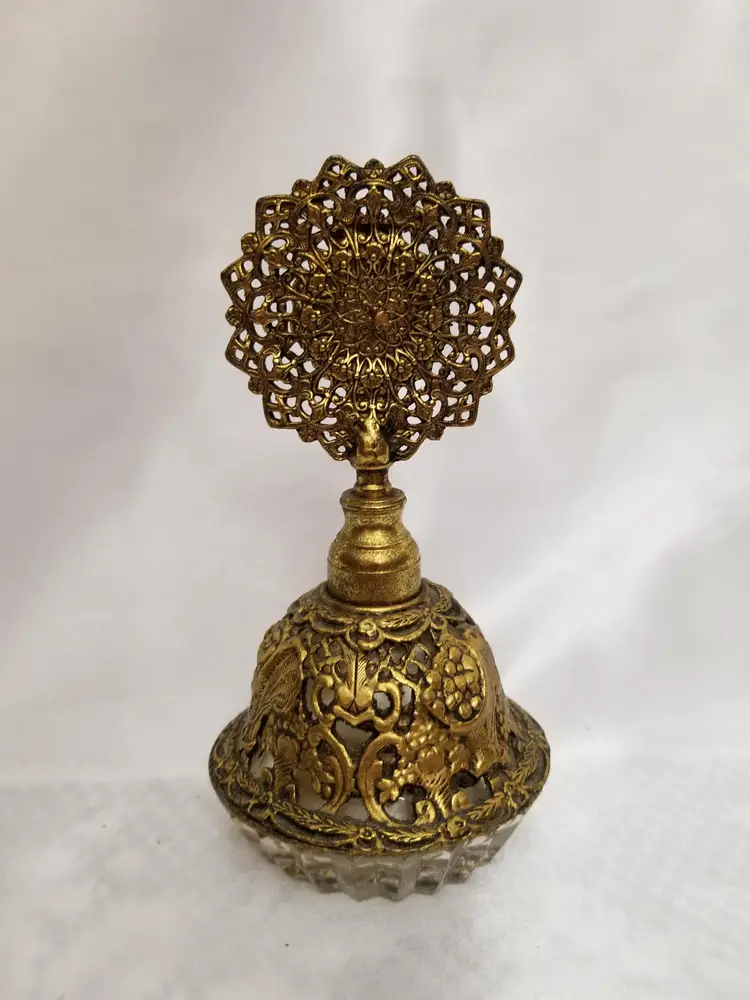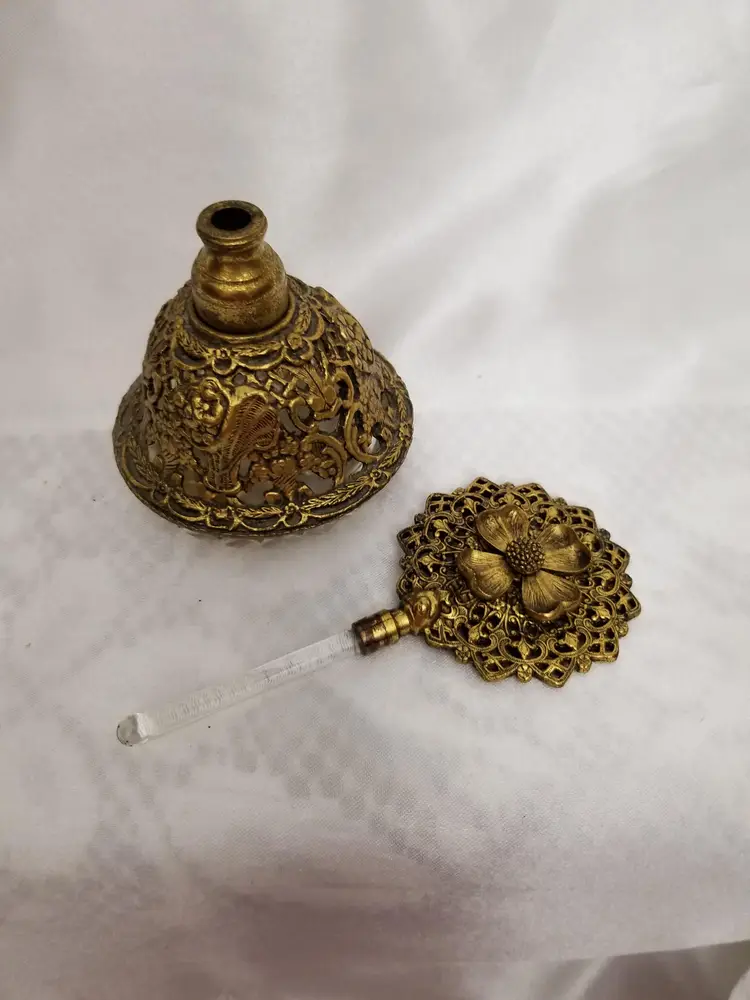 Vintage Ormolu Filigree & Dogwood Flower Perfume Bottle is 6" tall. Glass bottle covered in golden filigree, sunburst stopper with flower and dauber.
