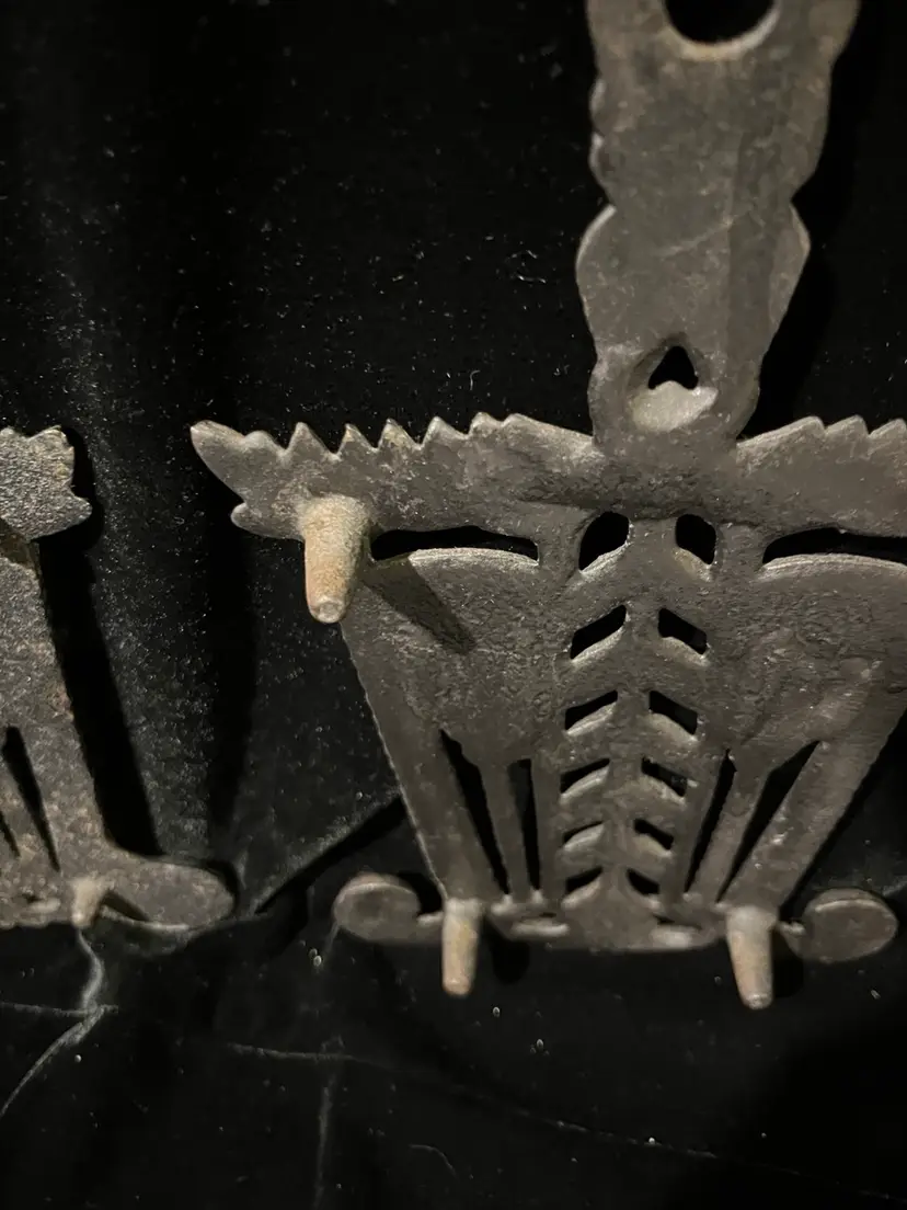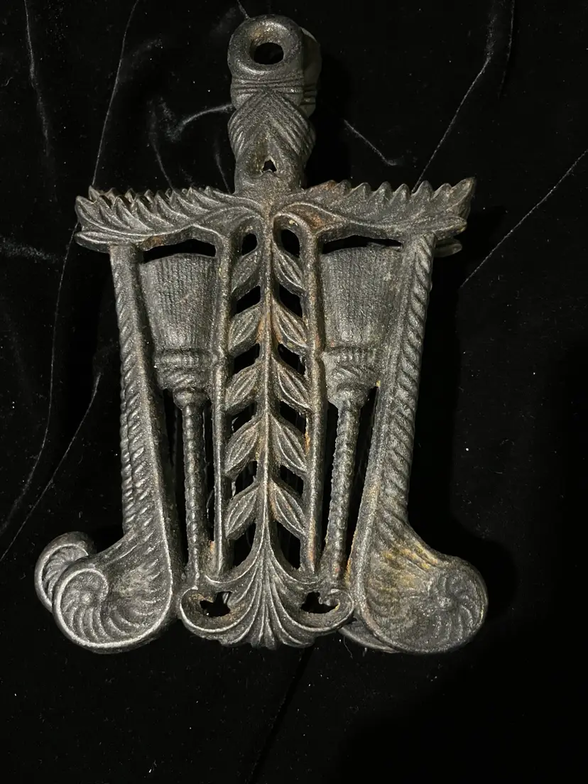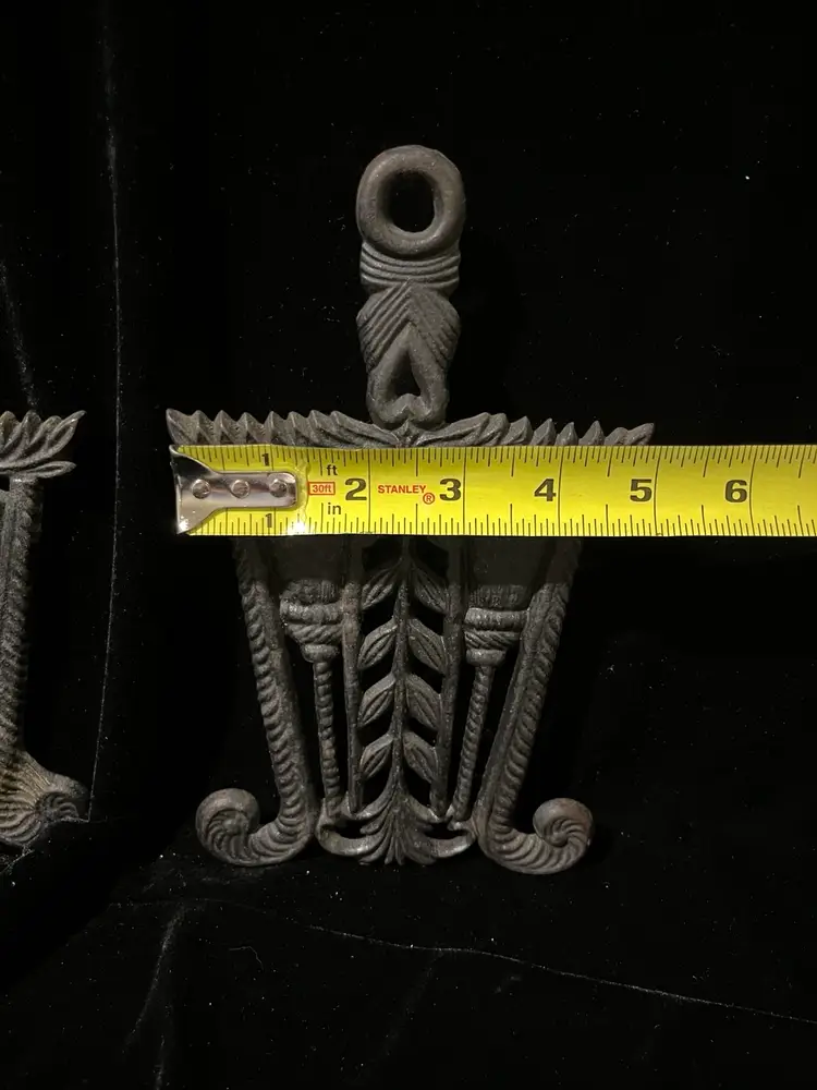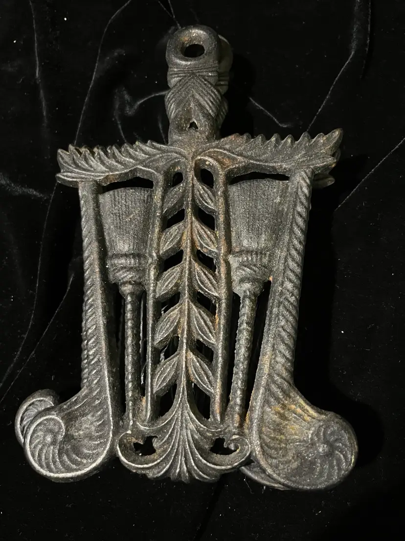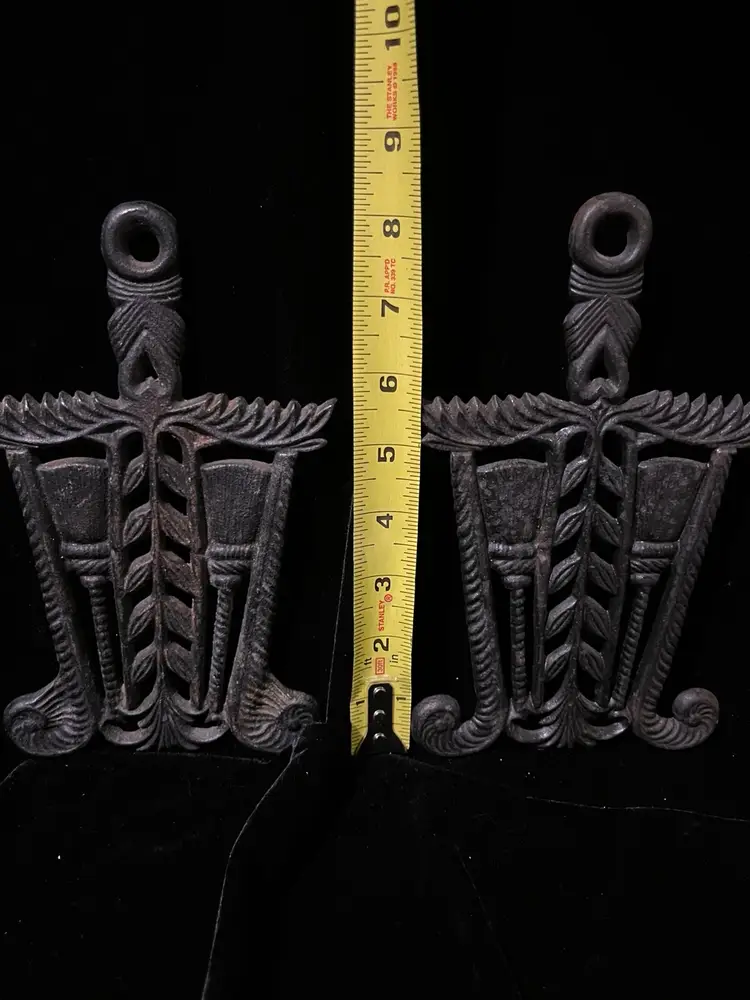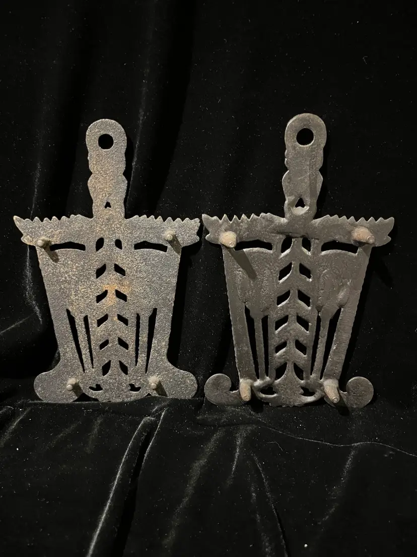 Vintage trivets featuring brooms and heart design. In perfect condition although they could use some reseasoning. Although they have identical designs, one has shorter legs than the other as shown in the pictures.