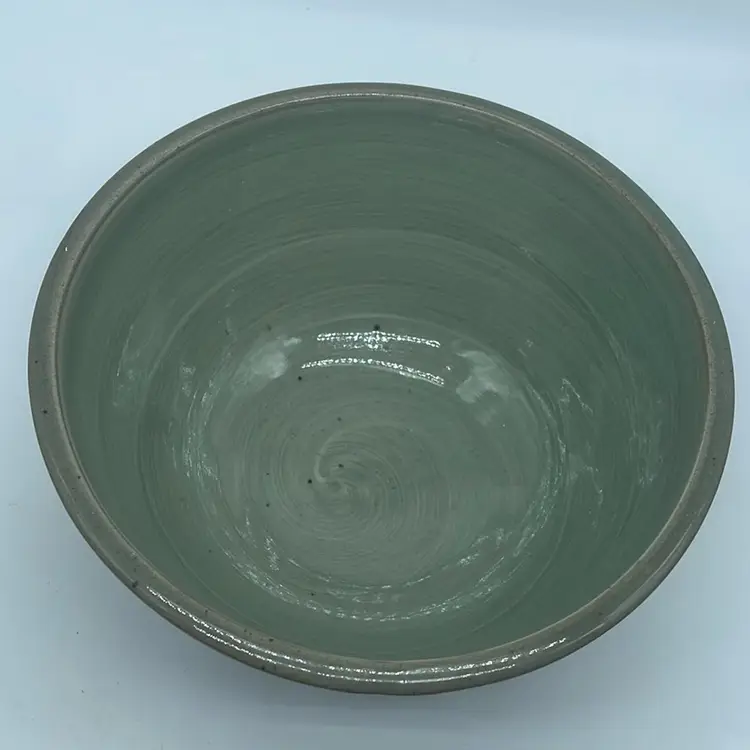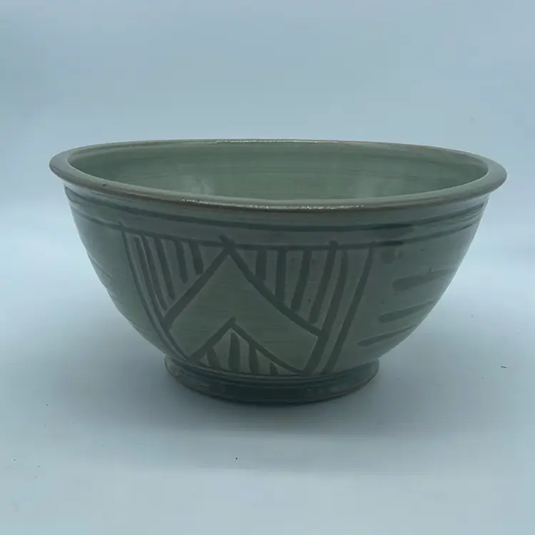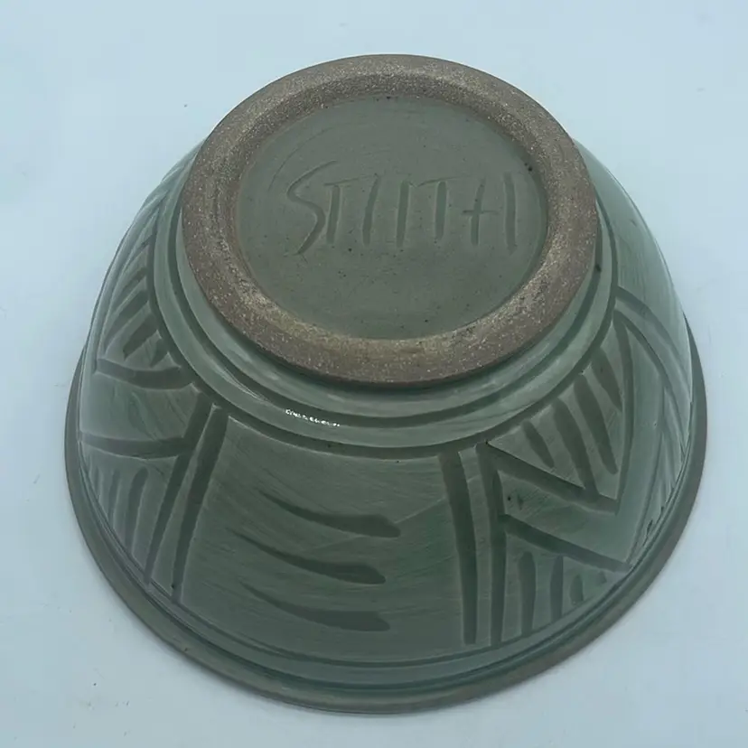 This particular bowl, with its incised geometric decoration and a distinctive maker's mark, points towards it being a piece of studio pottery. Studio pottery emphasizes the artist's individual touch and creative vision, often resulting in unique, handmade items. The Oribe glaze mentioned in one of the search results is a traditional Japanese glaze known for its distinctive green and copper-red colors, though the bowl in the image appears to be a more uniform sage green, suggesting either a variation or a different stylistic interpretation.