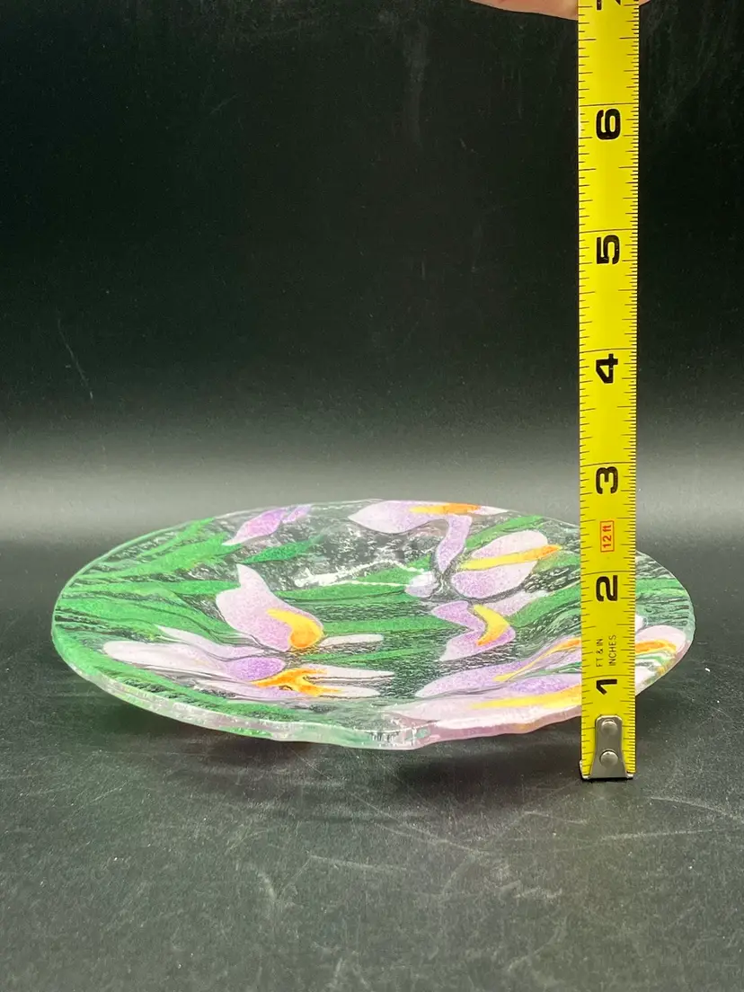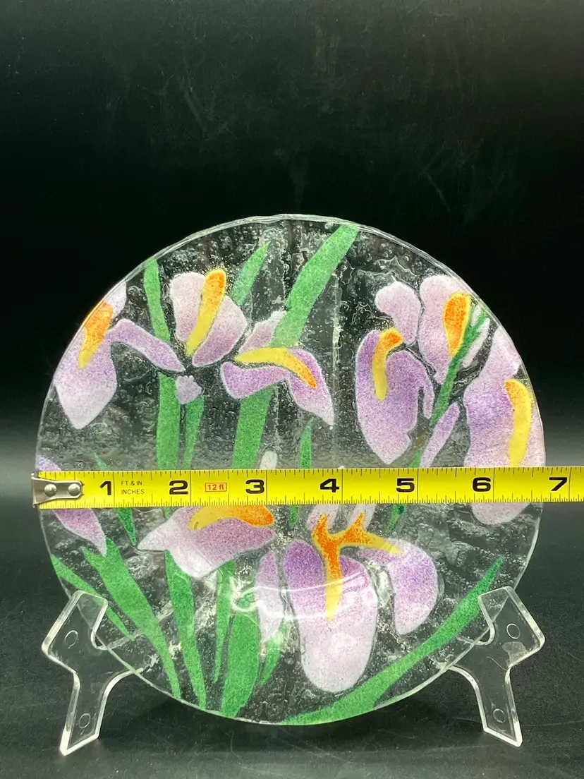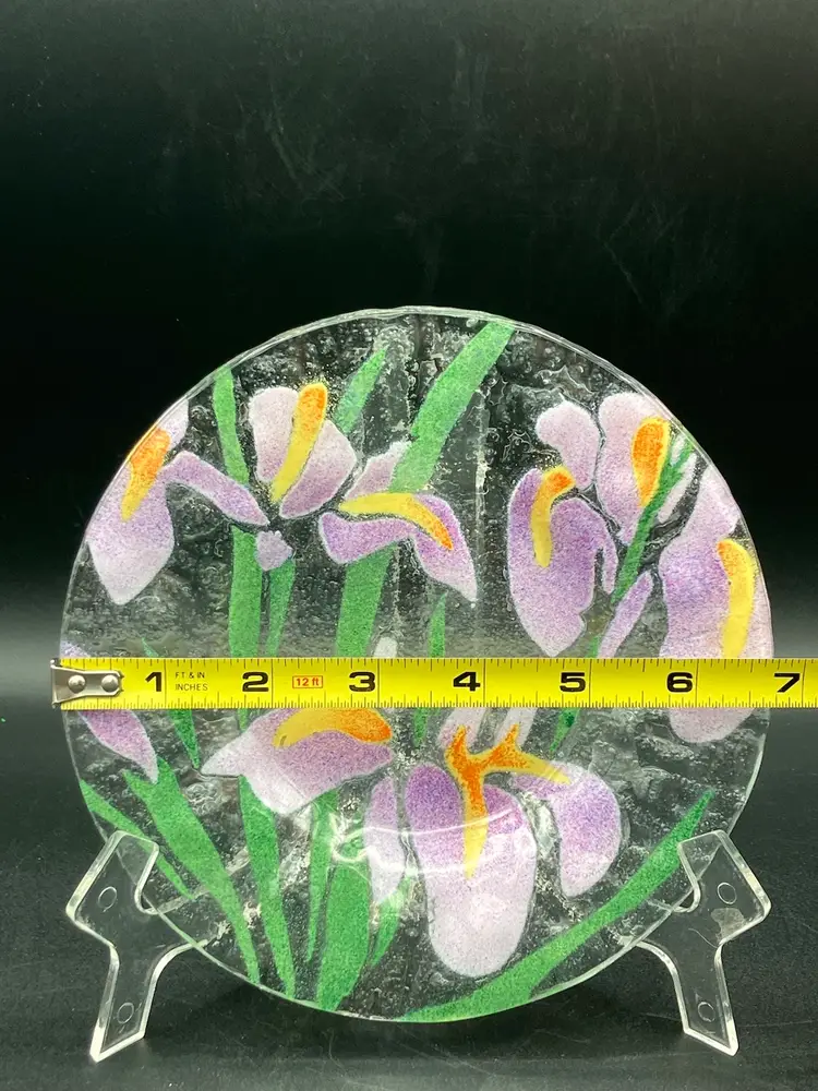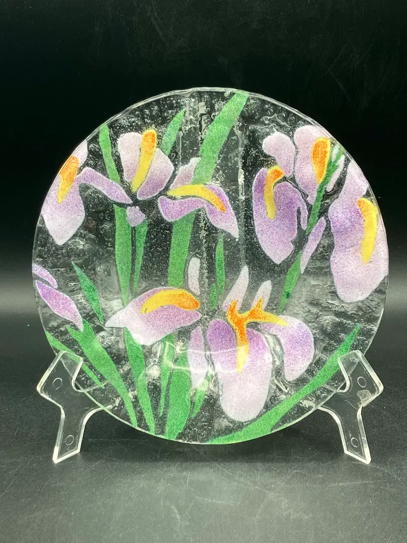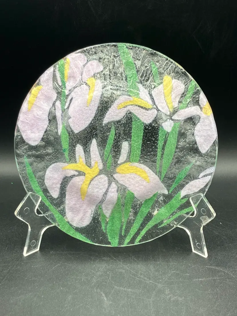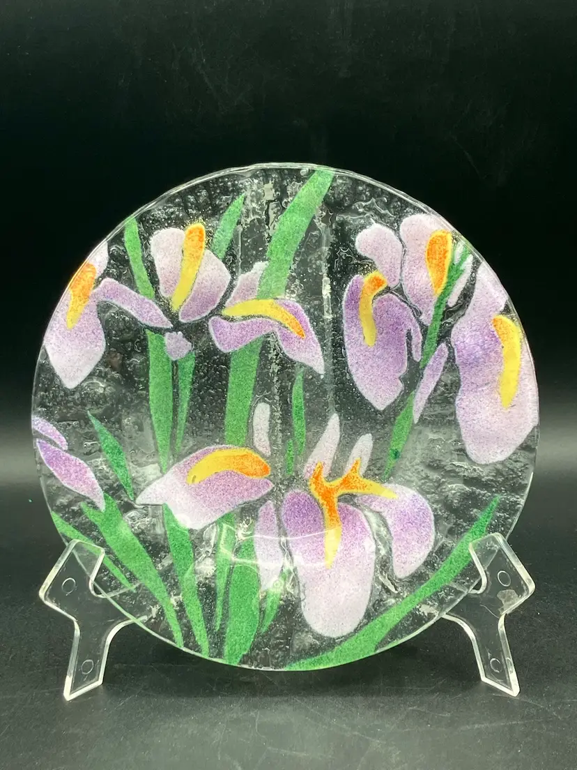 This lovely fused glass plate has irises and foliage. It’s approximately 7 inches across. There are no chips cracks or flea bites. There is no signature. Please see pictures for complete description, measurements, and condition.