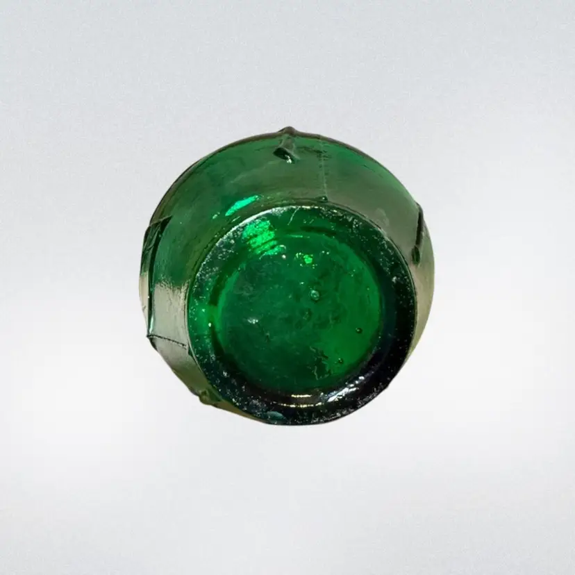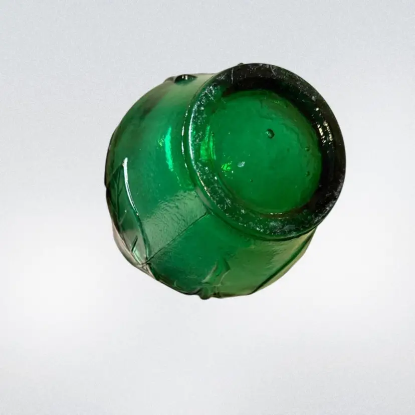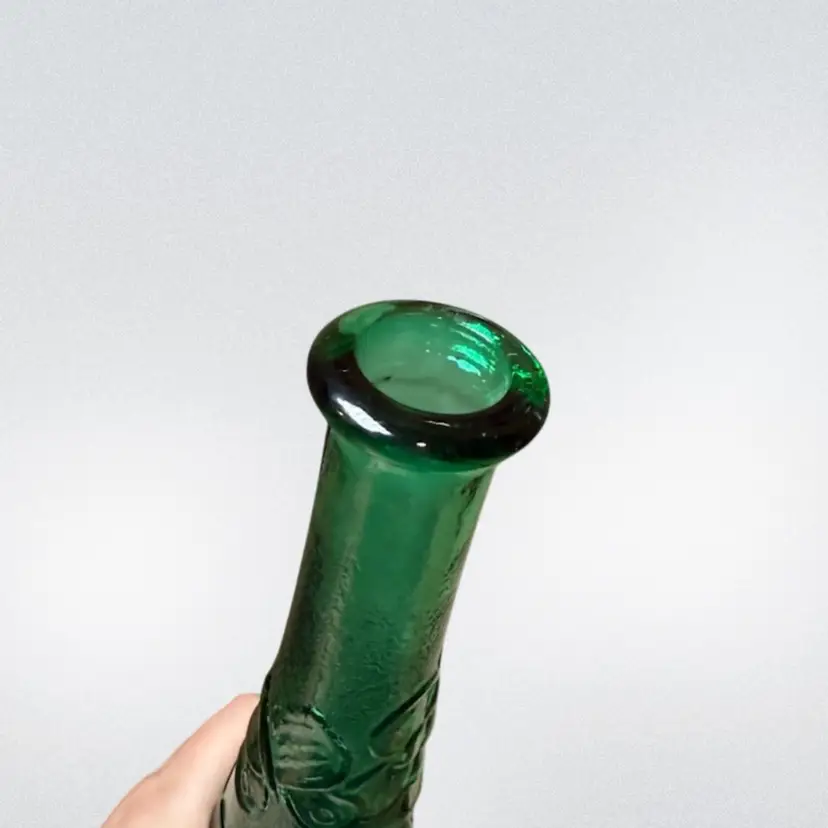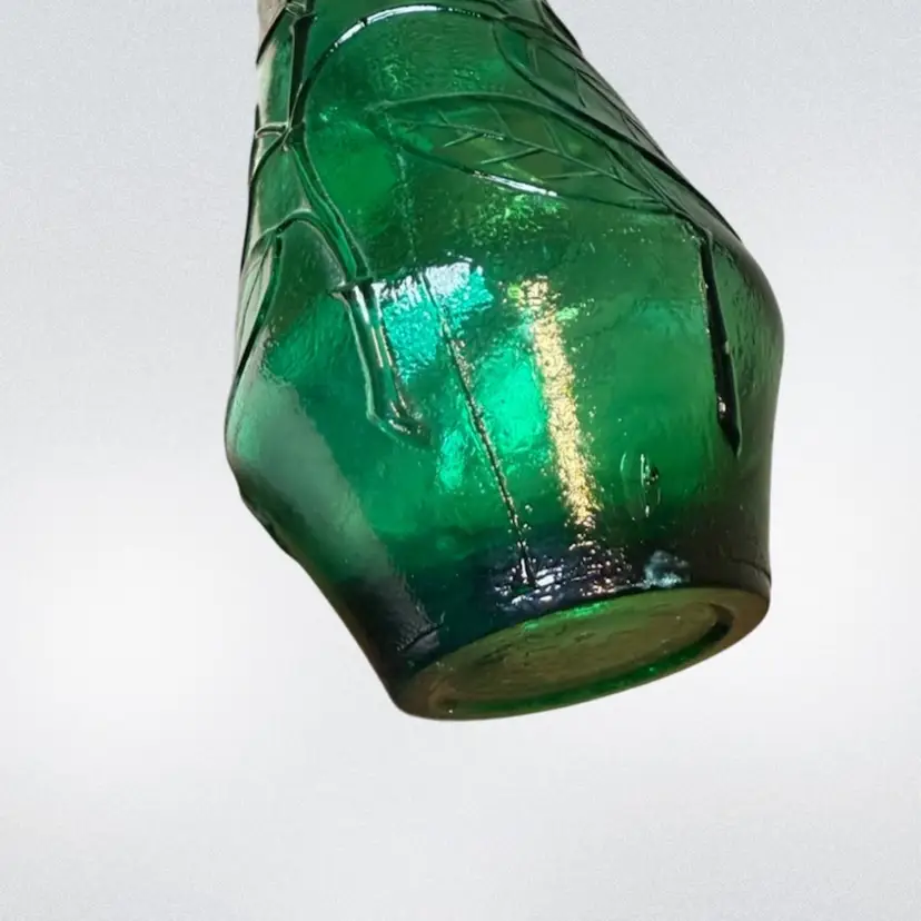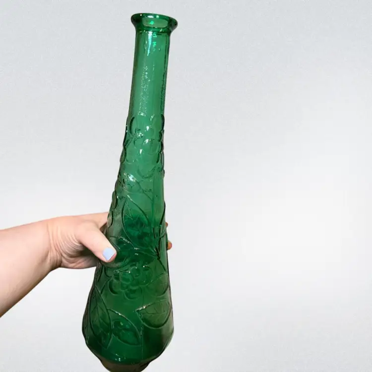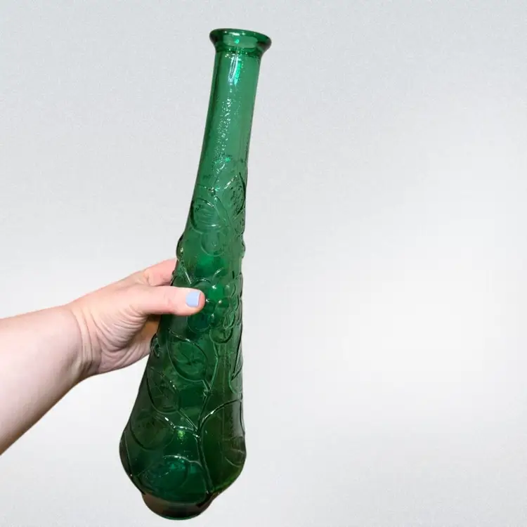 About 16in tall, beautiful green Italian glass decanter made in Empoli. The bottle has cute groovy flowers and a special butterfly design. This piece is in good vintage condition- most flaws are makers imperfections including air bubbles and some small straw marks. No stopper.