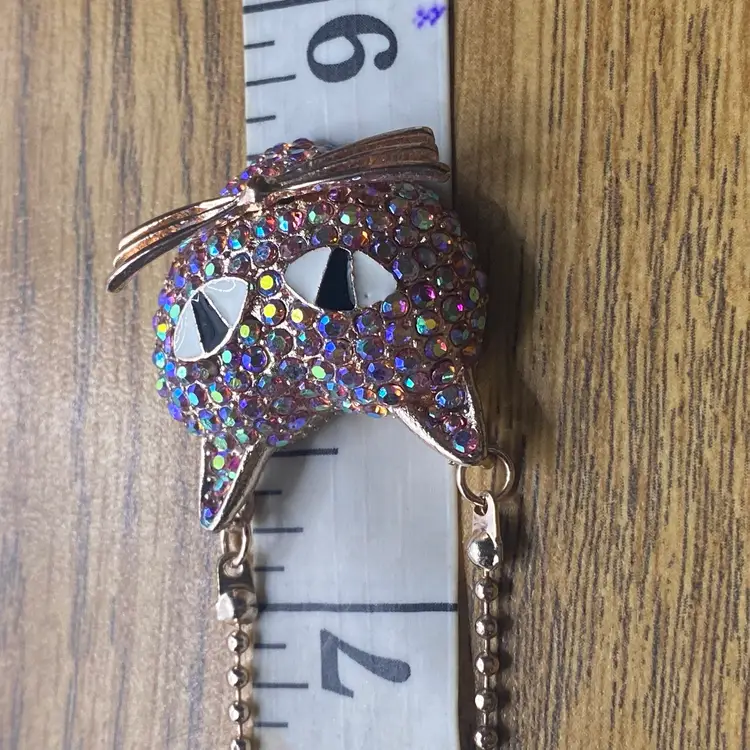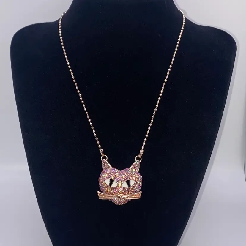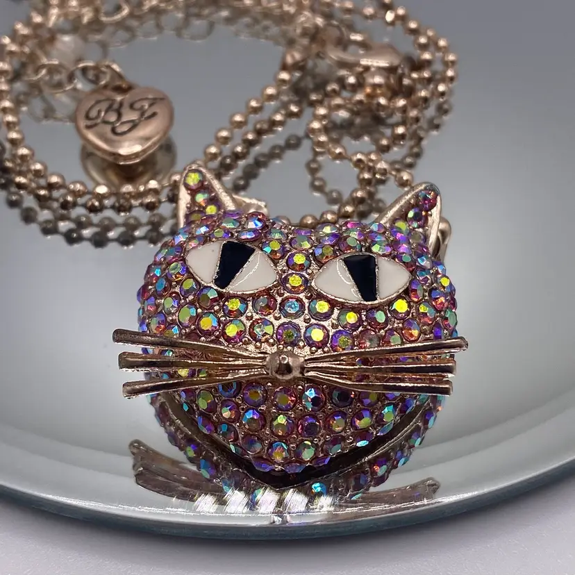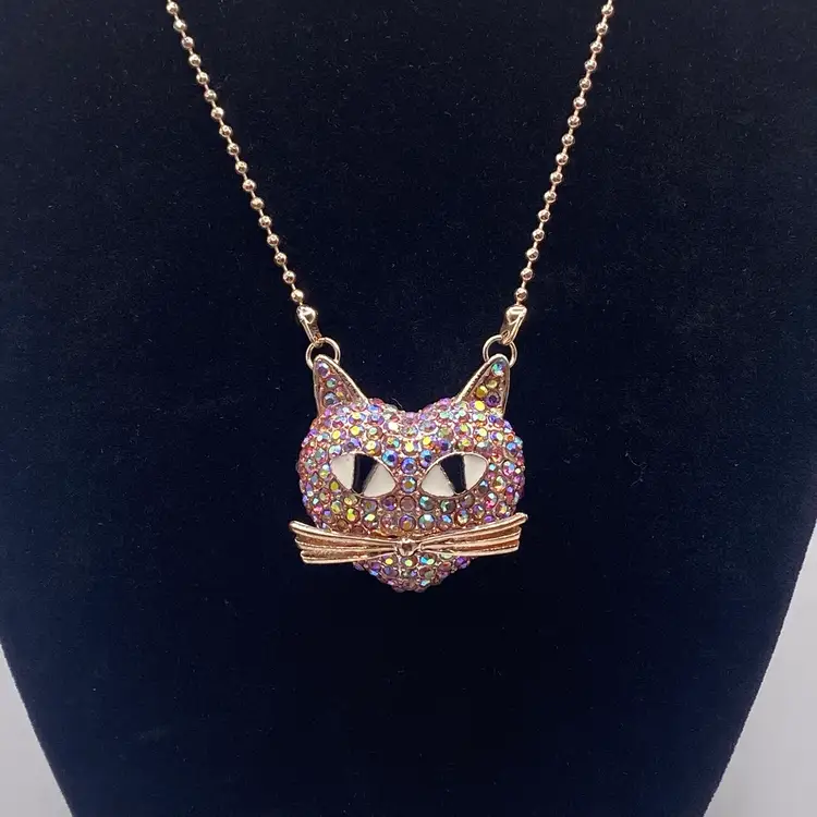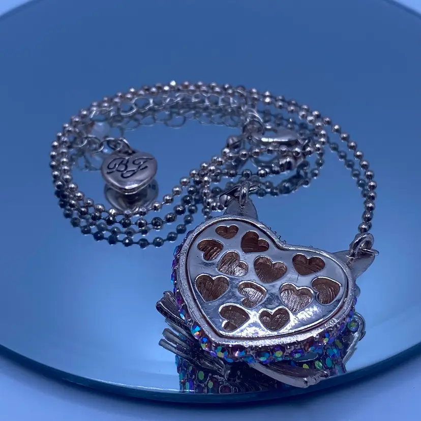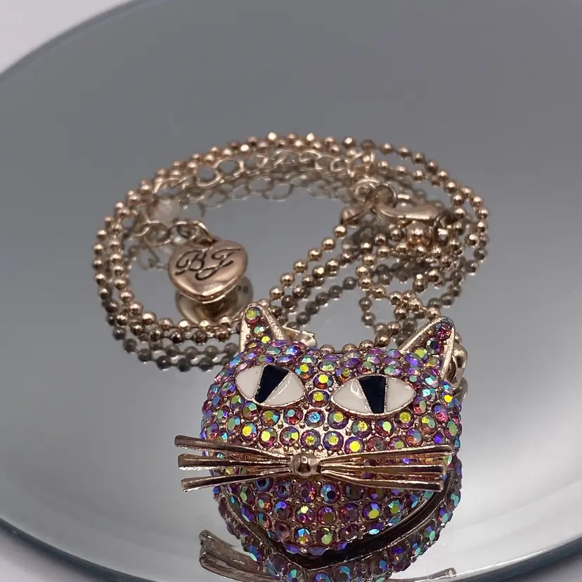 Add a touch of feline beauty to your outfit with this stunning Betsey Johnson necklace. The pendant features a heart-shaped design with enamel detailing and sparkling rhinestones. The necklace is made of high-quality stainless steel and has a lobster clasp closure.