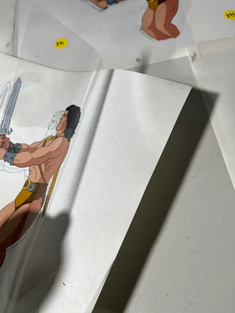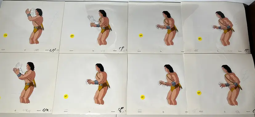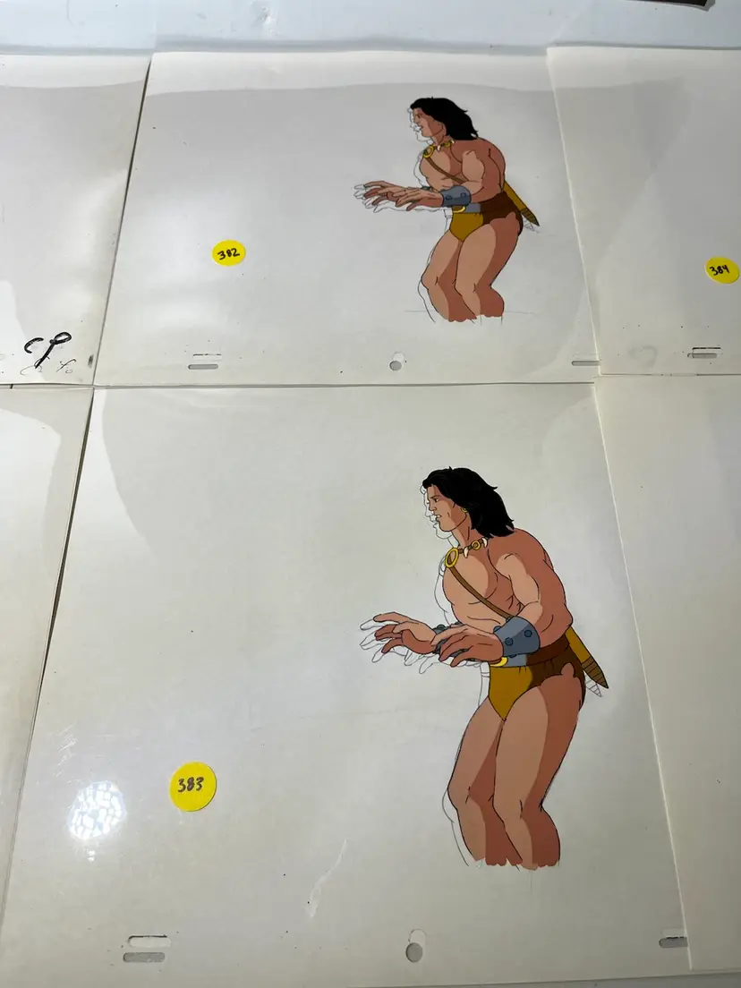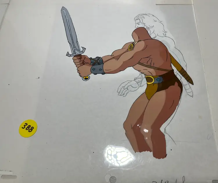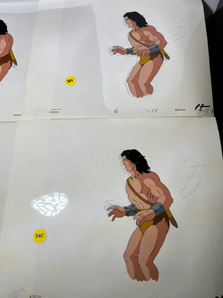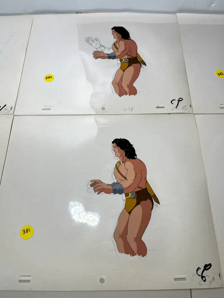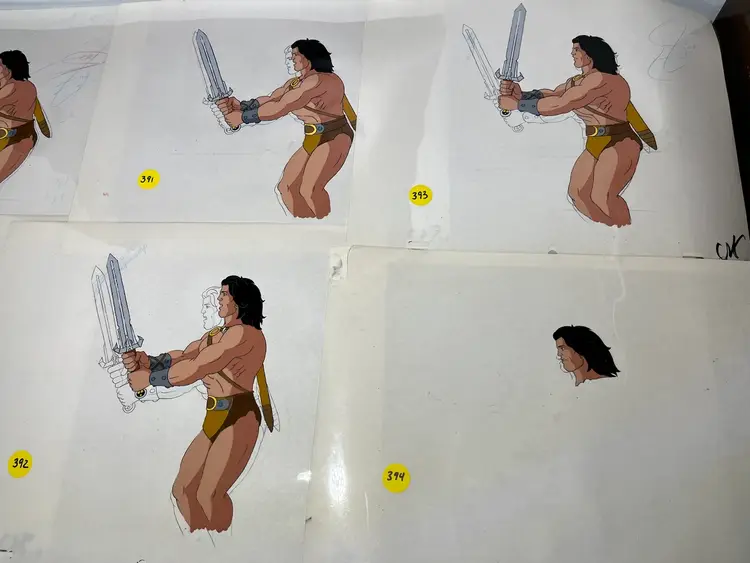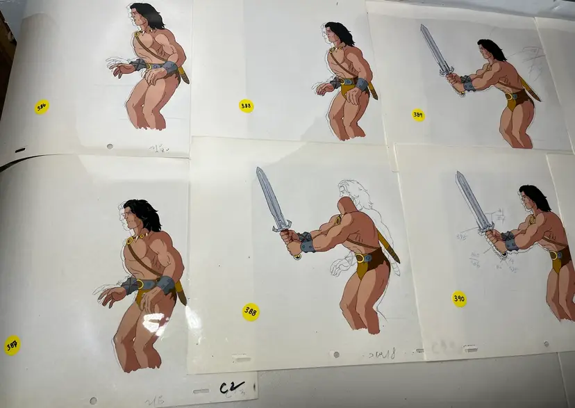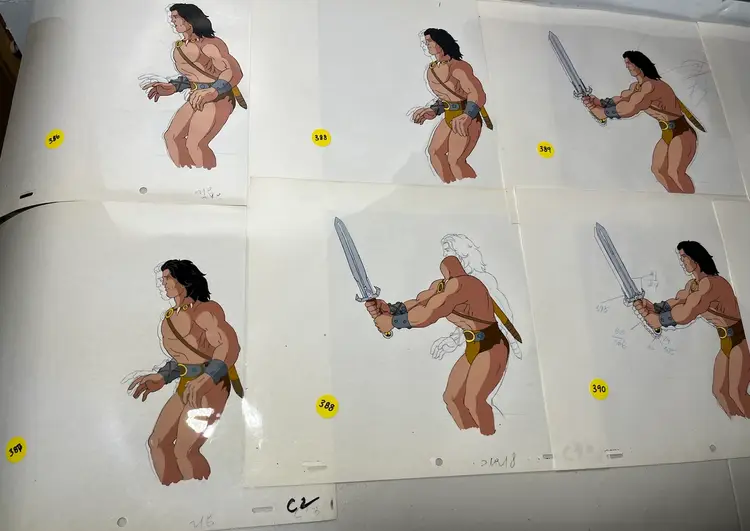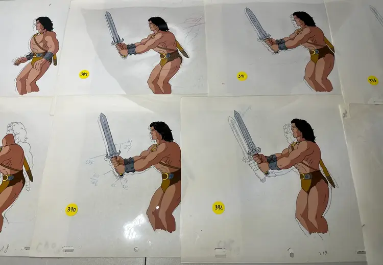 This is a rare find for collectors of animation art and merchandise. The package includes 17 original production drawings and cel sheets of Conan, the Barbarian, from the year 1990s. These items are signed and come from the original production, making them a must-have for fans of the franchise and animation enthusiasts alike. The cel sheets feature stunning artwork that brings the character to life. This is a unique opportunity to own a piece of animation history, and it is sure to be a valuable addition to any collection.