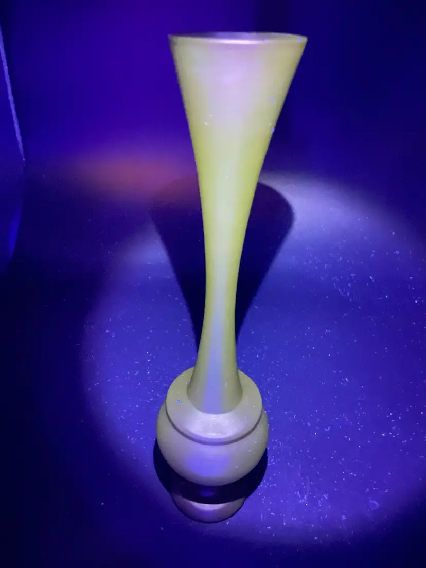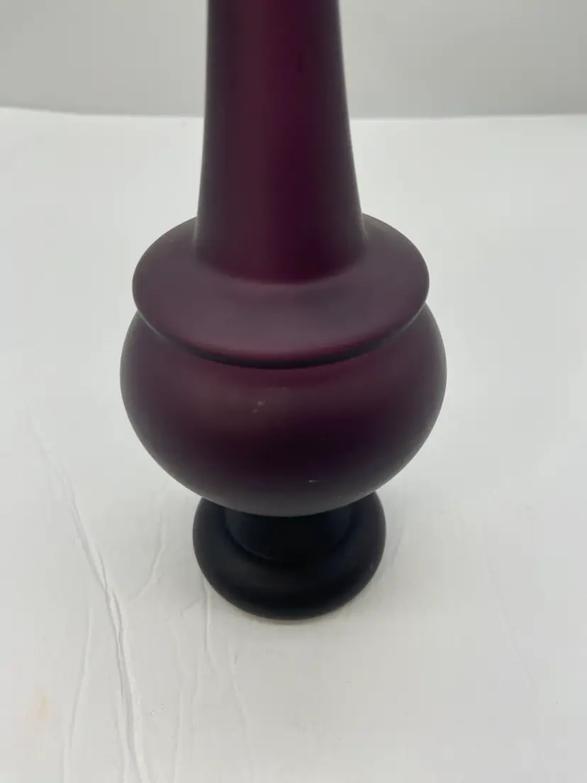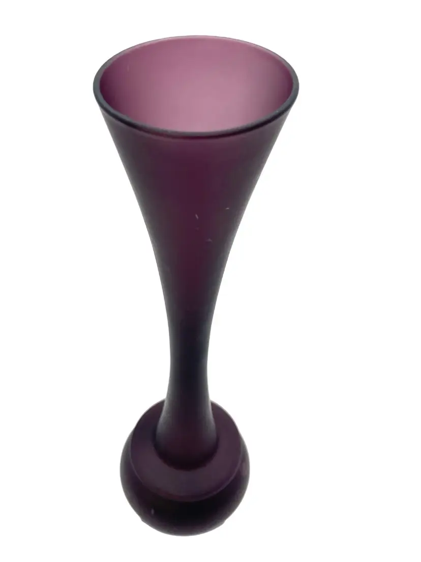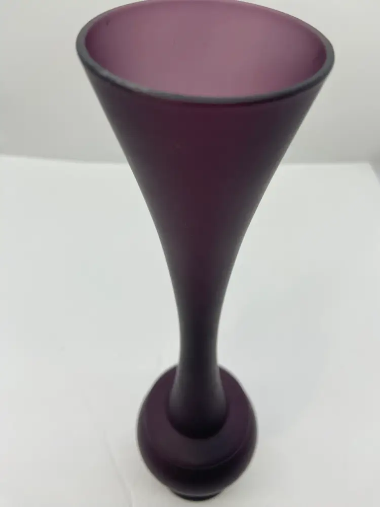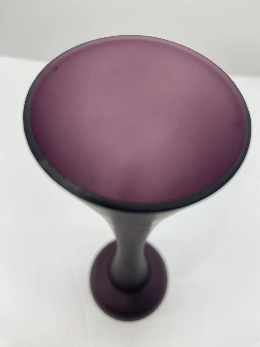 12” tall 3” base beautiful marked Japan amethyst space with no chips or cracks, definite, vintage satin glass bud vase with funky green glow