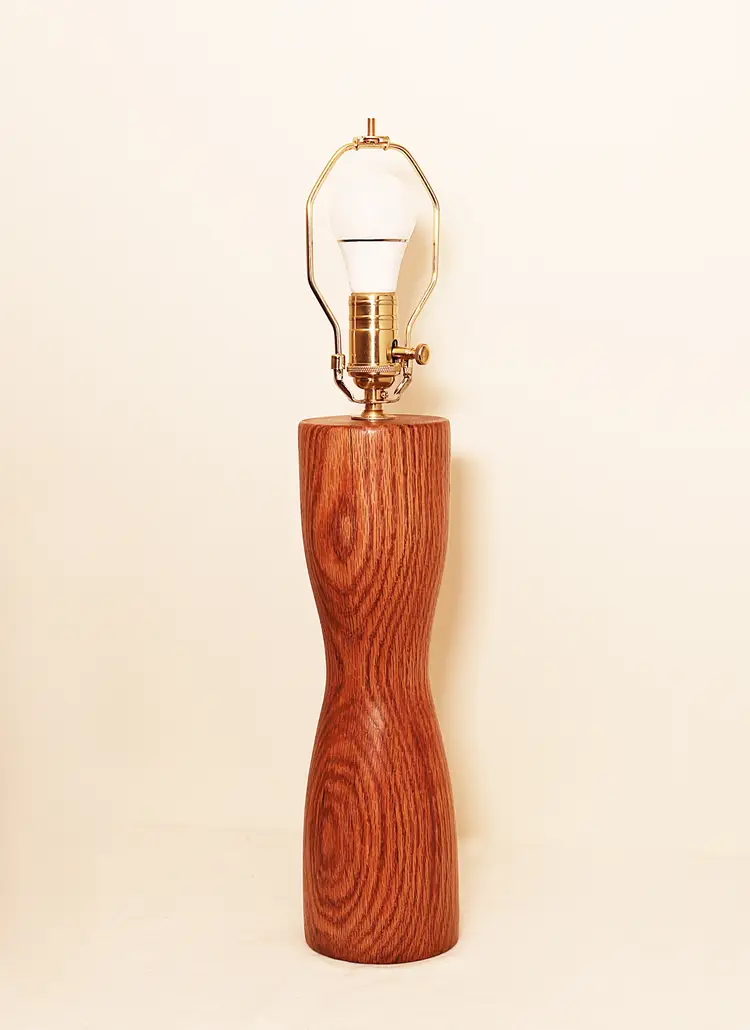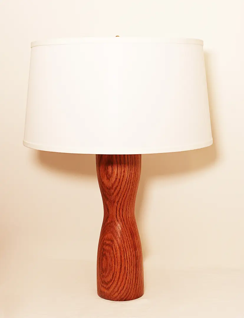 17" high Hand crafted oak oak lamp turned on a lathe from local timbers. Shown in two design options. The lamp features subtle curves and has a hand rubbed oil finish. TWO DESIGNS SHOWN