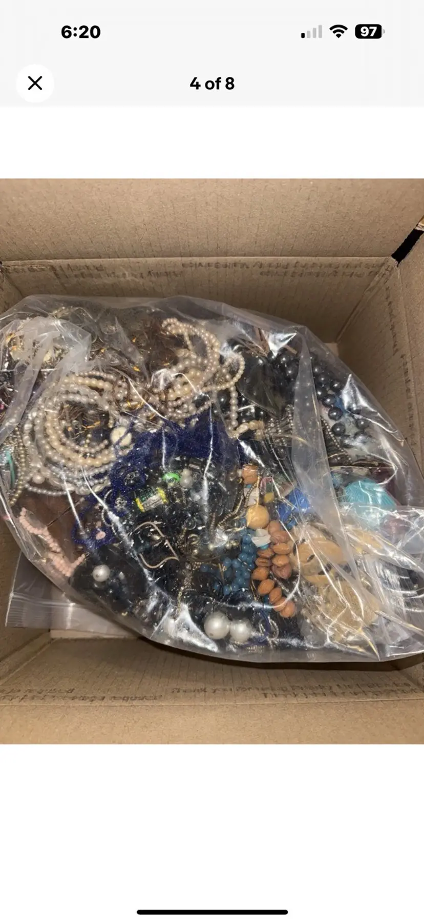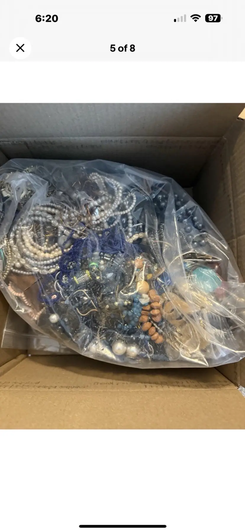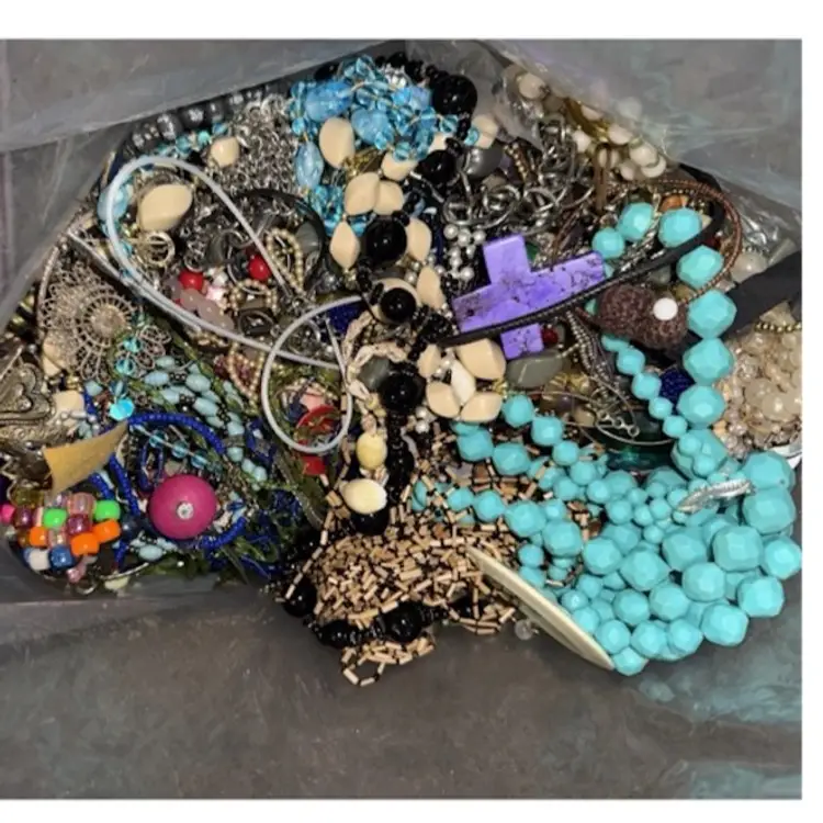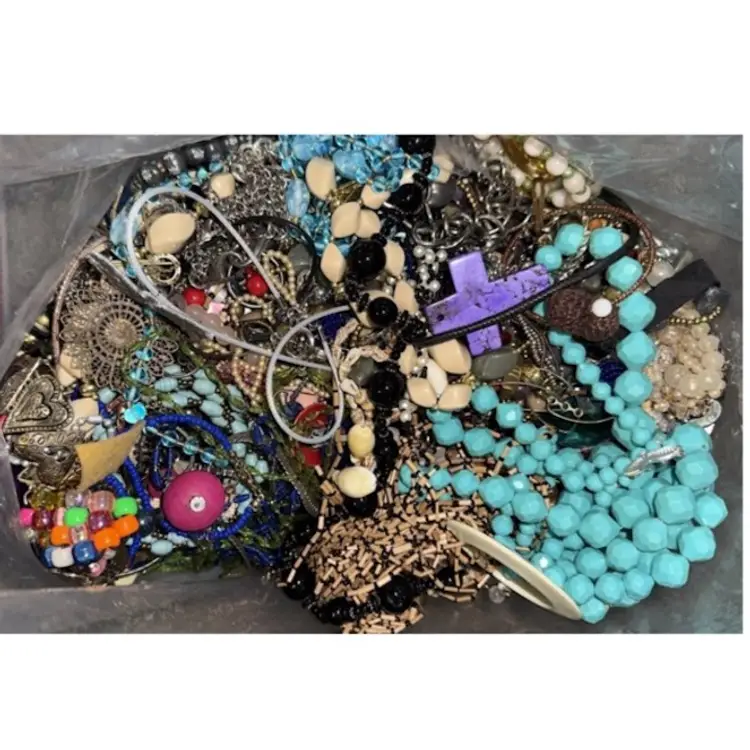 This 17 lbs jewelry lot is a mixed lot of crafting materials including beads, necklaces, bracelets, earrings, and brooches. The lot features a variety of multicolor pieces made from mixed materials and metals. This wearable and tangled box of jewelry is perfect for fashion enthusiasts looking to create their own unique accessories or crafts. 17 lbs