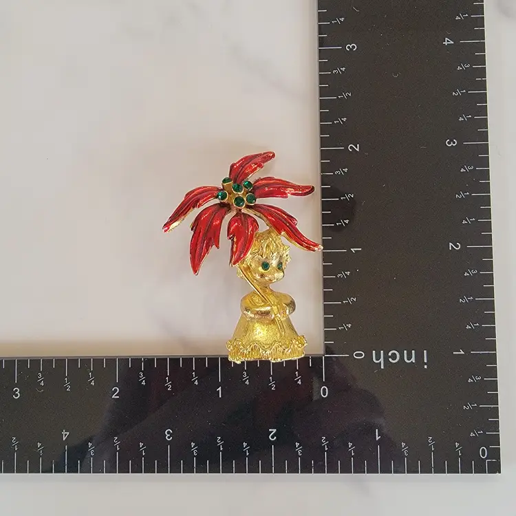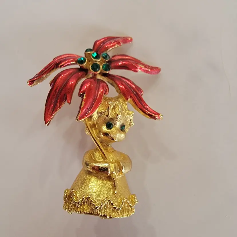 Gold tone brooch of a girl holding a poinsettia umbrella; great condition; see photos