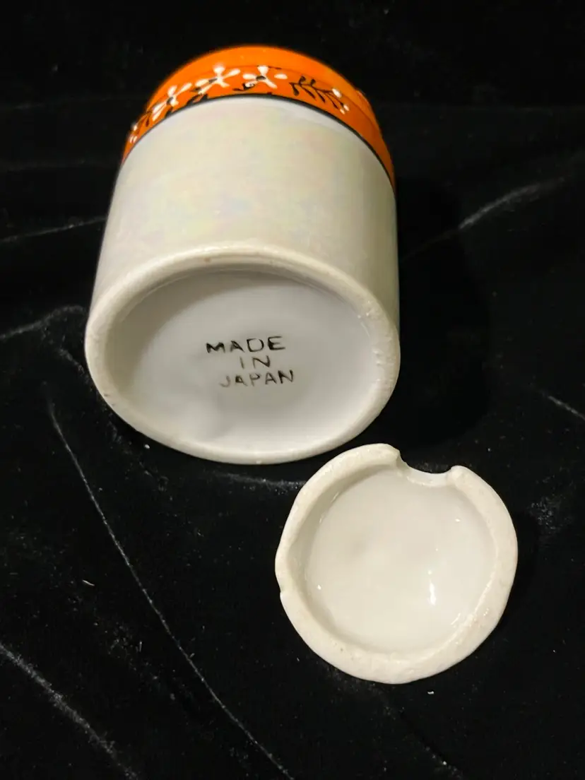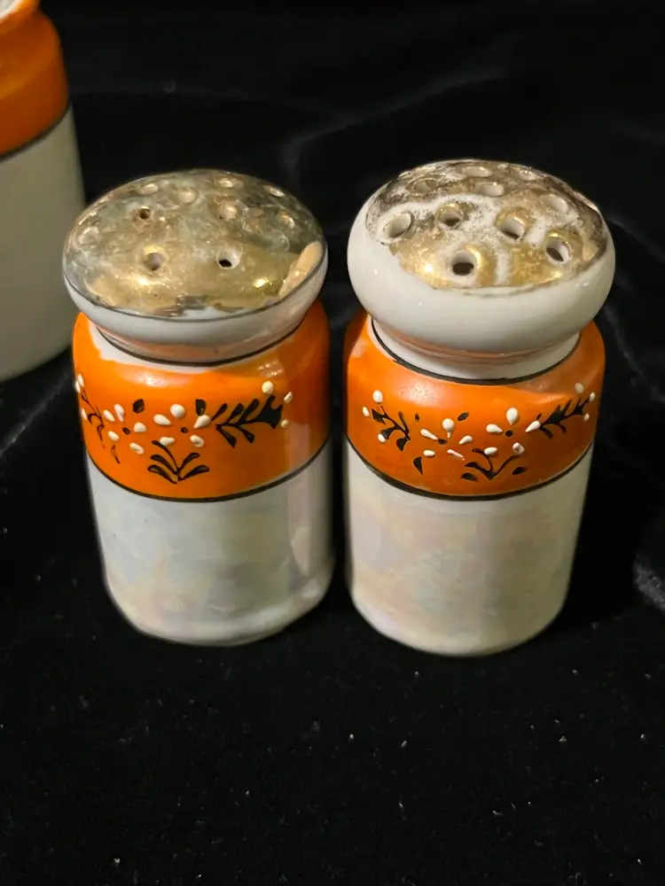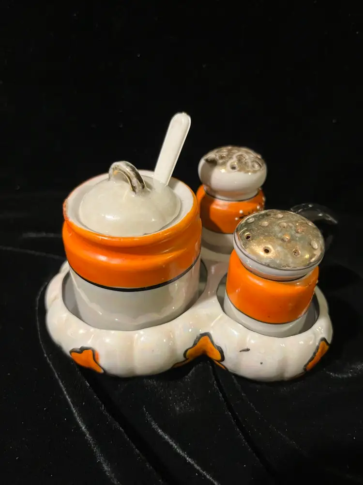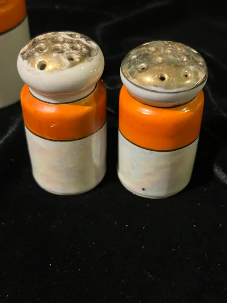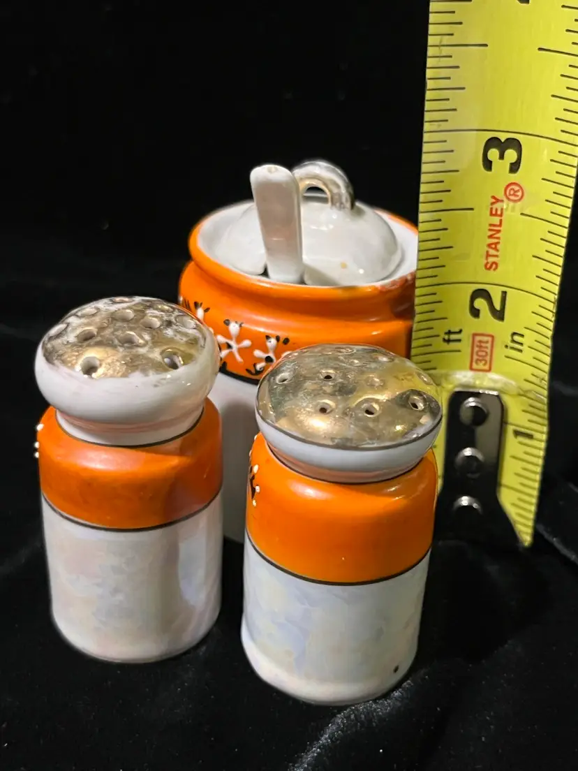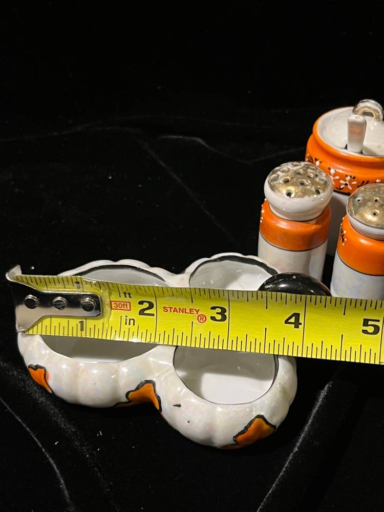 Cute little lusterware condiment set made in Japan. The fourth picture shows a hairline crack on the inside of the tray but the tray is stable and a small flea bite under the lid of the jelly jar. Lovely five piece set. Please review all pictures carefully for size color and condition.