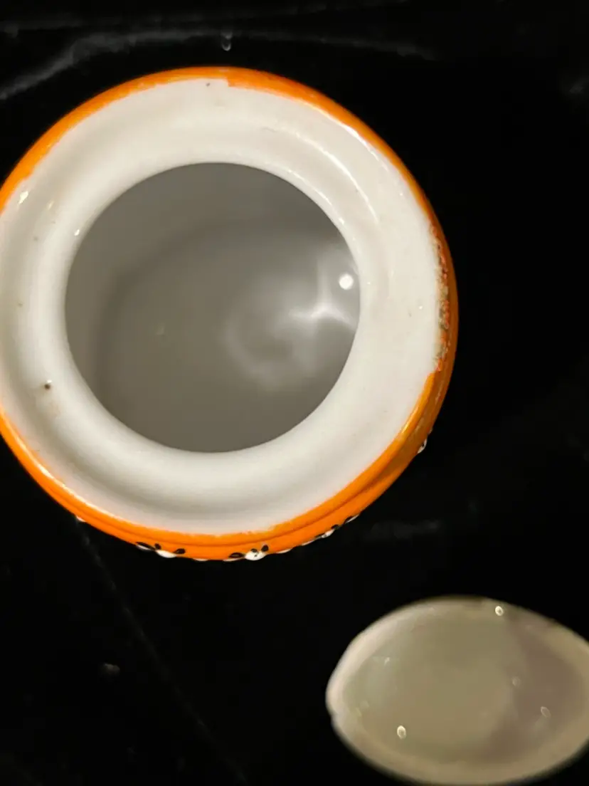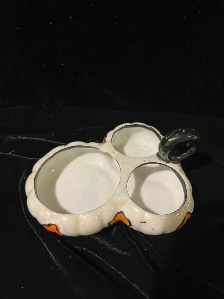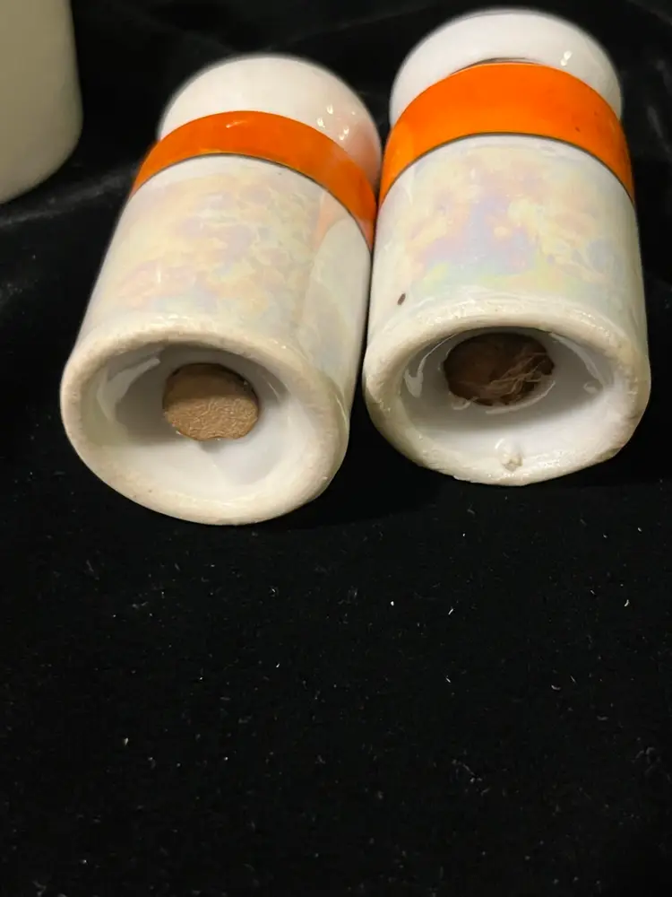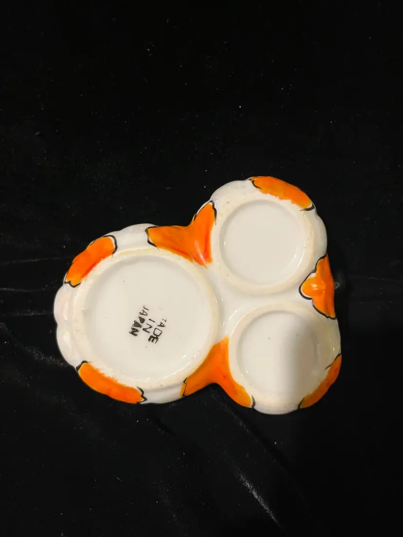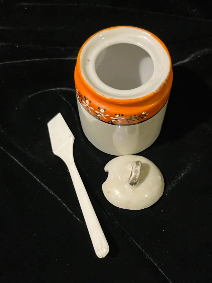 Cute little lusterware condiment set made in Japan. The fourth picture shows a hairline crack on the inside of the tray but the tray is stable and a small flea bite under the lid of the jelly jar. Lovely five piece set. Please review all pictures carefully for size color and condition.