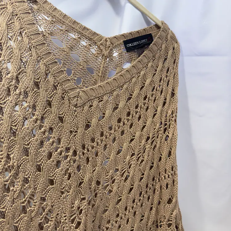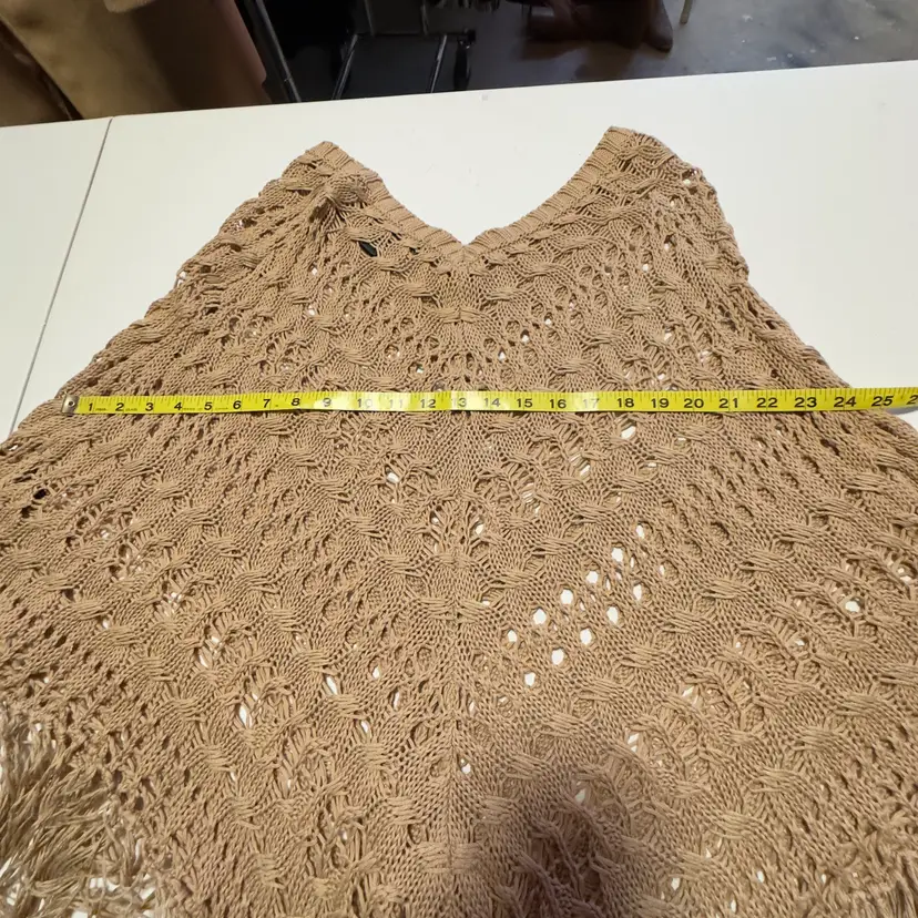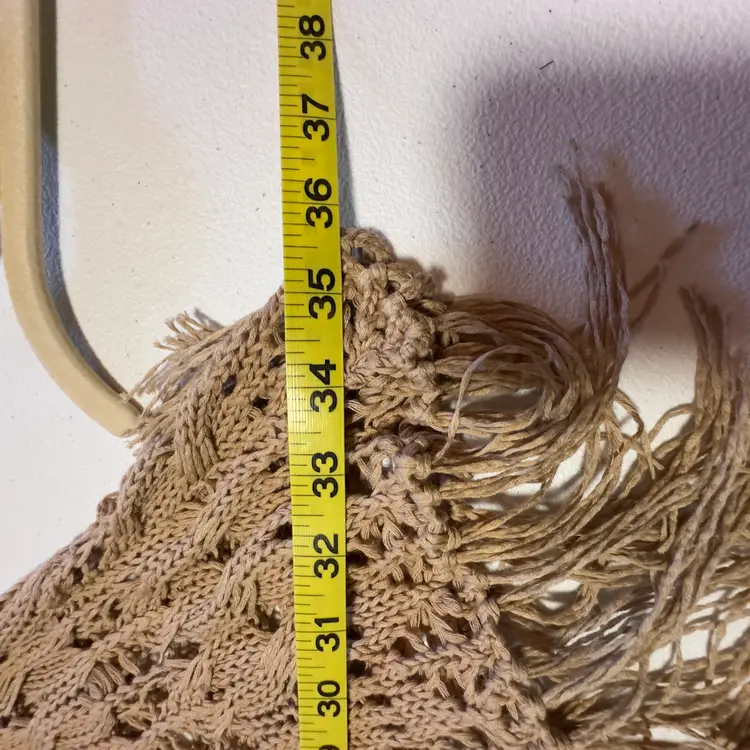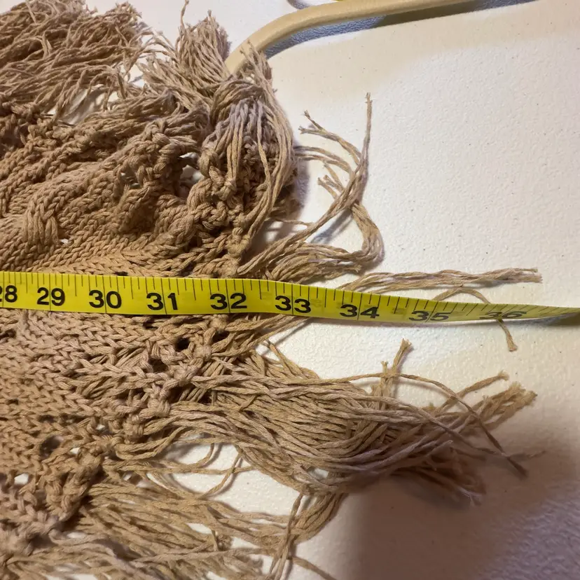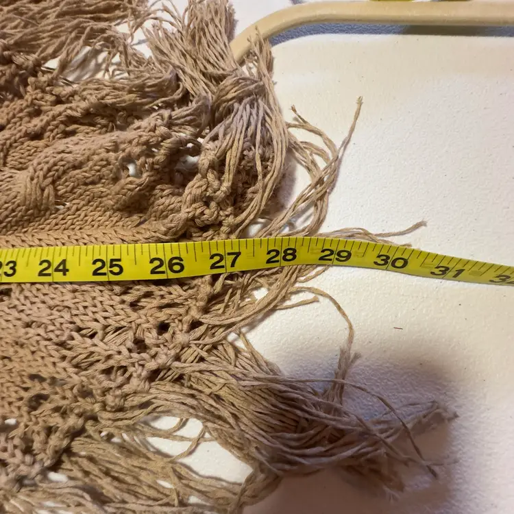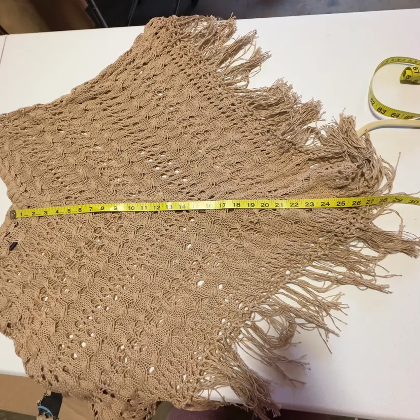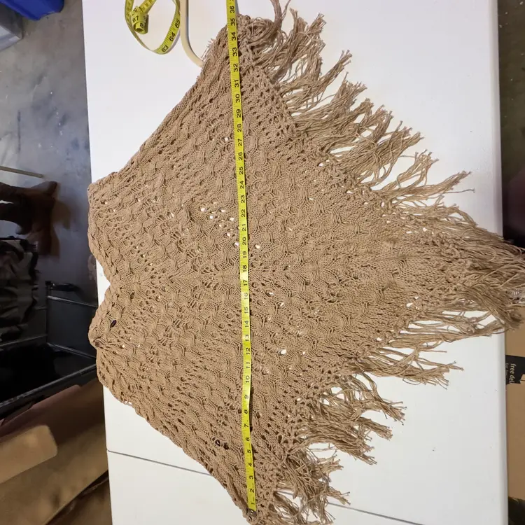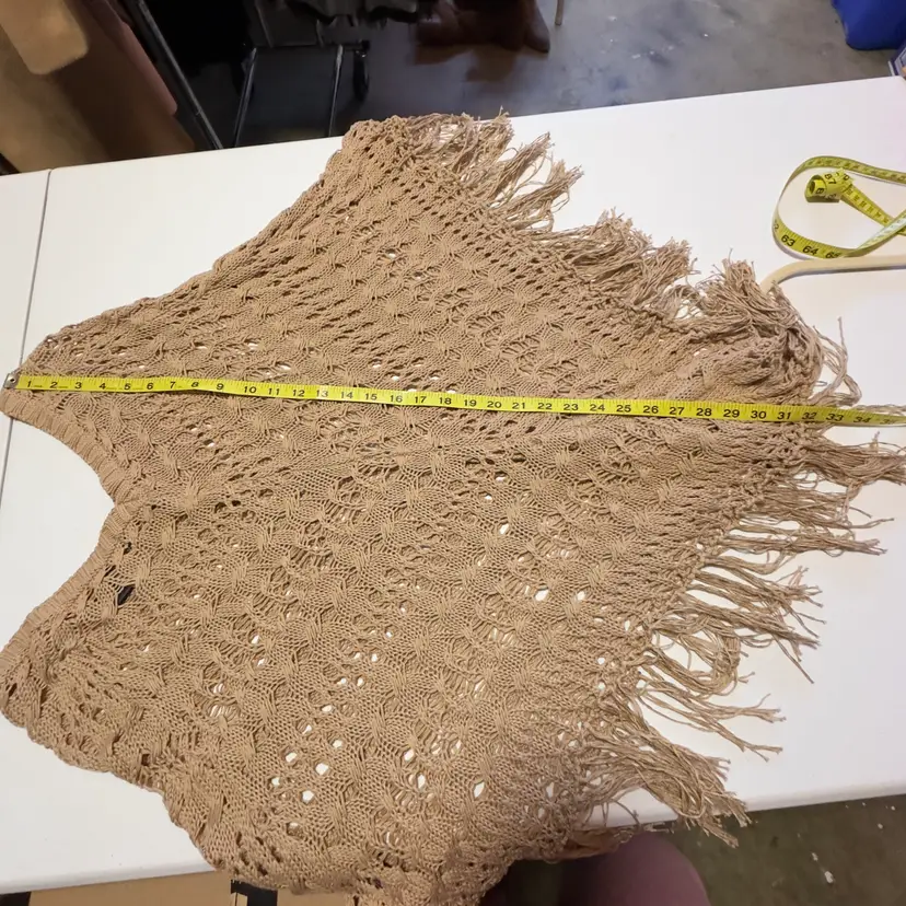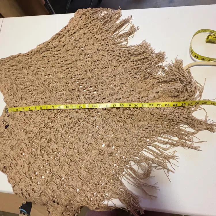 Cotton/acrylic mix, hand wash, dry flat or dry clean, neck to hem 28"-shoulder to hem 33"-neckline 7"-pit to pit 23"- edge to edge 35", in good condition, i would say it would fit better on a slimmer figure as the shoulders are not too wide as it has not been worn very often