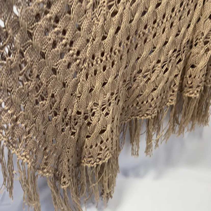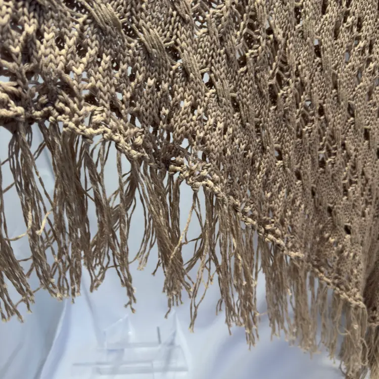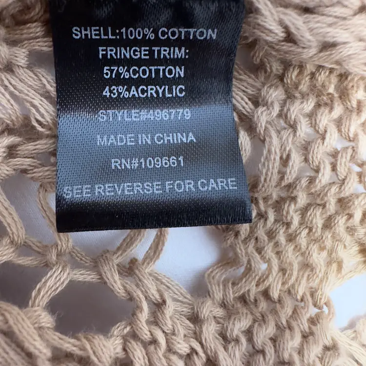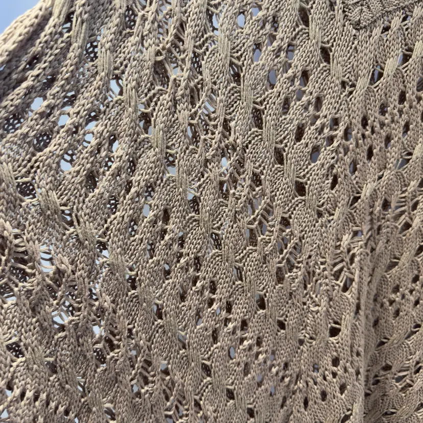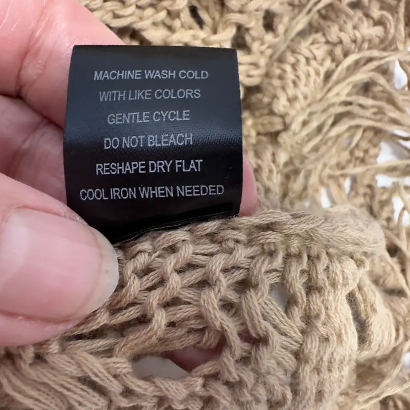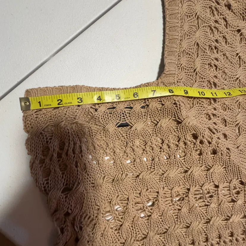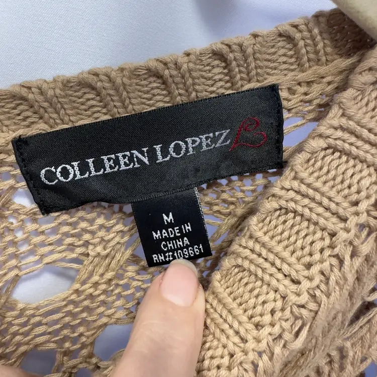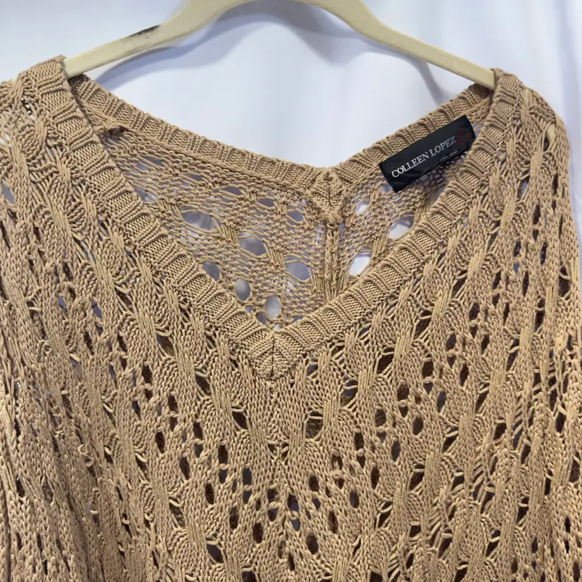 Cotton/acrylic mix, hand wash, dry flat or dry clean, neck to hem 28"-shoulder to hem 33"-neckline 7"-pit to pit 23"- edge to edge 35", in good condition, i would say it would fit better on a slimmer figure as the shoulders are not too wide as it has not been worn very often