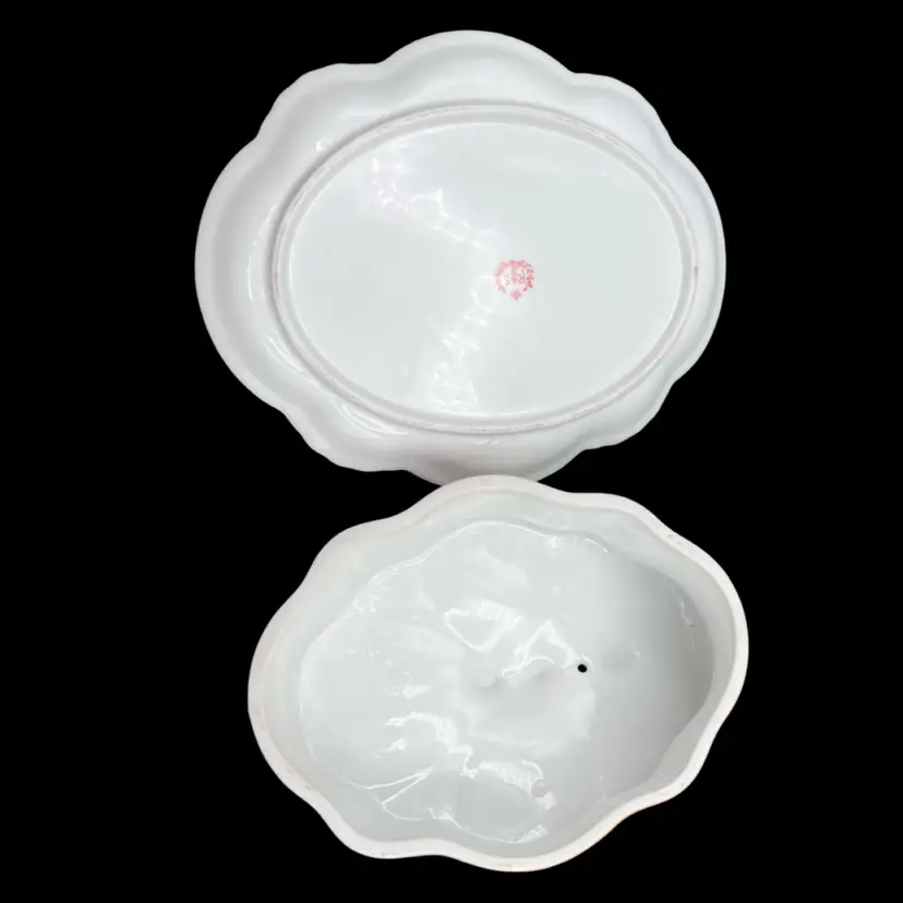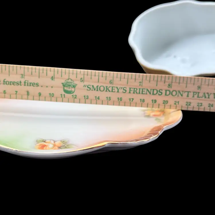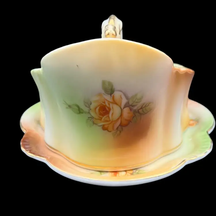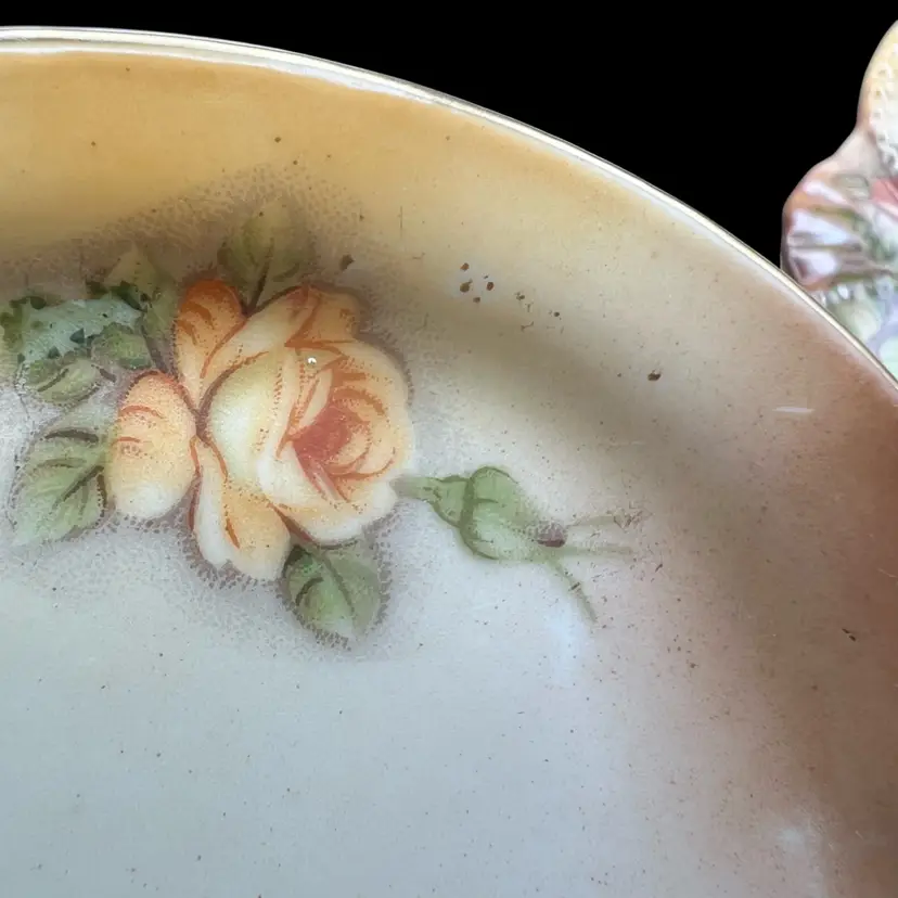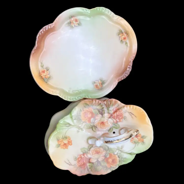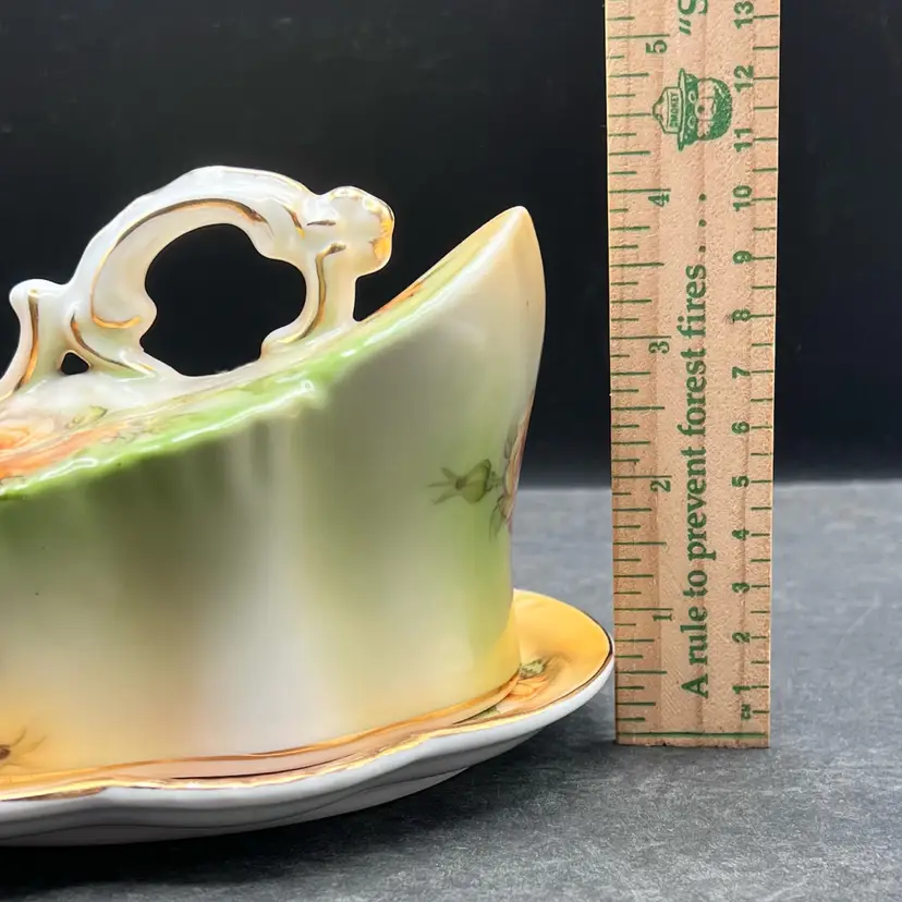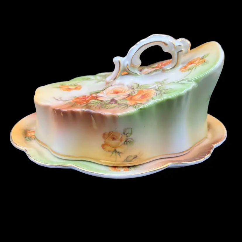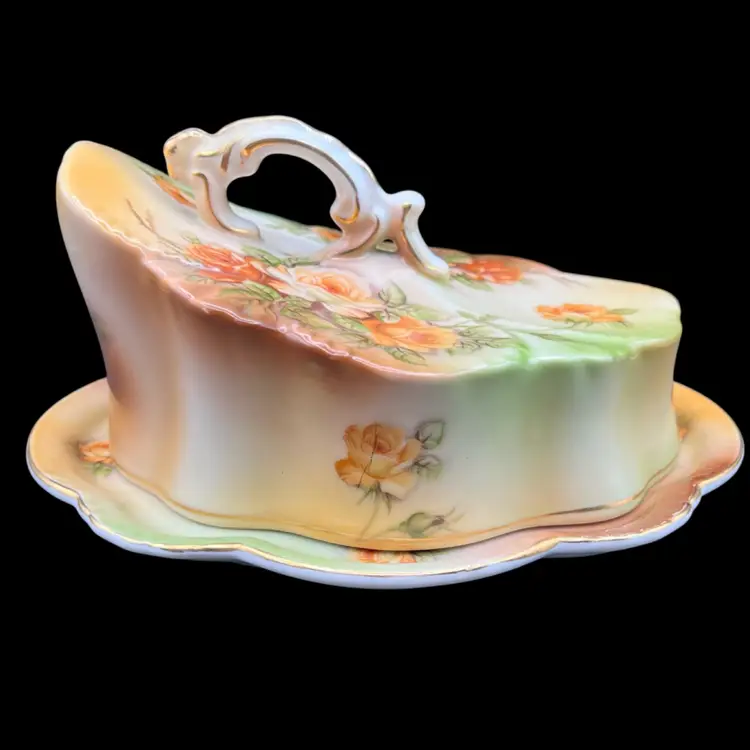 Reproduction Of A Victorian R S Prussia Peach Yellow Rose With Gold Trim And Accents Covered Cheese Keeper Dish In very good condition no chips or cracks. There are a few spots on the design overlay but not noticeable Measures 8 1/2” x 7” x 4 1/2” tall overall.