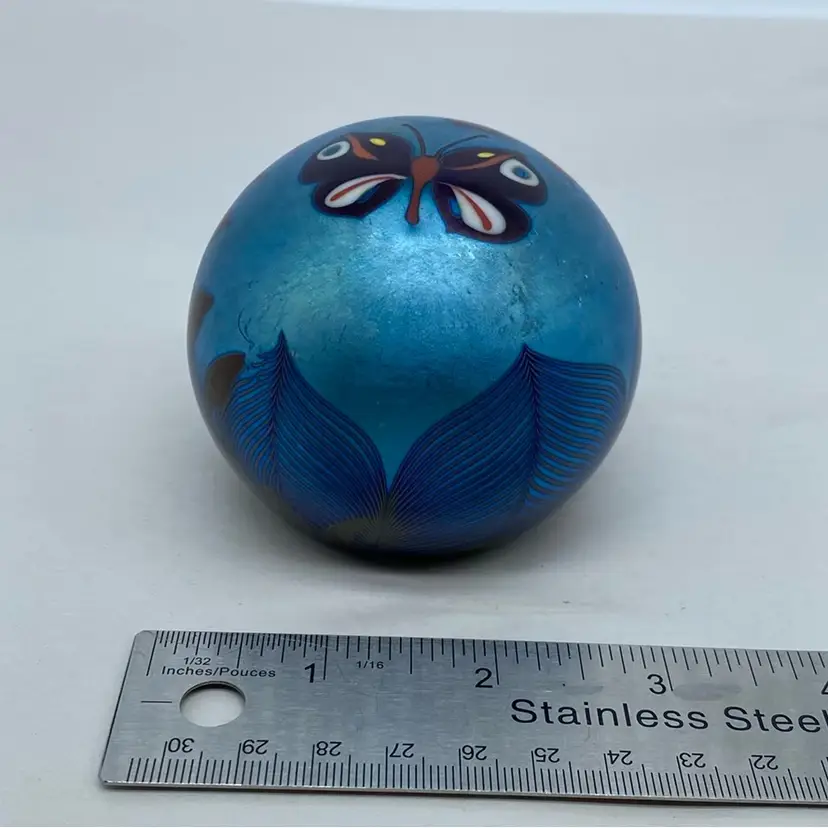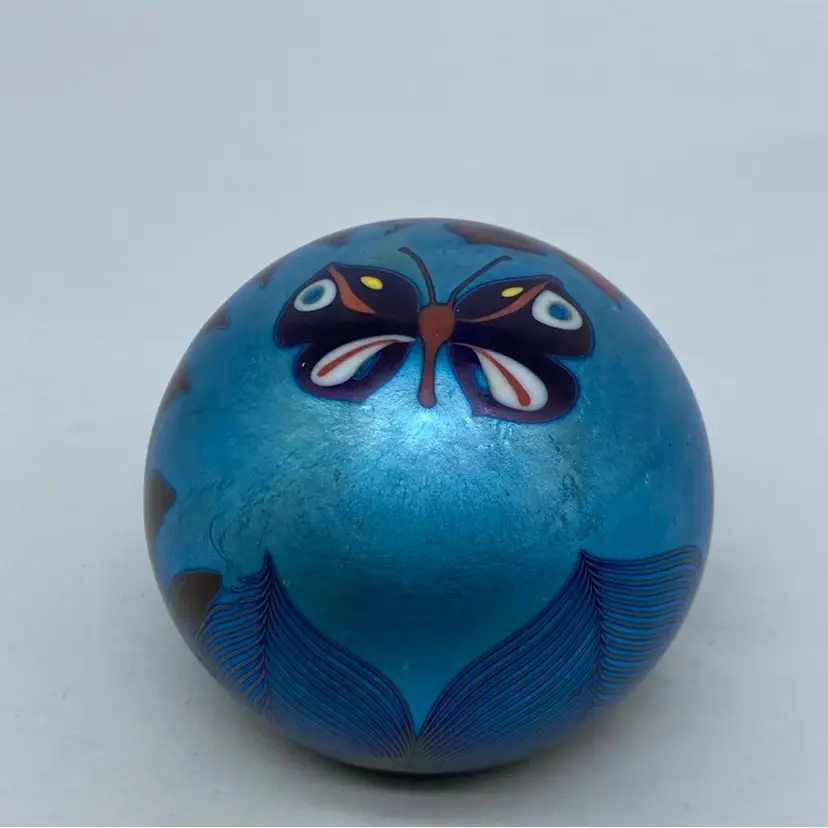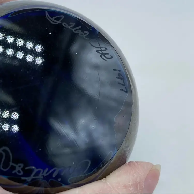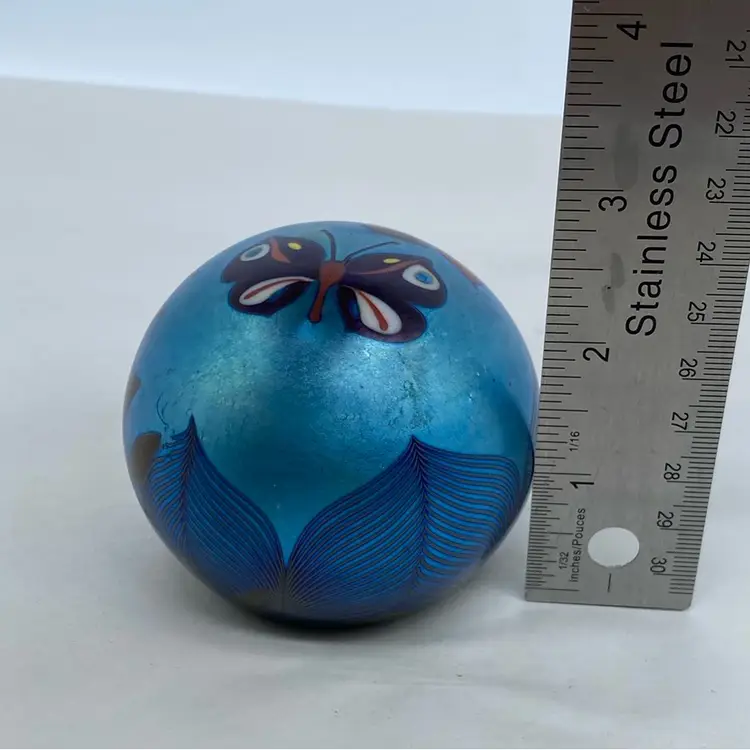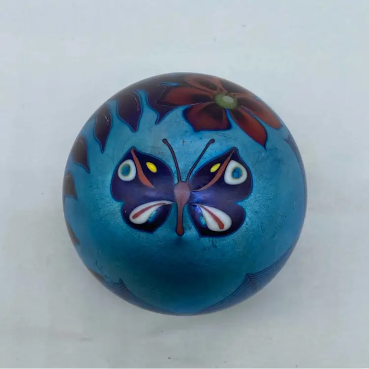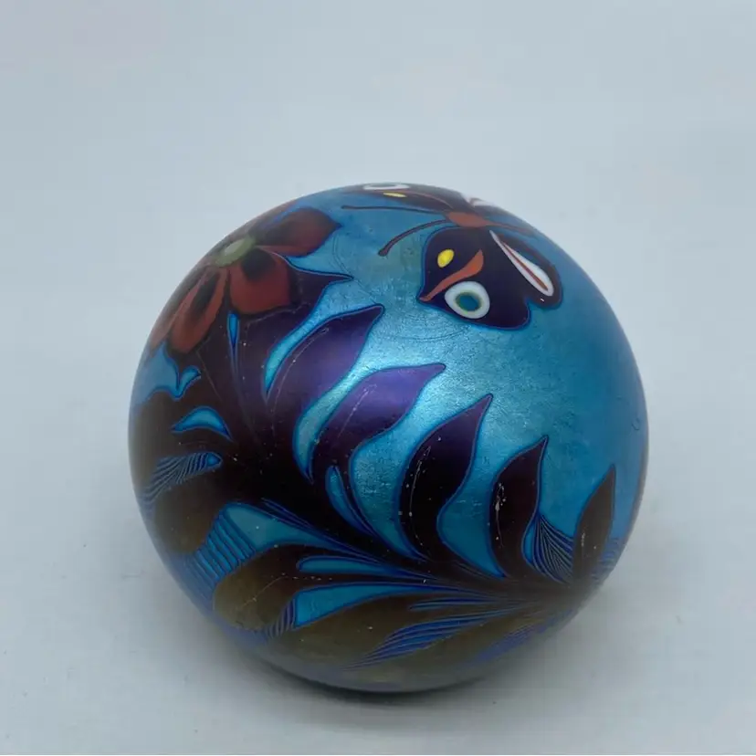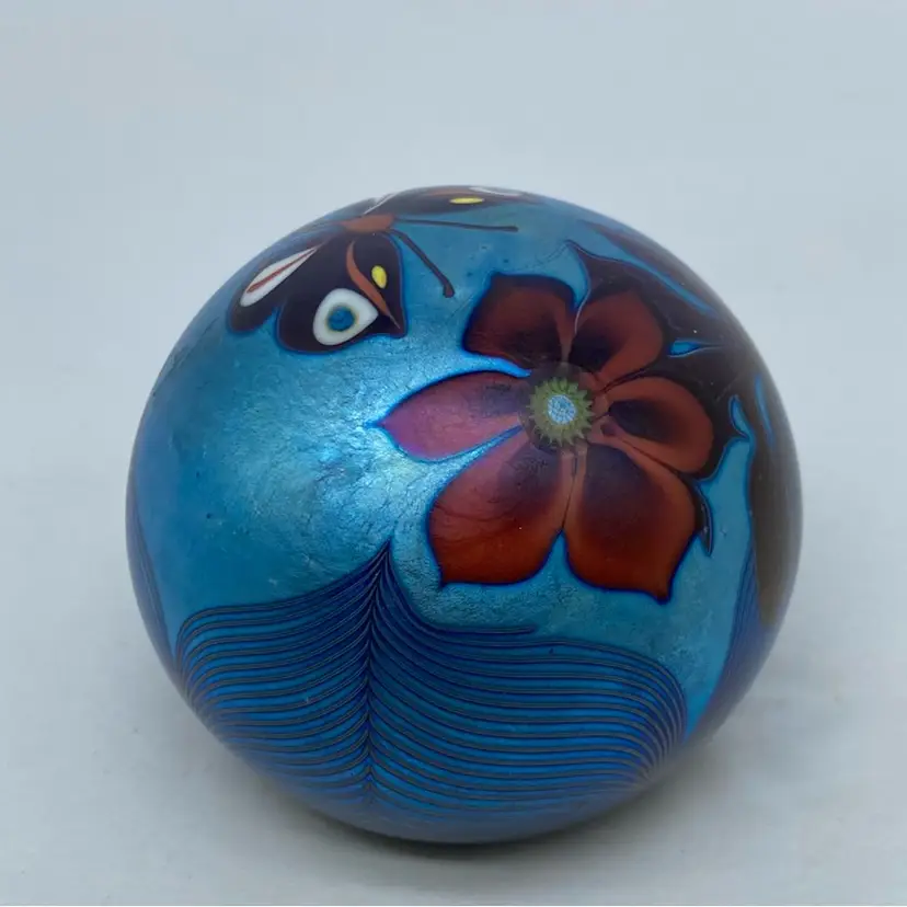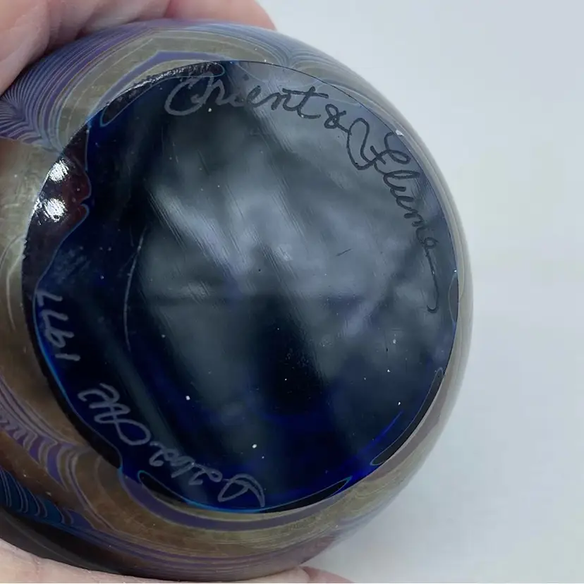 Good condition 3 x 3 inch approx. Orient & Flume Art Glass was founded in 1972 by David and Christine Hopper in Chico, California. The company quickly gained recognition for its innovative designs and high-quality craftsmanship, becoming a prominent name in the art glass world. Orient & Flume is particularly known for its paperweights, vases, and other decorative items that often feature intricate floral, marine, and abstract motifs.