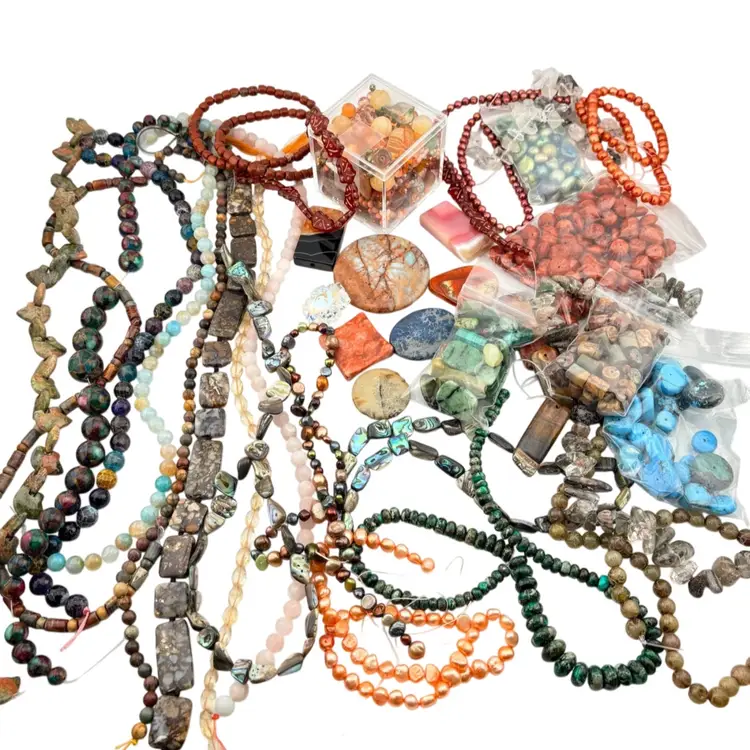 There are beautiful strands including abalone, turquoise a handmade necklace that has a gecko pendant and more.