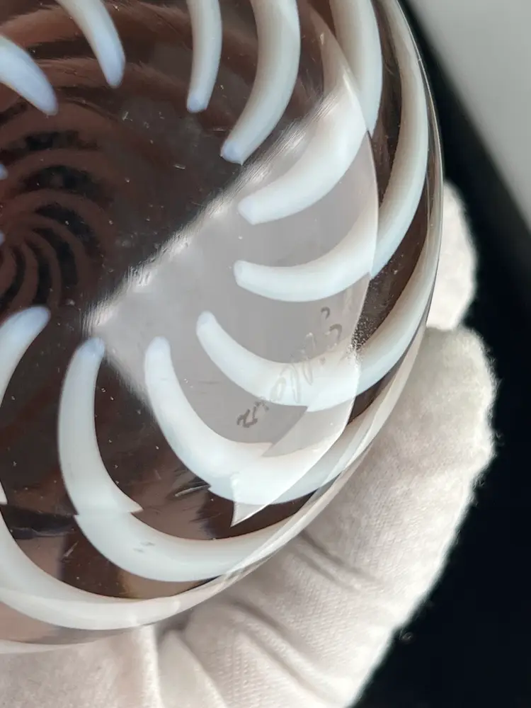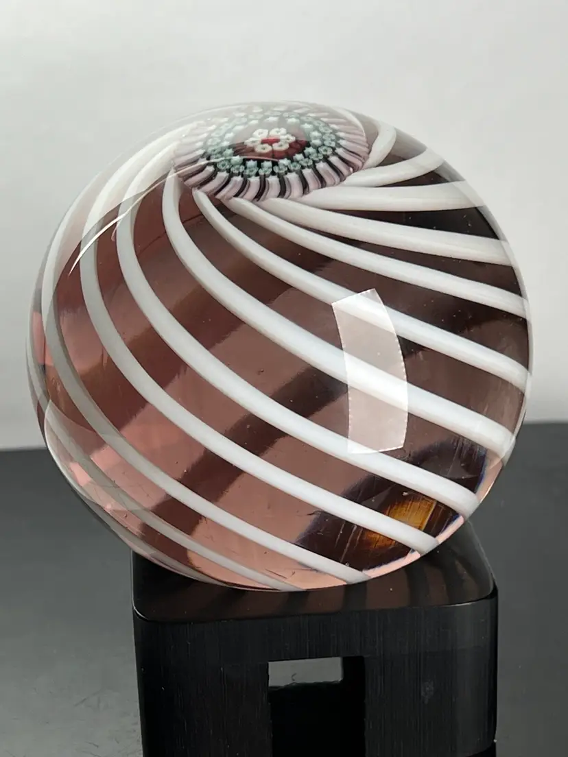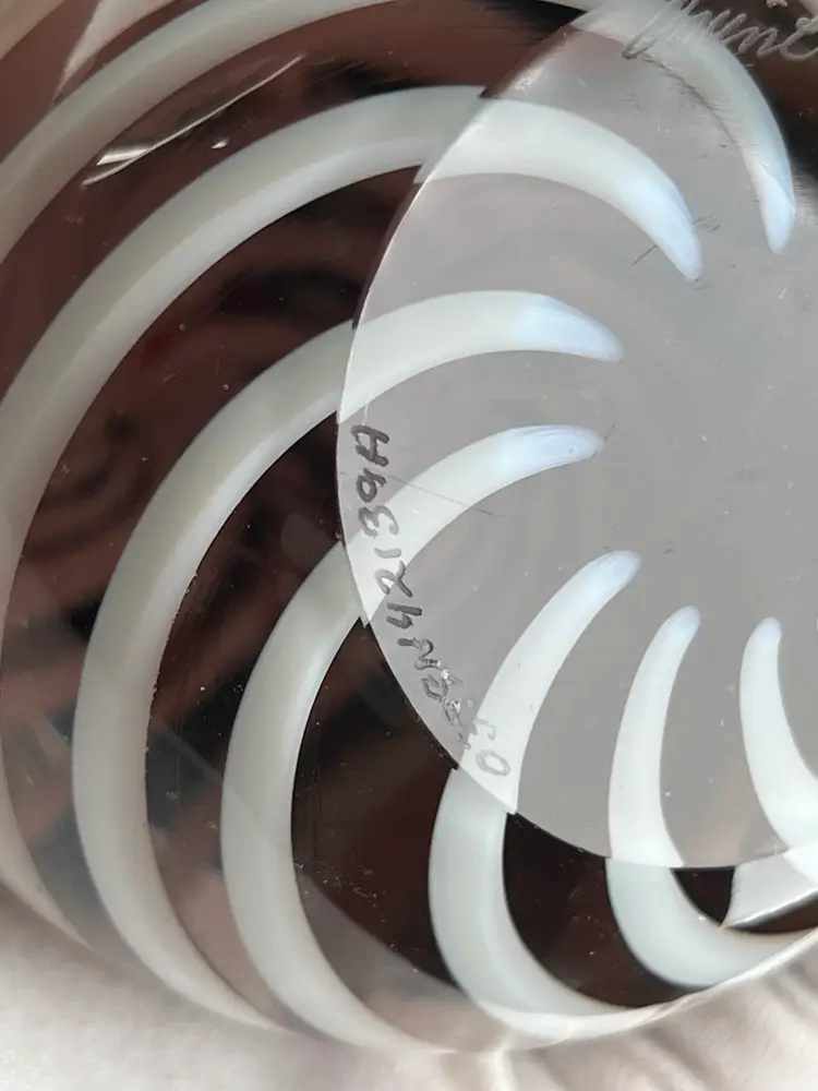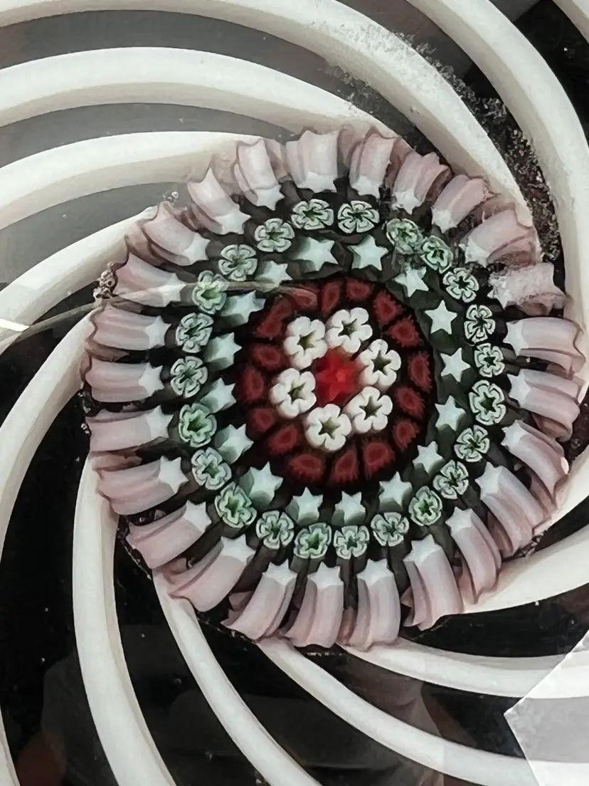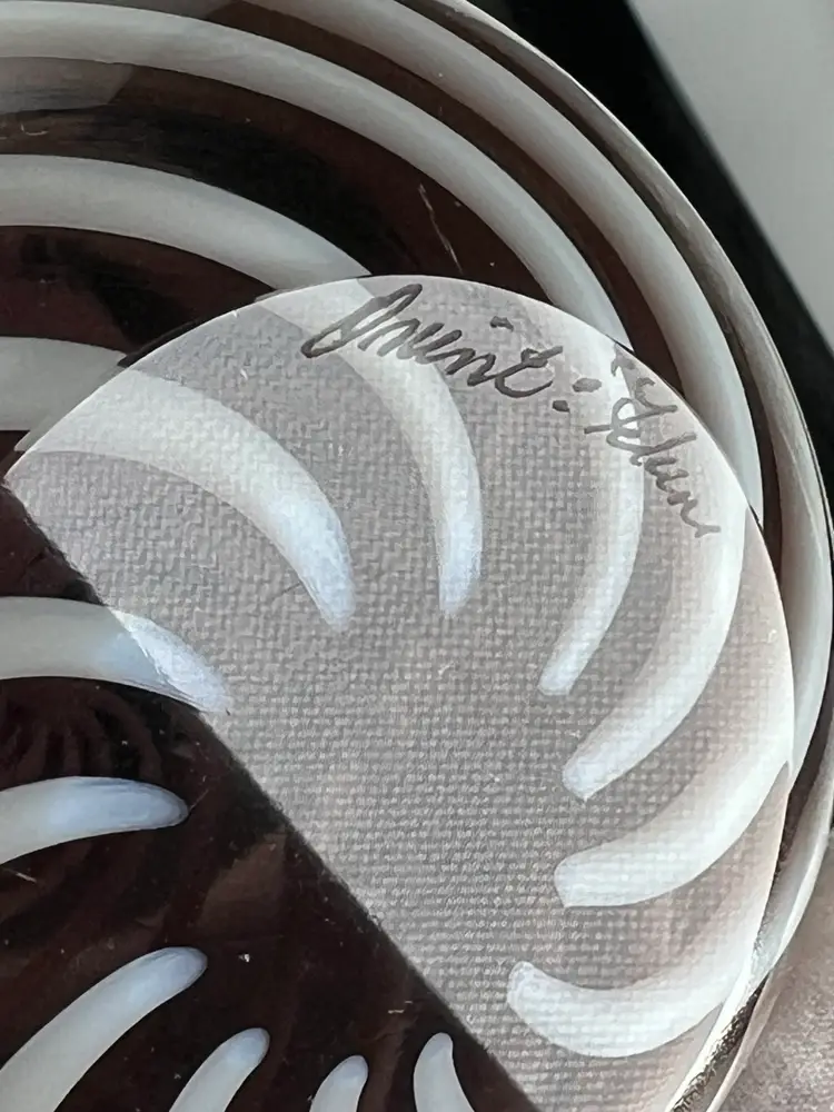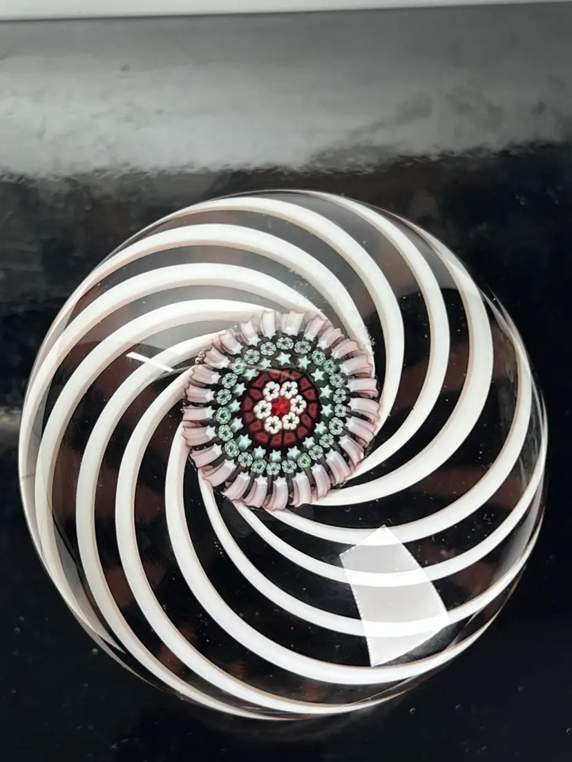 Beutiful large 3.5" spiral and cane millefiori Orient and Flume paperweight. Signed by Bruce Sillars and numbered. excellent condition.