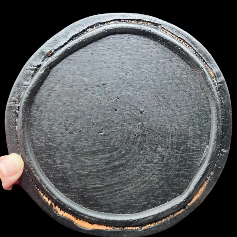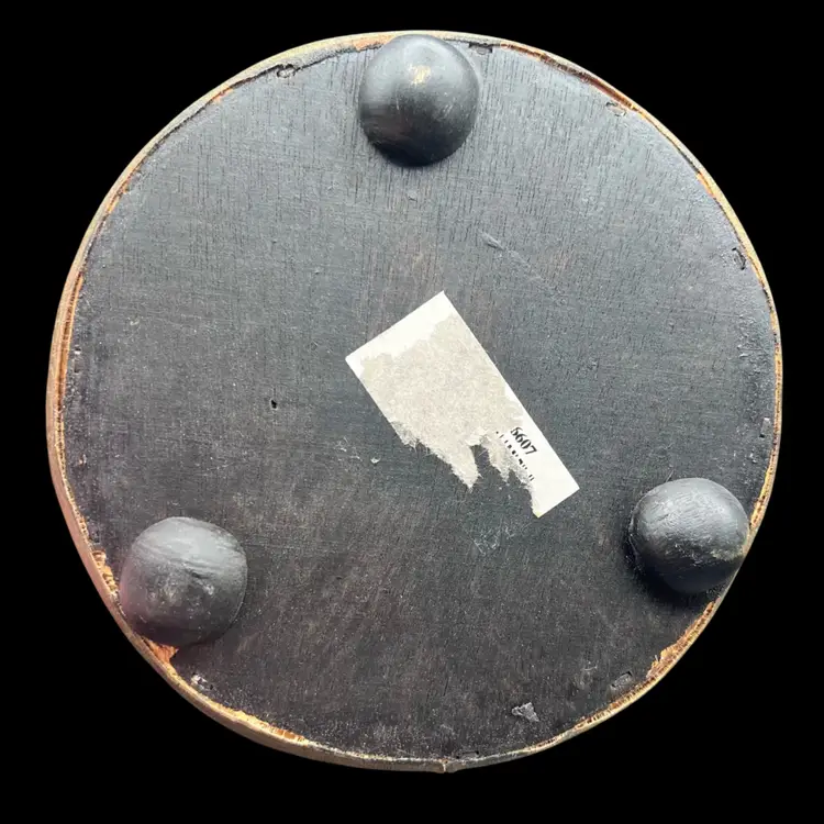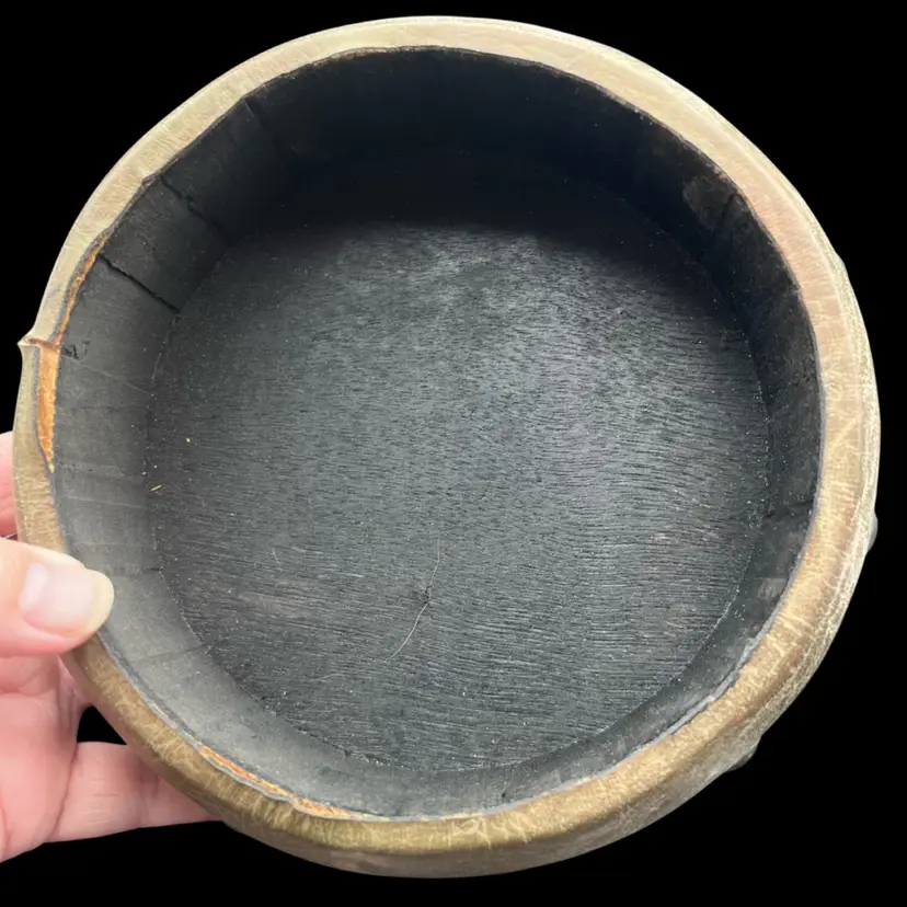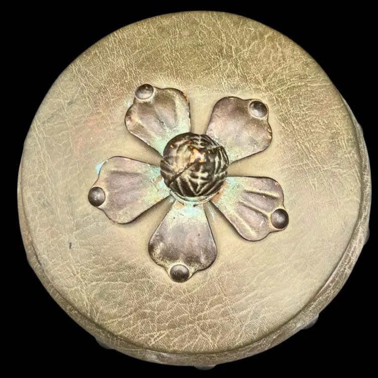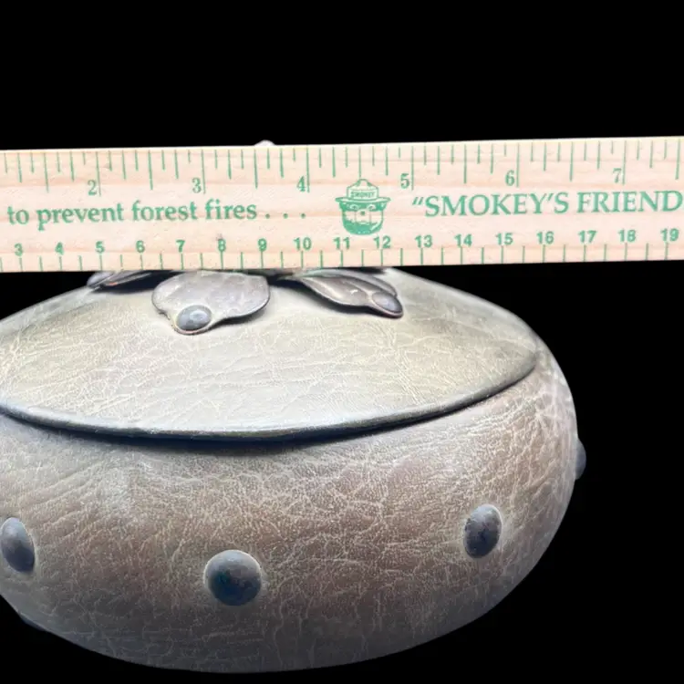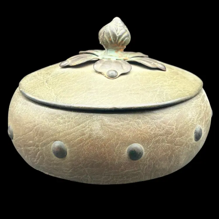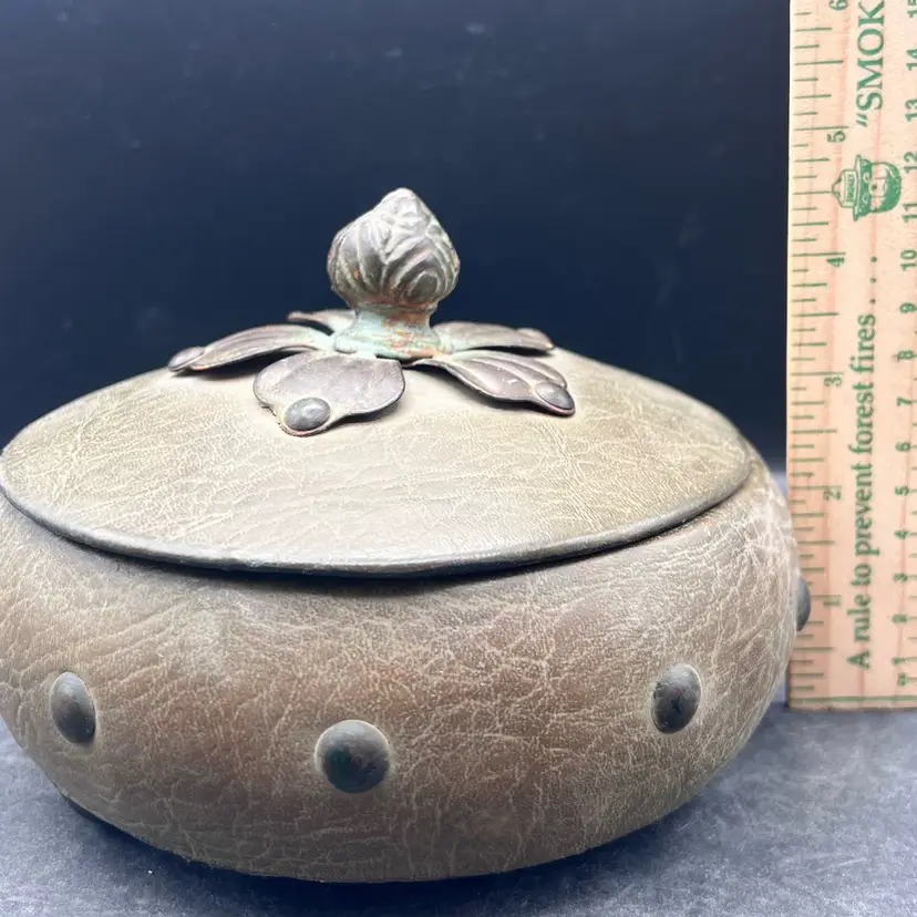 Vintage Wooden Trinket Box Featuring a Textured Leather Covering With Decorative Studs Around The Bowl and a Metal Floral Finial on the Lid and Three Ball Feet In very good condition, one spot on the rim the leather has come apart from the wood, this would be easy to fix. Overall about 5” tall x 7” in diameter