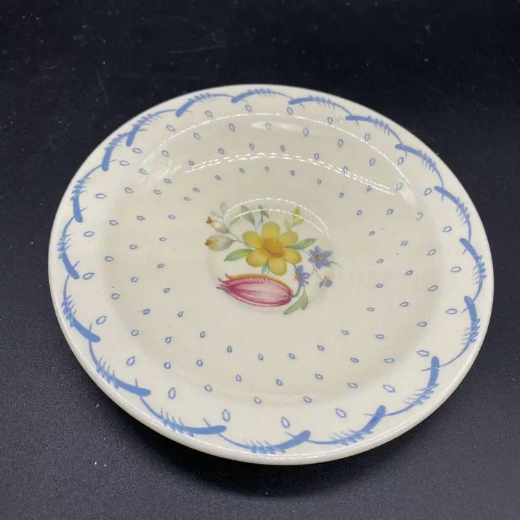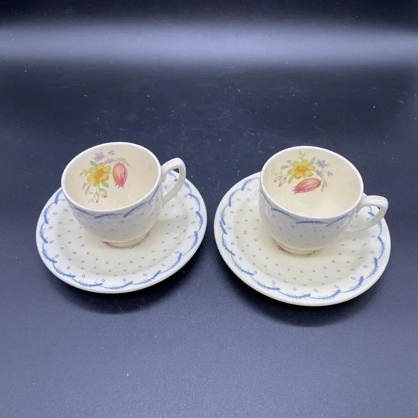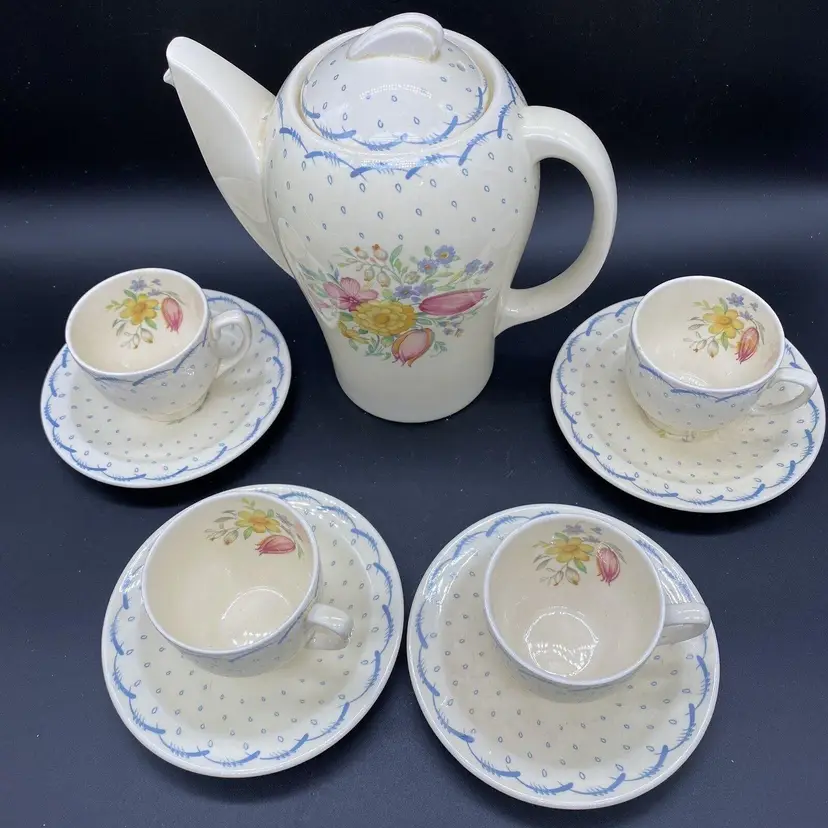 This is an exciting Susie Cooper, 9 piece set by one of Britain’s most re-known ceramicists and dinnerware designers. Pretty Floral and Blue line/dot Tea/Coffee set with kestrel pot, 4 demitasse cups and 4 saucers.