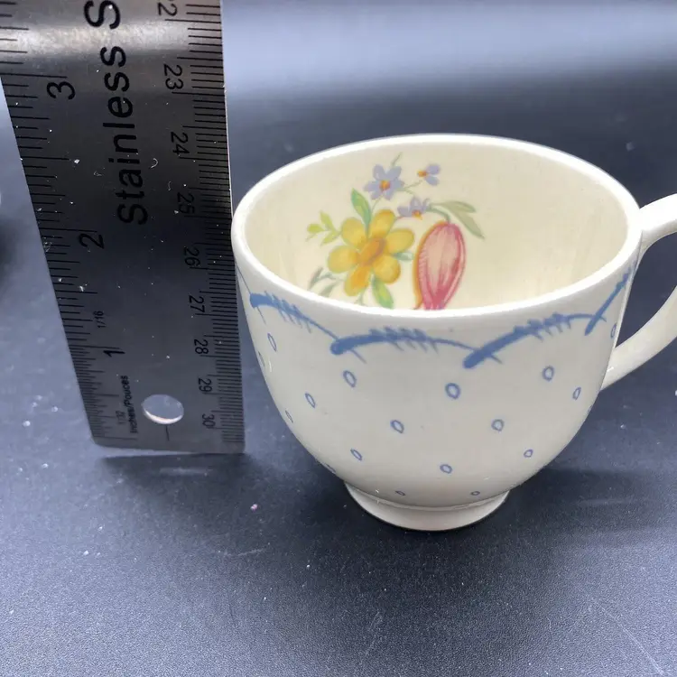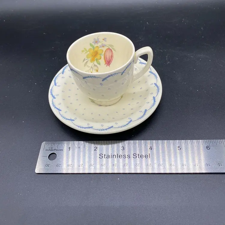 Measurements: Tea/coffee pot is 7 inch tall Demitasse cup 2 inch tall Saucer 4.75 inch diameter