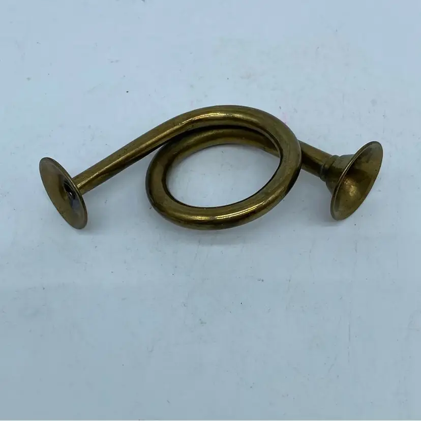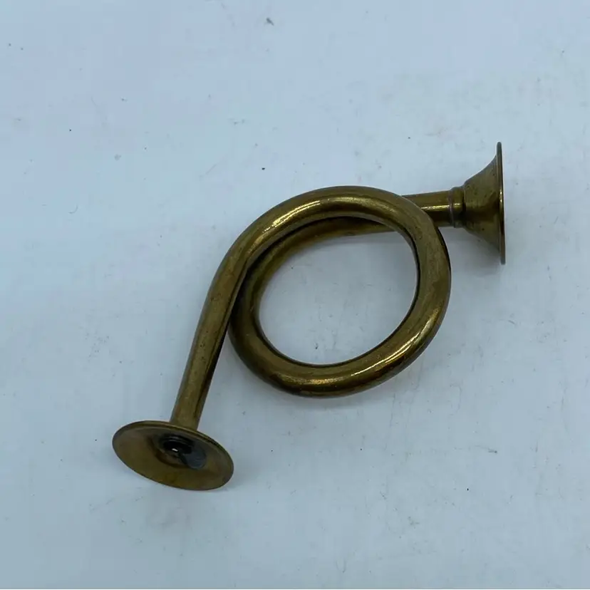 Miniature bugles, like the one in the image, often served as decorative items or souvenirs. They were popular gifts for military personnel or collectors of musical instruments. These smaller versions retain the iconic shape of the bugle but are not usually functional as musical instruments. The craftsmanship and materials used in these miniature bugles can vary, with some being made of solid brass and others of plated metal.