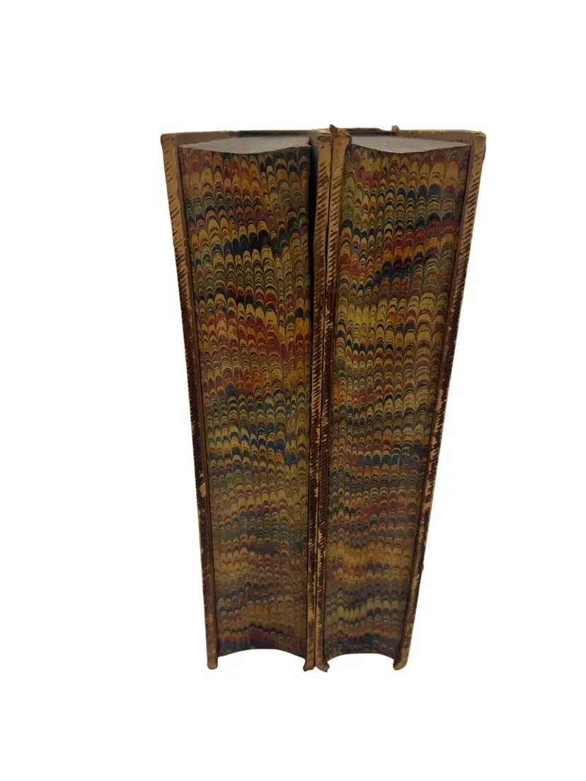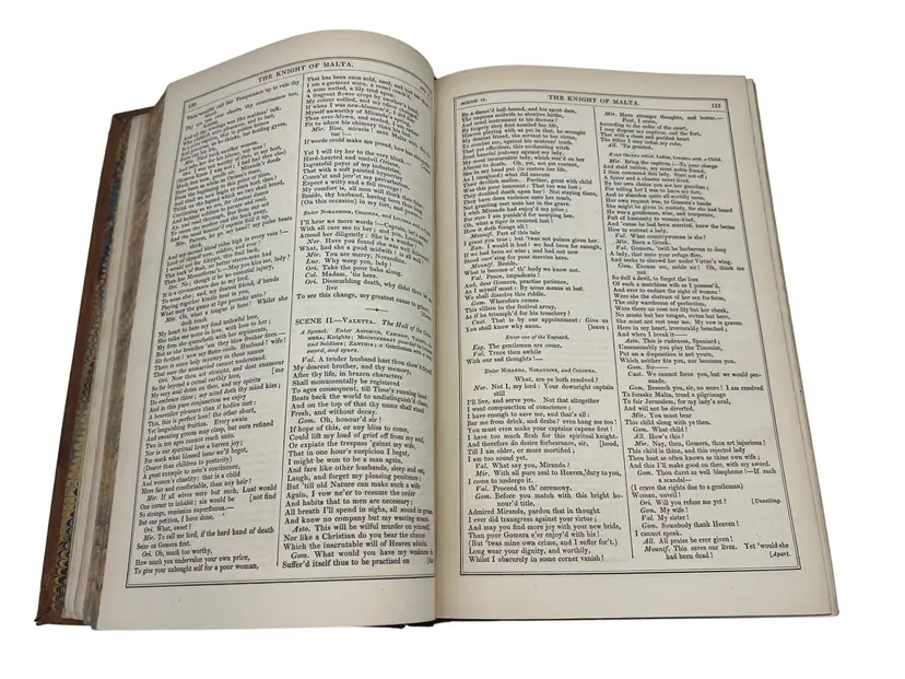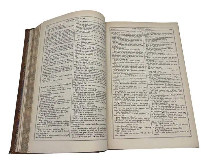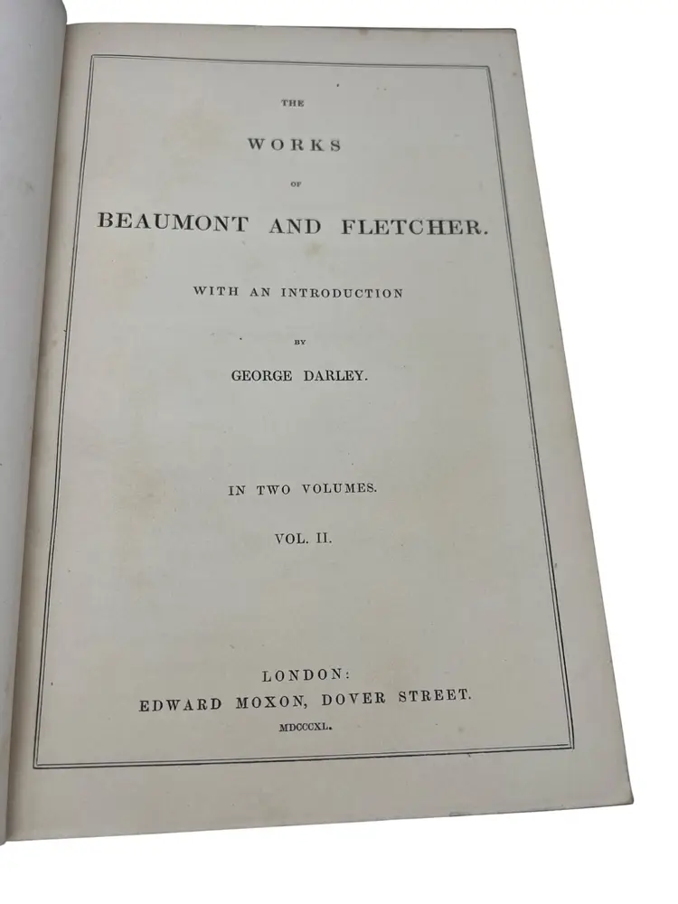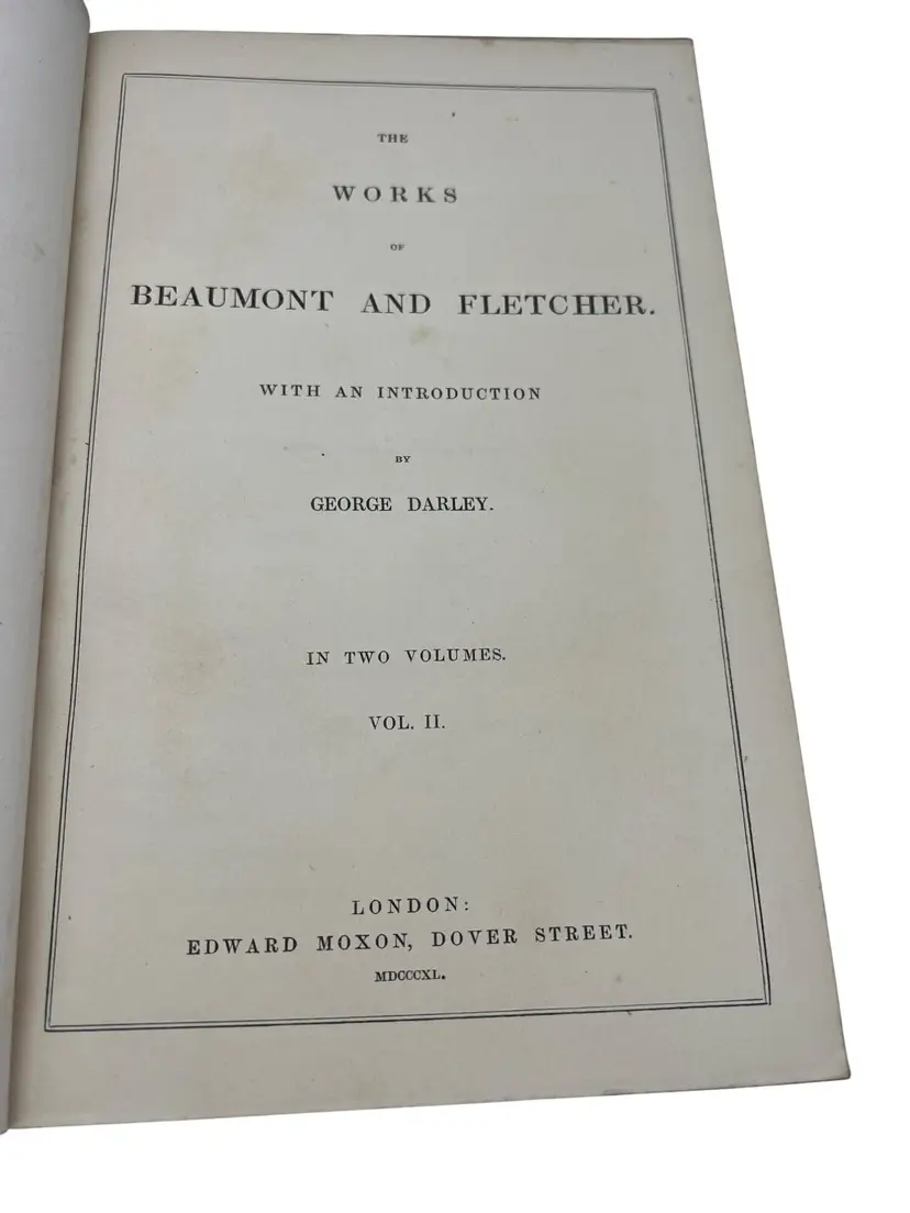 Two-volume 1840 Edward Moxon edition of The Works of Beaumont and Fletcher (intro. George Darley). Octavo, each about 9.5" x 6". Leather bound with gilt spines and red labels; marbled edges and endpapers; engraved portrait frontispieces and engraved general titles (dated 1839), with printed volume title pages 1840. Classic collected plays of the Jacobean collaborators—attractive shelf presence and a nice Victorian printing.