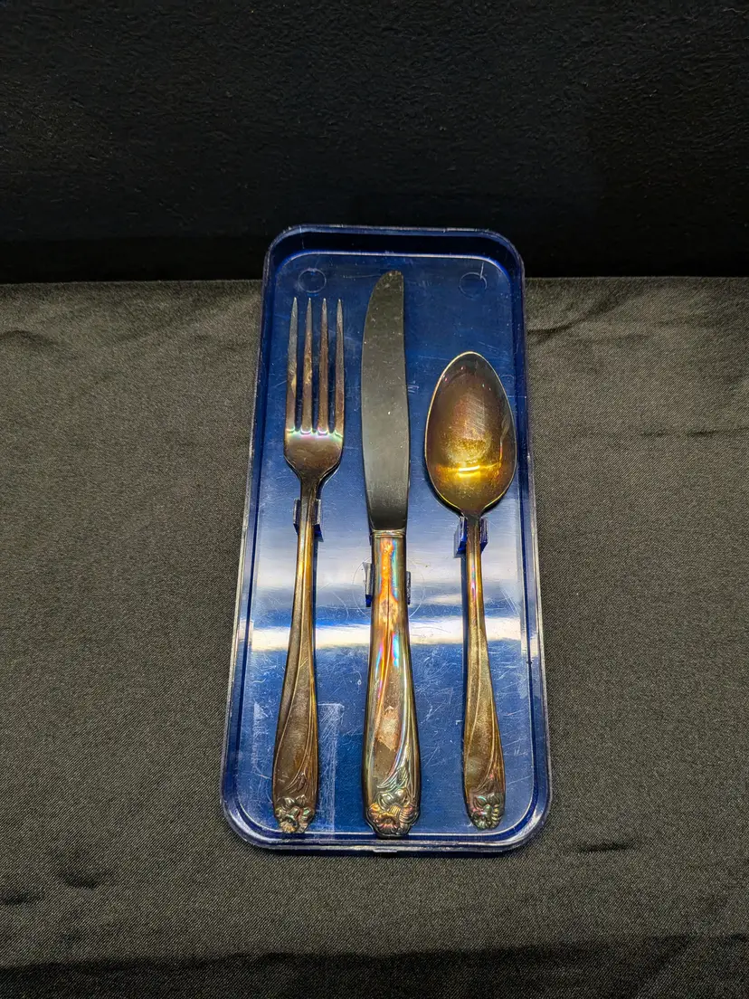 Vintage 1847 Rogers Bros silverplate flatware set, presented in its original case. The set includes knife, fork, and spoon pieces in matching pattern (see photos). While the silverware is plated (not sterling), it is well-preserved with moderate surface wear consistent with its age.