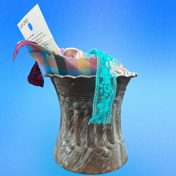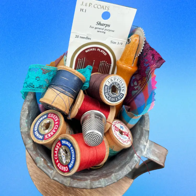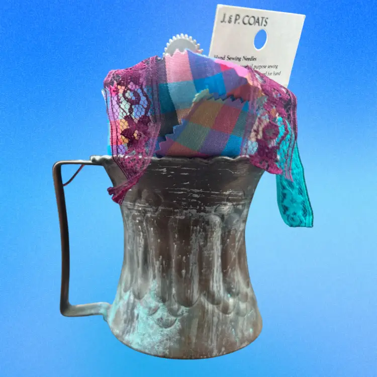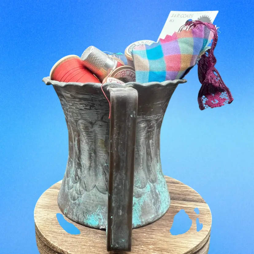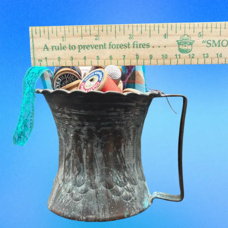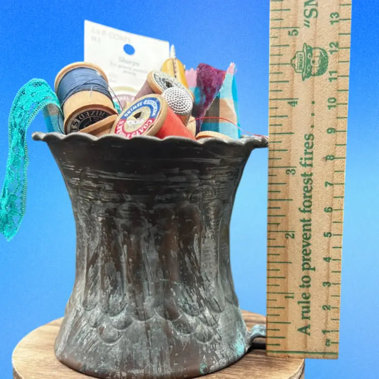 Vintage Hammered Copper Mug Etched Tin Cup Filled With Vintage Sewing Notions. Spools Of Thread, Lace Remnant, A Thimble, Pack Of Needles, And A Pattern Tracing Tool Cup measures 3 1/2” wide x 3 1/2” in diameter Made in UAE/Middle East