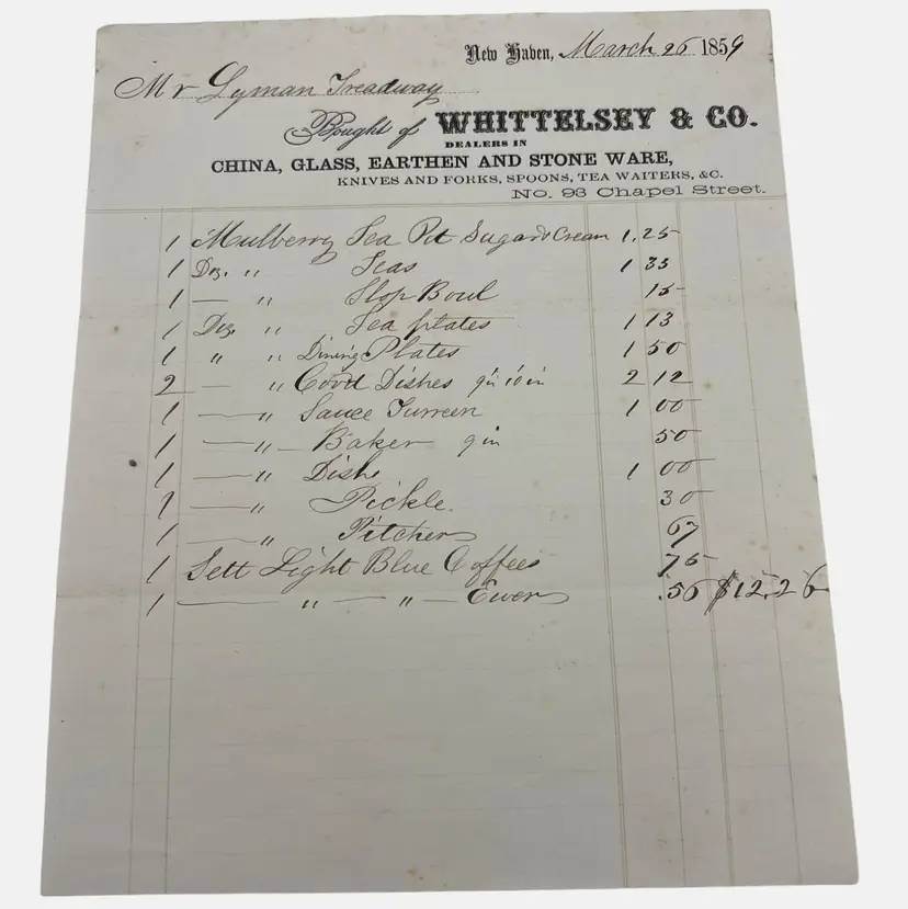 This original 1859 billhead from Whittelsey & Co. is 165 years old and details a purchase of various china, glass, earthen, and stone ware items. Ideal for collectors or historical archives. It is dated March 26, 1859 and contains a list of the items purchased including a sugar & creamer, tea plates, dining plates, covered dishes, and more.