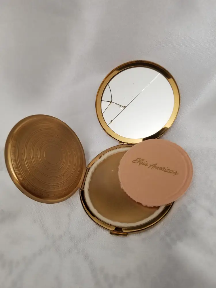 Vintage Elgin American Compact is 3" wide. Mirror Broken, doesn't close. As is.