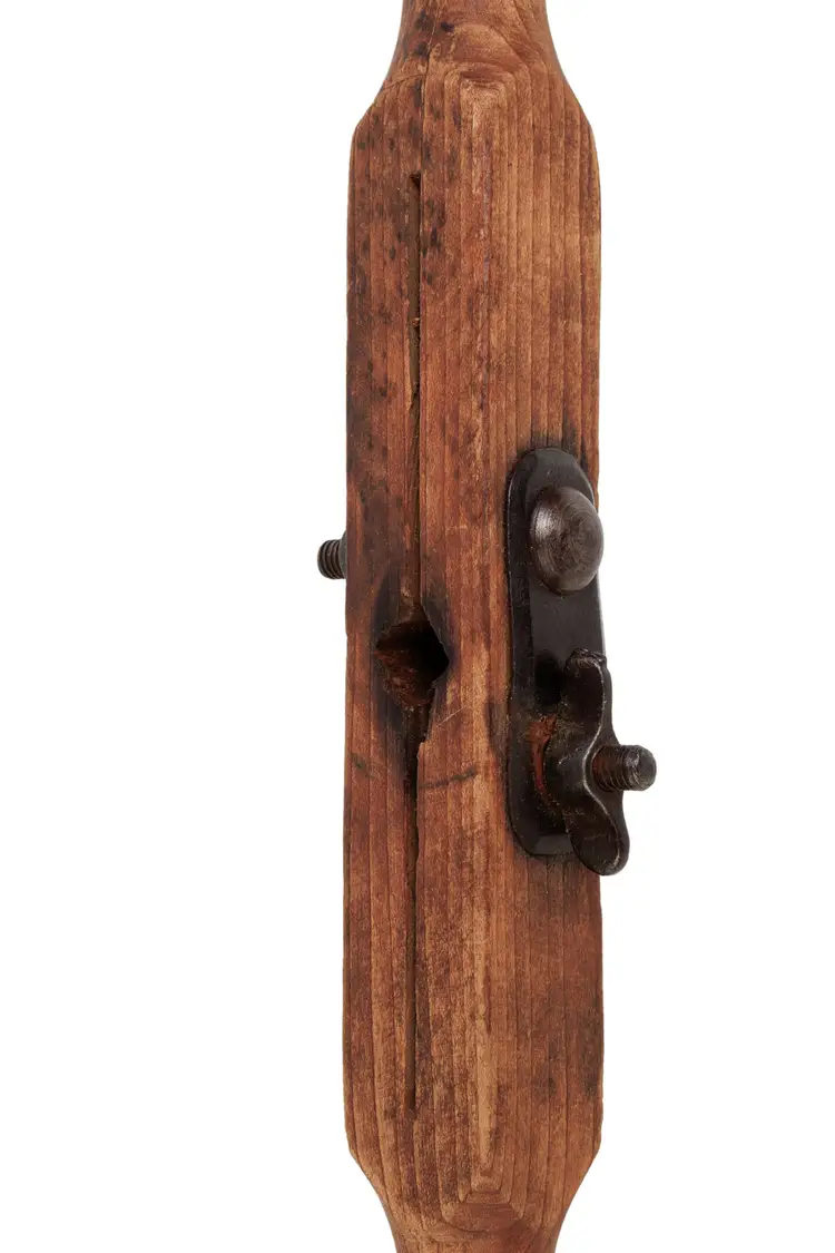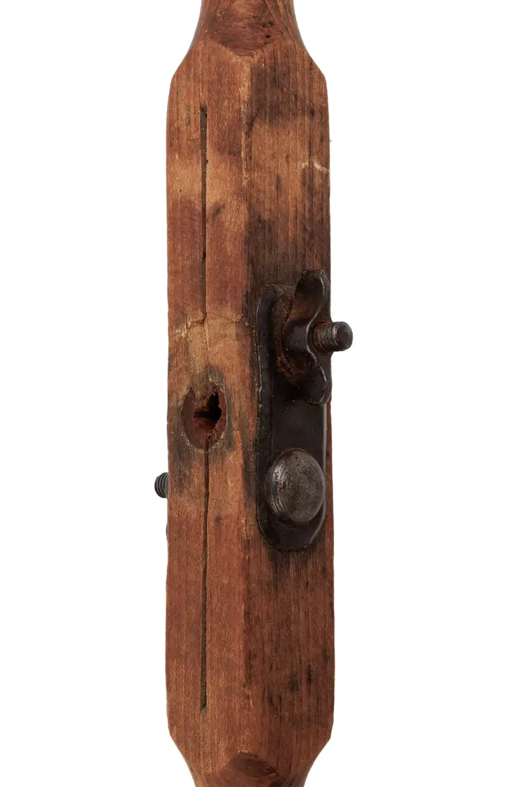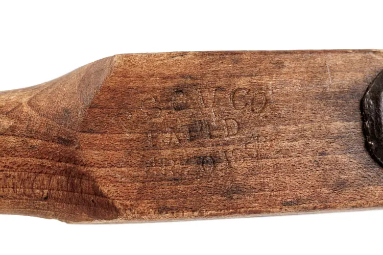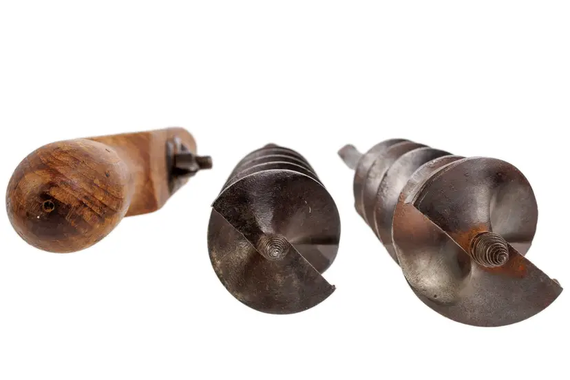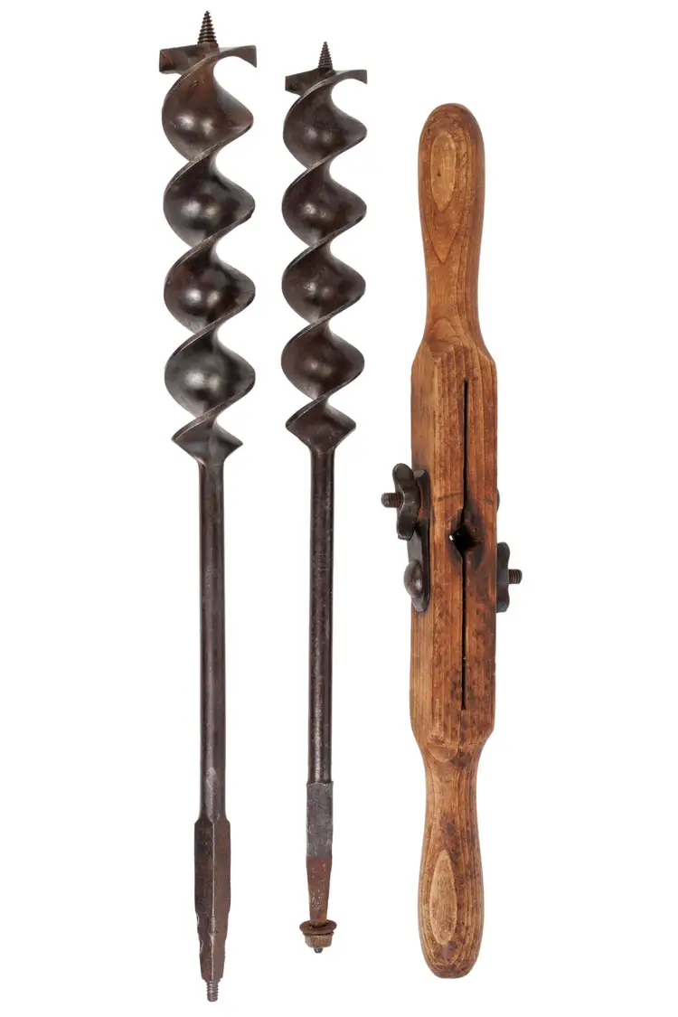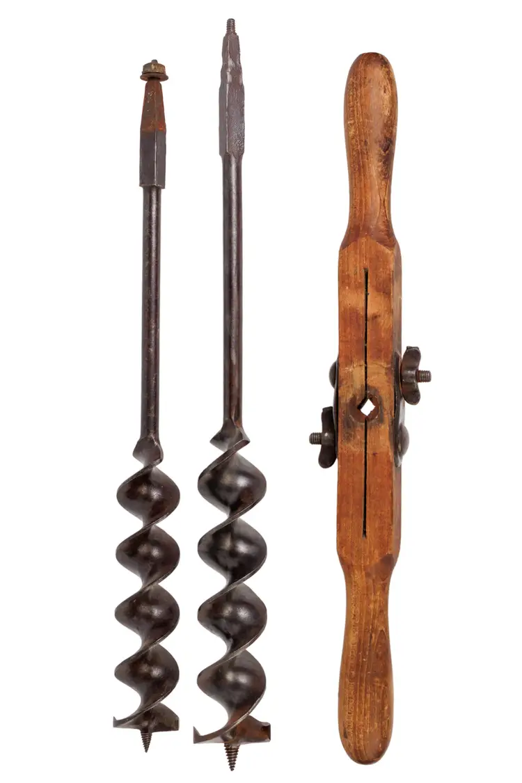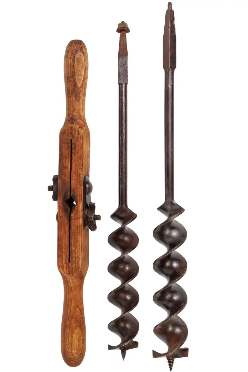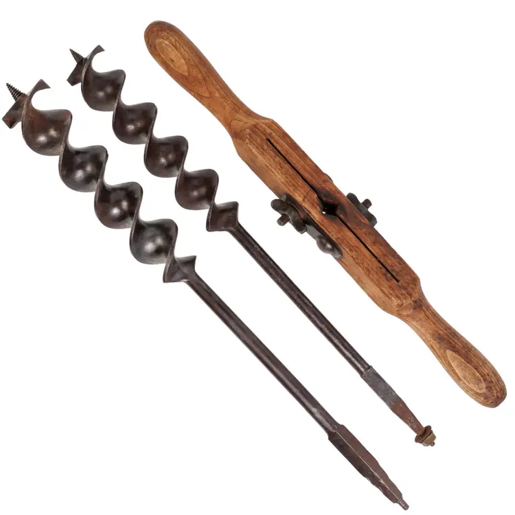 A nice 1883 patent P.S.&W. T auger handle with 2 auger bits. These auger bits are designed to work with this handle. One auger is stamped Wedgeway Warranted on the shaft and is 1-3/4" in diameter. The other is stamped Superior Cast Steel and is 2" in diameter. Both augers are just under 20" long. The handle works perfectly and is 18" long with a fairly nice and readible maker stamp on it, reading "P.S.&W. CO. Pat'ed Mar 20 1888". Both augers are free of any damage, but they will likely need sharpened for use.