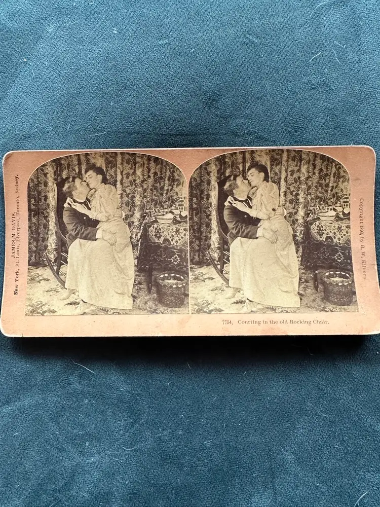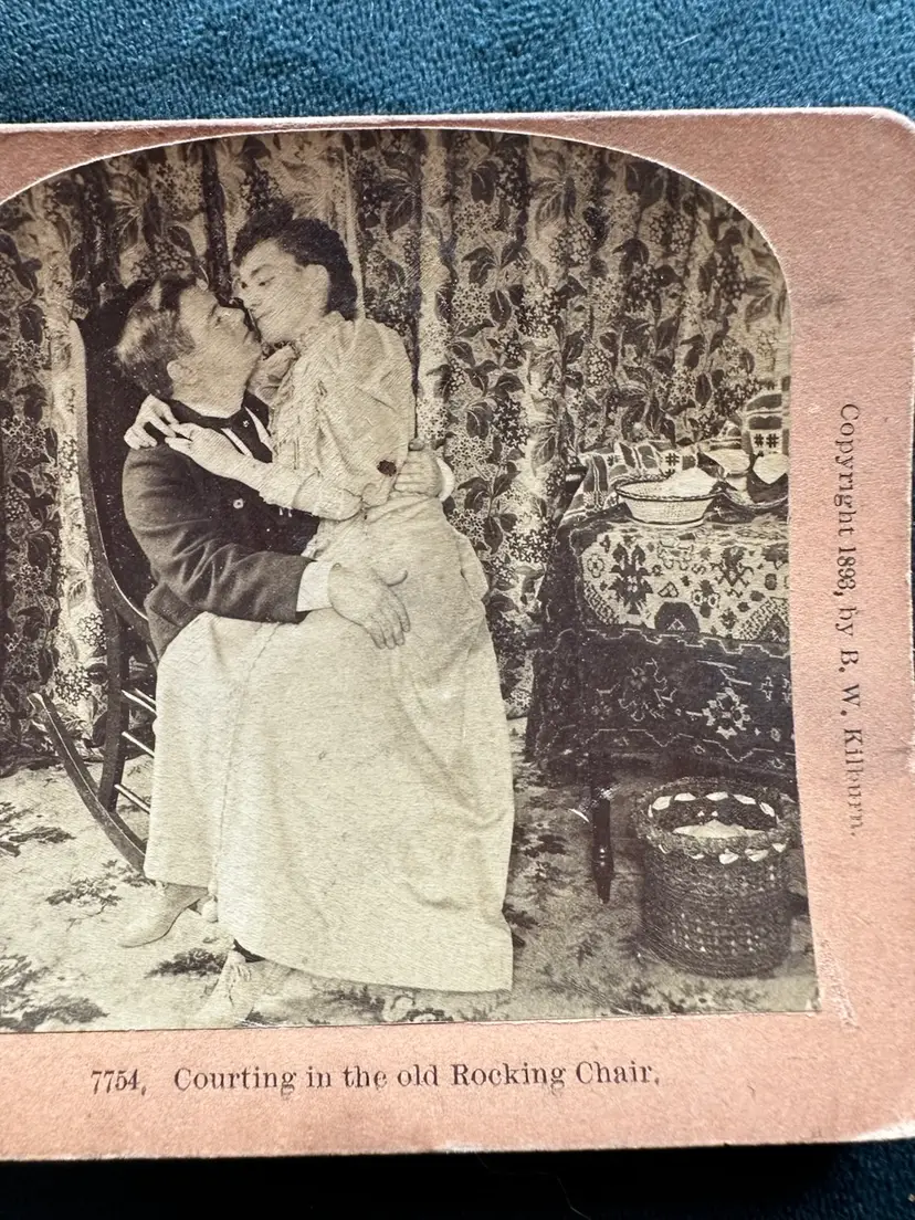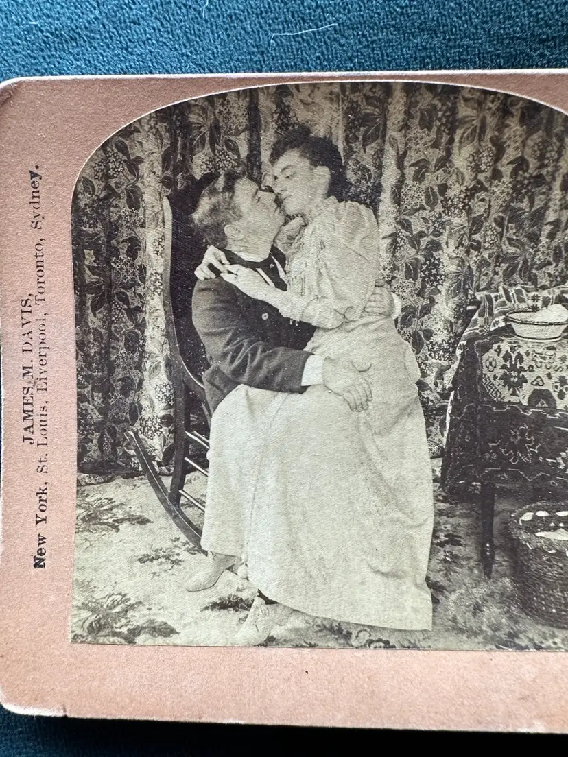 Features a Victorian couple kissing. Copyrighted in 1893, by B. W. Kilburn manufactured by James M Davis.