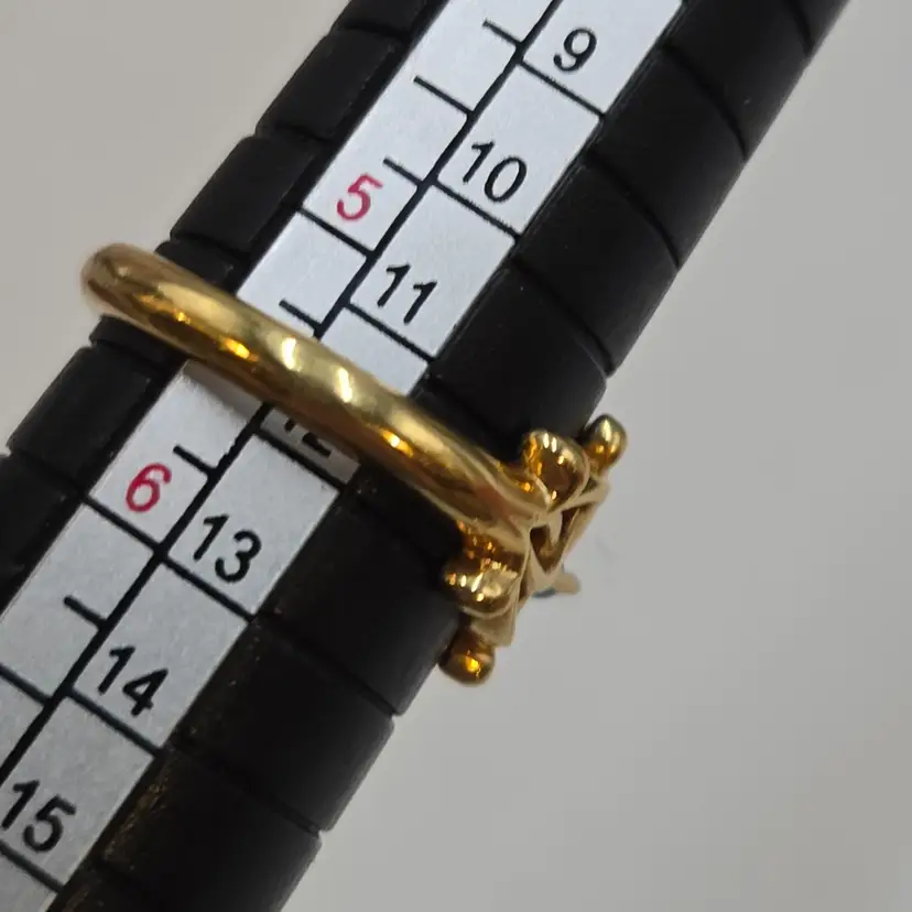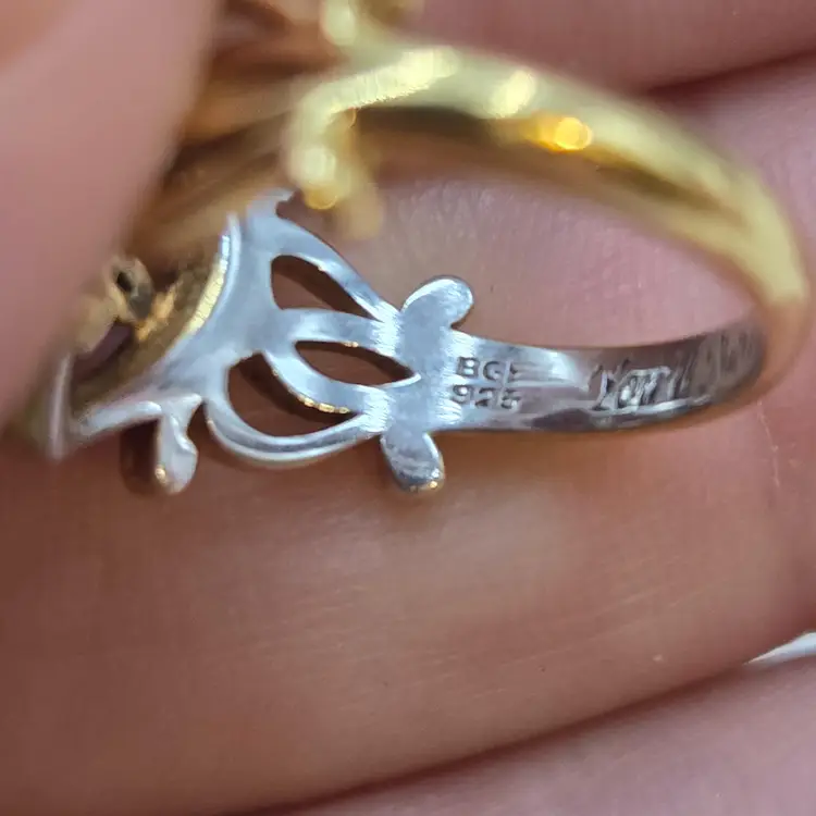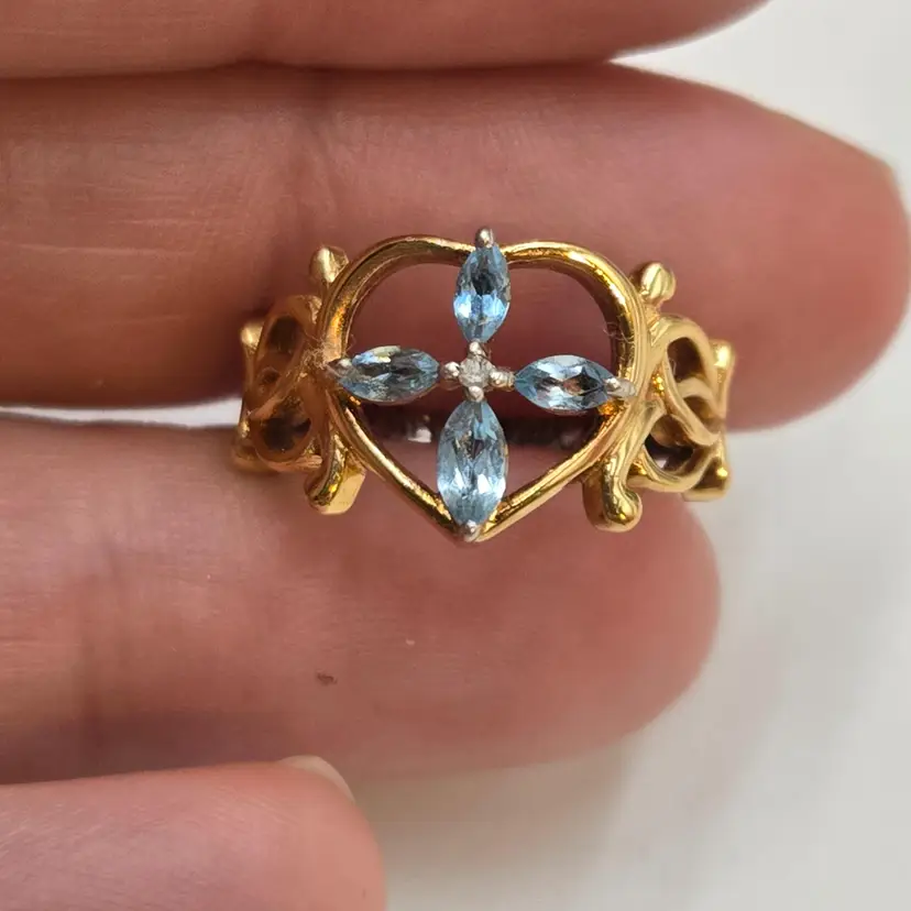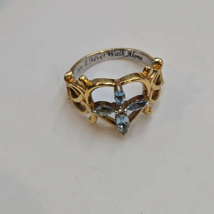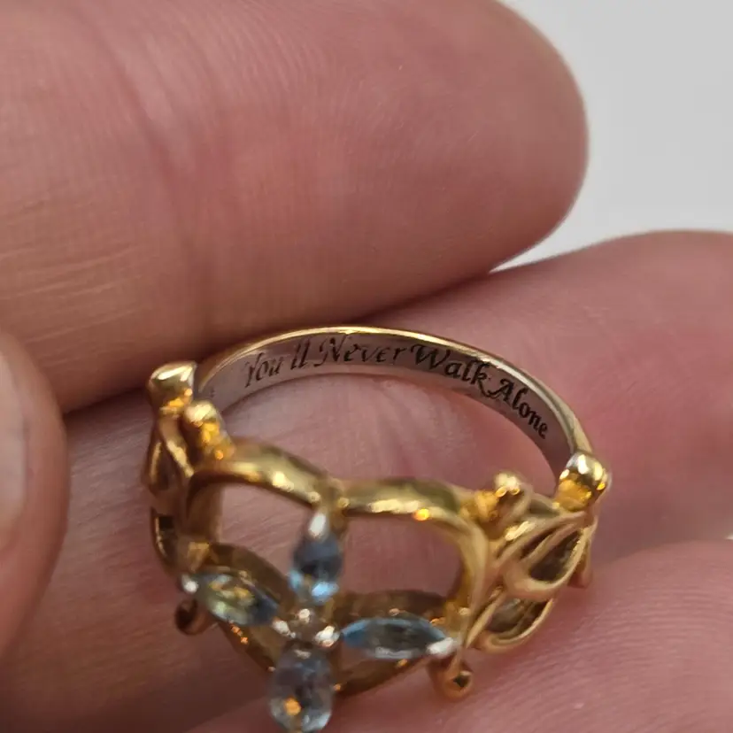 "When you saw only one set of footprints, it was then that I carried you." These meaningful words serve as a beautiful blessing and a reminder that even in hard times the Lord will always be by your side and in your heart. This elegant jewelry creation has been inspired by your love of God and the beloved Footprints in the Sand poem. Introducing the You'll Never Walk Alone Topaz and Diamond Ring. Exquisitely handcrafted in solid sterling silver and plated in rich 18K gold, this bold religious jewelry design captures the beauty of your Christian faith and it also makes a thoughtful religious gift. In excellent condition. Very little signs of wear from use. Please see pictures for more details.