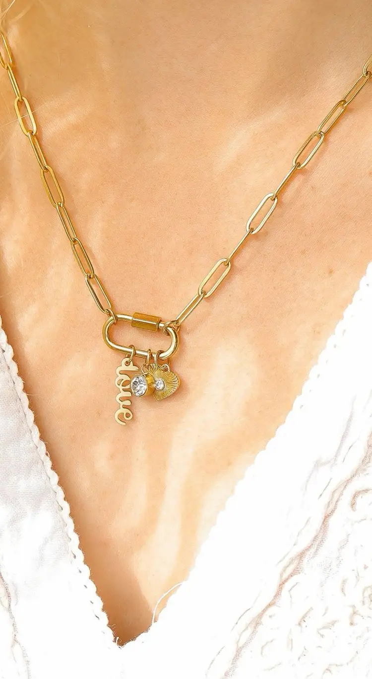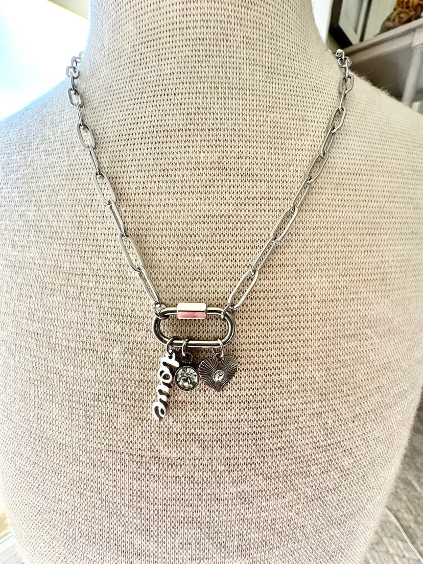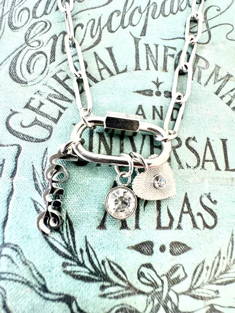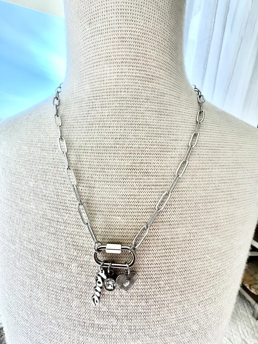 What is the most stylish way to wear the charm necklace trend? Wear perfectly curated Stainless Steel Love Charms on a Carabiner Charm Keeper. The charm keeper is featured on an 18" paperclip chain. This charm necklace includes a love script charm, a bezel set clear stone, and a sunburst heart charm with a clear stone at the center. The carabiner charm keeper is functional so you can add or take off charms to create your own look. Available in both Stainless Steel and 18K Gold over Stainless Steel.