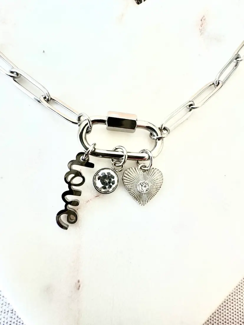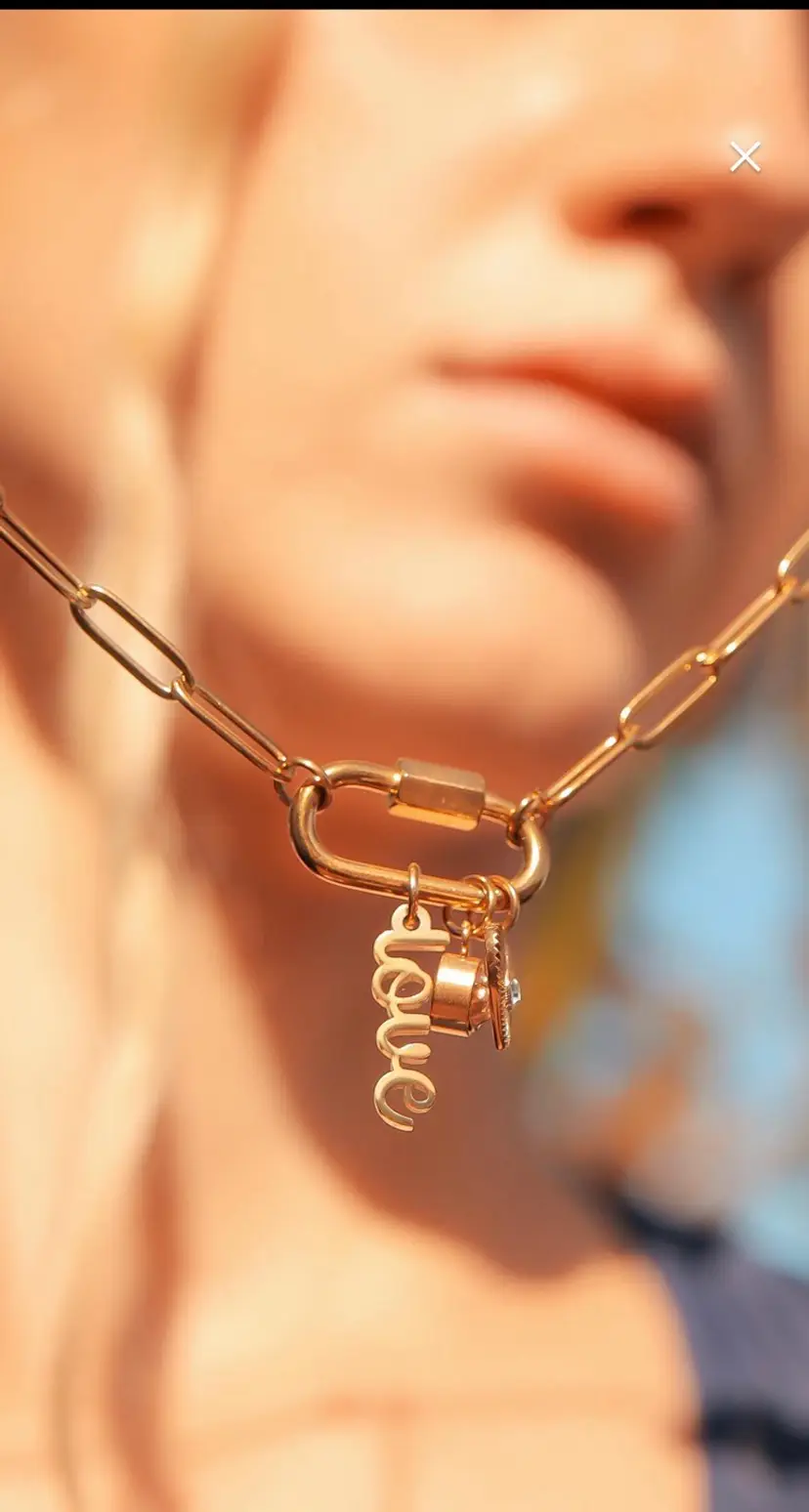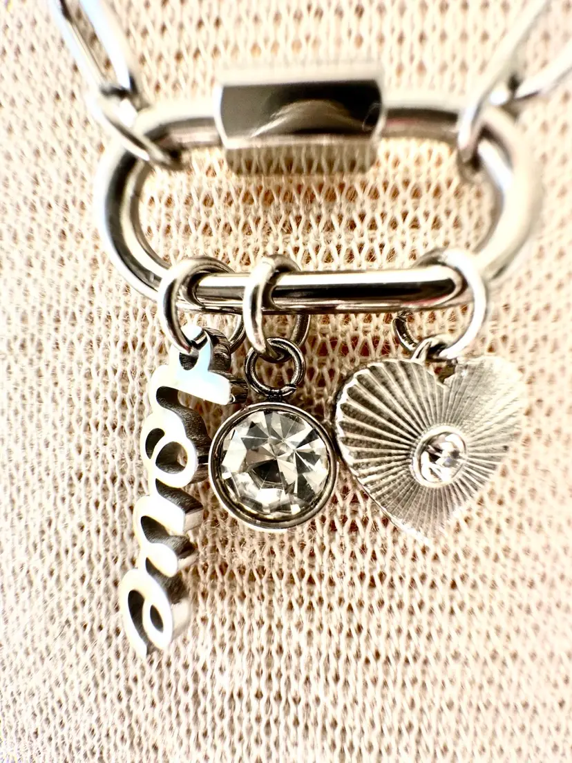 What is the most stylish way to wear the charm necklace trend? Wear perfectly curated Stainless Steel Love Charms on a Carabiner Charm Keeper. The charm keeper is featured on an 18" paperclip chain. This charm necklace includes a love script charm, a bezel set clear stone, and a sunburst heart charm with a clear stone at the center. The carabiner charm keeper is functional so you can add or take off charms to create your own look. Available in both Stainless Steel and 18K Gold over Stainless Steel.
