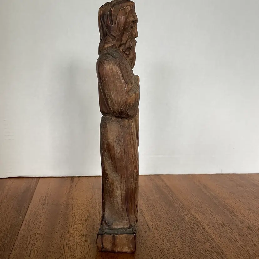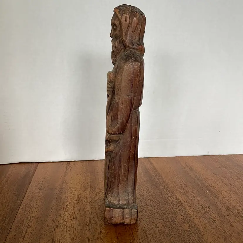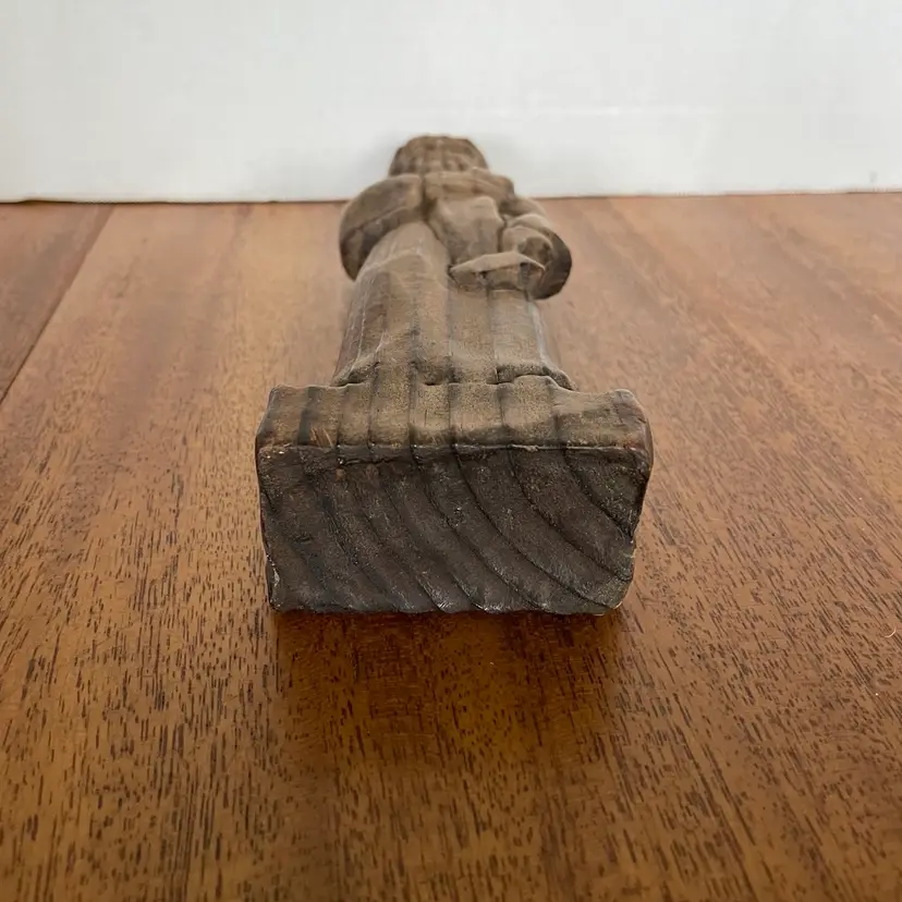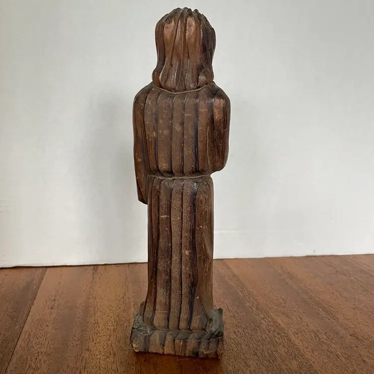 This stunning 18th-century Spanish Colonial hand-carved wood folk art Santos alter figure stands at an unusual 10 inches tall and is shown holding a scroll. Crafted with intricate details, this figure depicts a saint in a beautiful and unique way. Made from indigenous wood and handmade with care, this piece is a coveted treasure for any collector of antique folk art. The figure is perfect for display in a church, home, or office, and assured to be a conversation starter. No box. Ships insured via USPS priority mail.