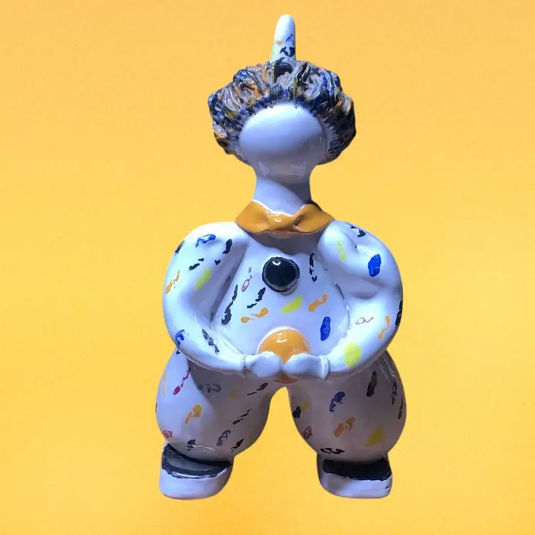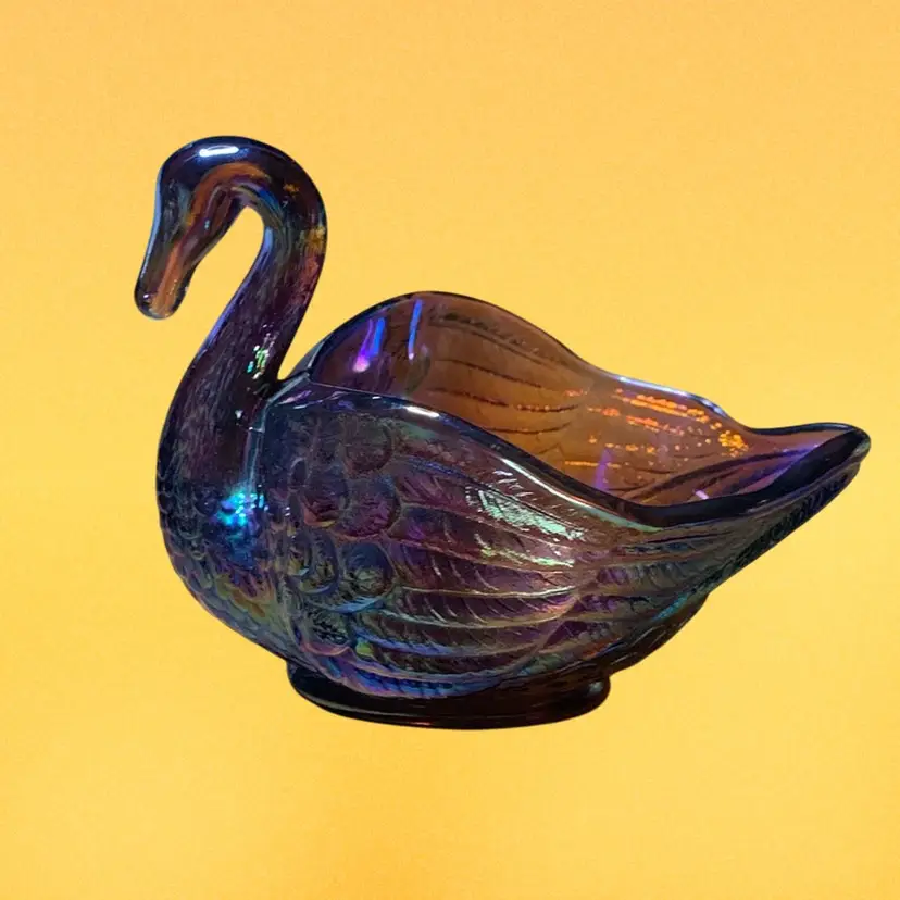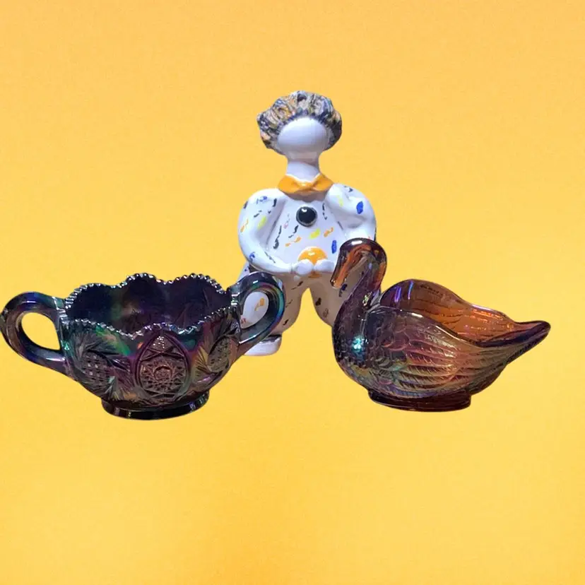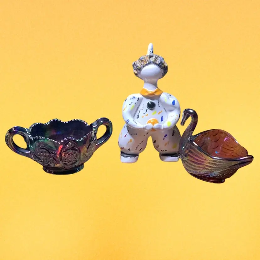 Set include one pottery, signed clown, one carnival Swan, and one carnival glass finger dish