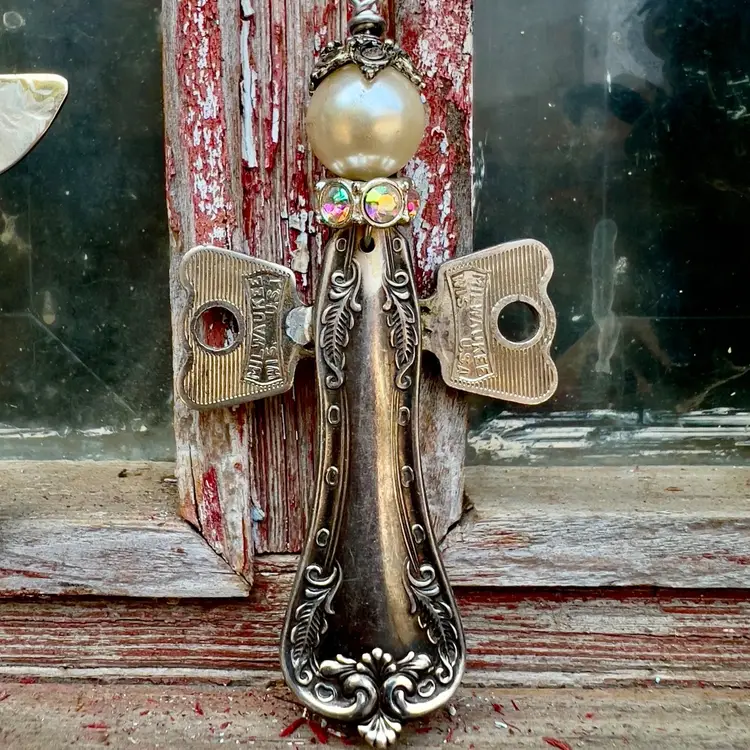 This Spoon Angel is made from repurposed materials that have been soldered on or wired. It can be used as a necklace, car charm, ornament or whatever you desire. Measures - 3.5” x 1.75” Ball chain is - 30” but can be cut with scissors to make it shorter.